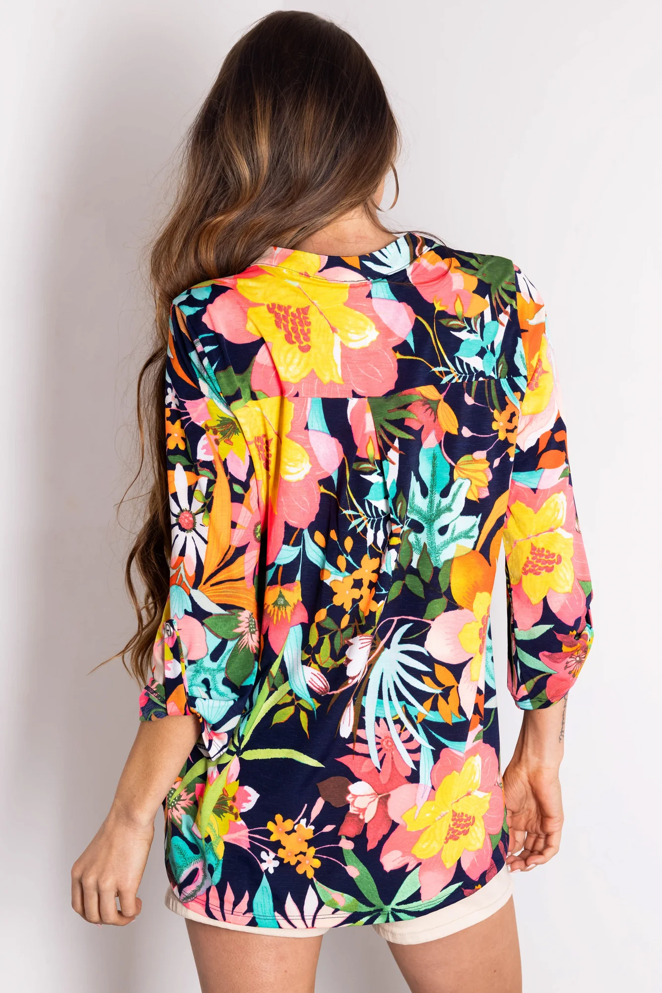 Indulge in the elegance of this Navy Floral Print V Neck Knit Top! Crafted from a stretchy knit blend, this top features a charming floral pattern in Navy, Turquoise, and more. With a V neckline, 3/4 sleeves, and a banded neckline, it offers a comfortable and stylish fit suitable for various occasions. Available in sizes S, M, and L. Care instructions: Hand wash, iron low, and dry flat.
