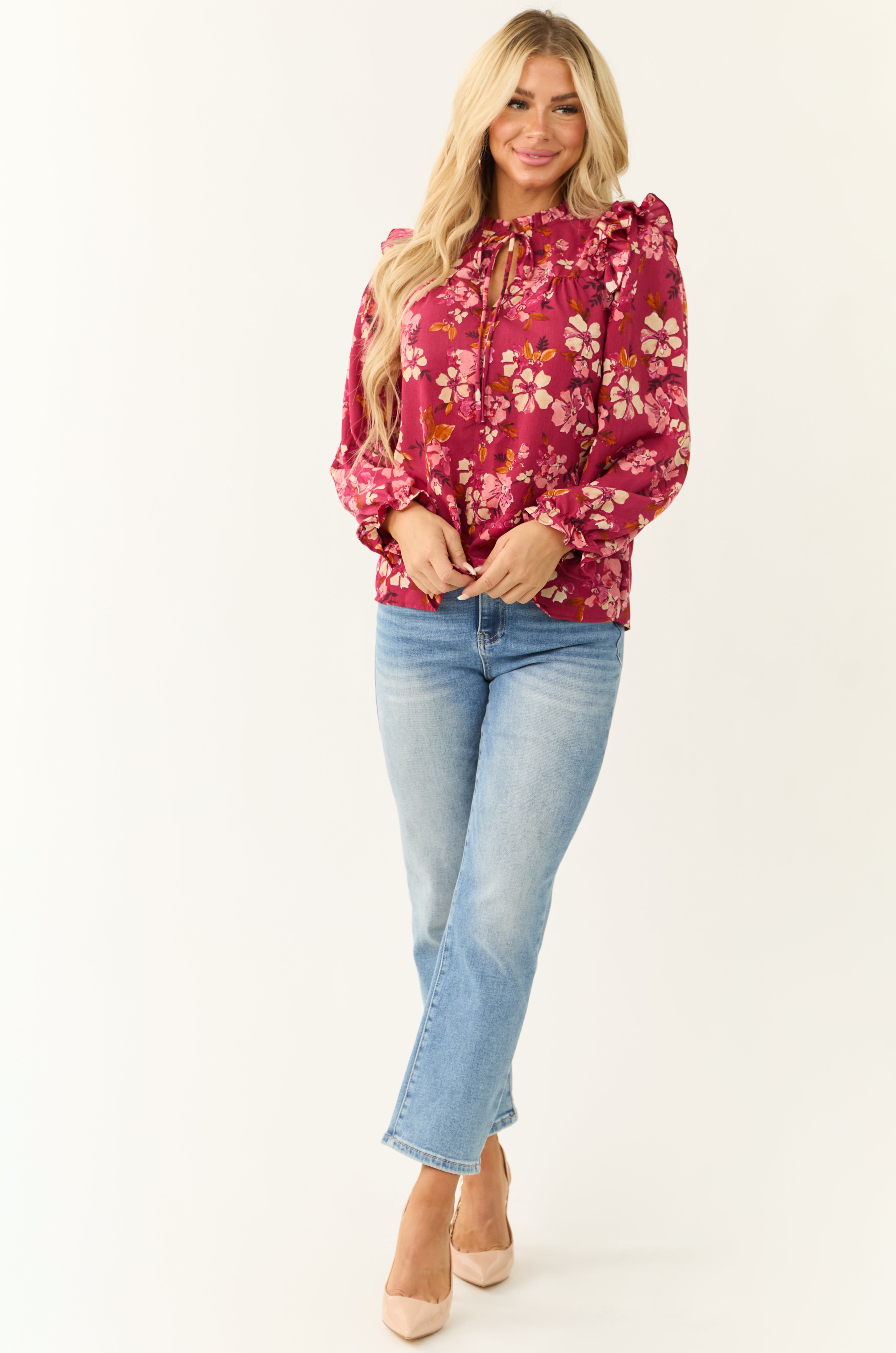 Step out in style with our exquisite Floral Print V-Neck Long Sleeve Blouse. Crafted from 100% Polyester, this flowy blouse features a stunning floral print in shades of Hibiscus, Almond, Tangerine, Eggplant, and Cherry Blossom. The V neckline with tie detail adds a touch of elegance while the long puff sleeves and mid-length design offer a chic look. Perfect for any occasion, whether its a casual day out or a romantic date night. Please note that each piece may vary slightly due to the unique fabric print. Available in sizes S, M, and L.