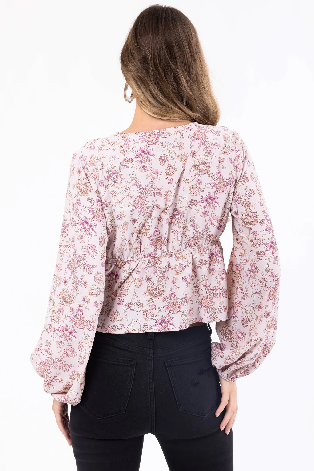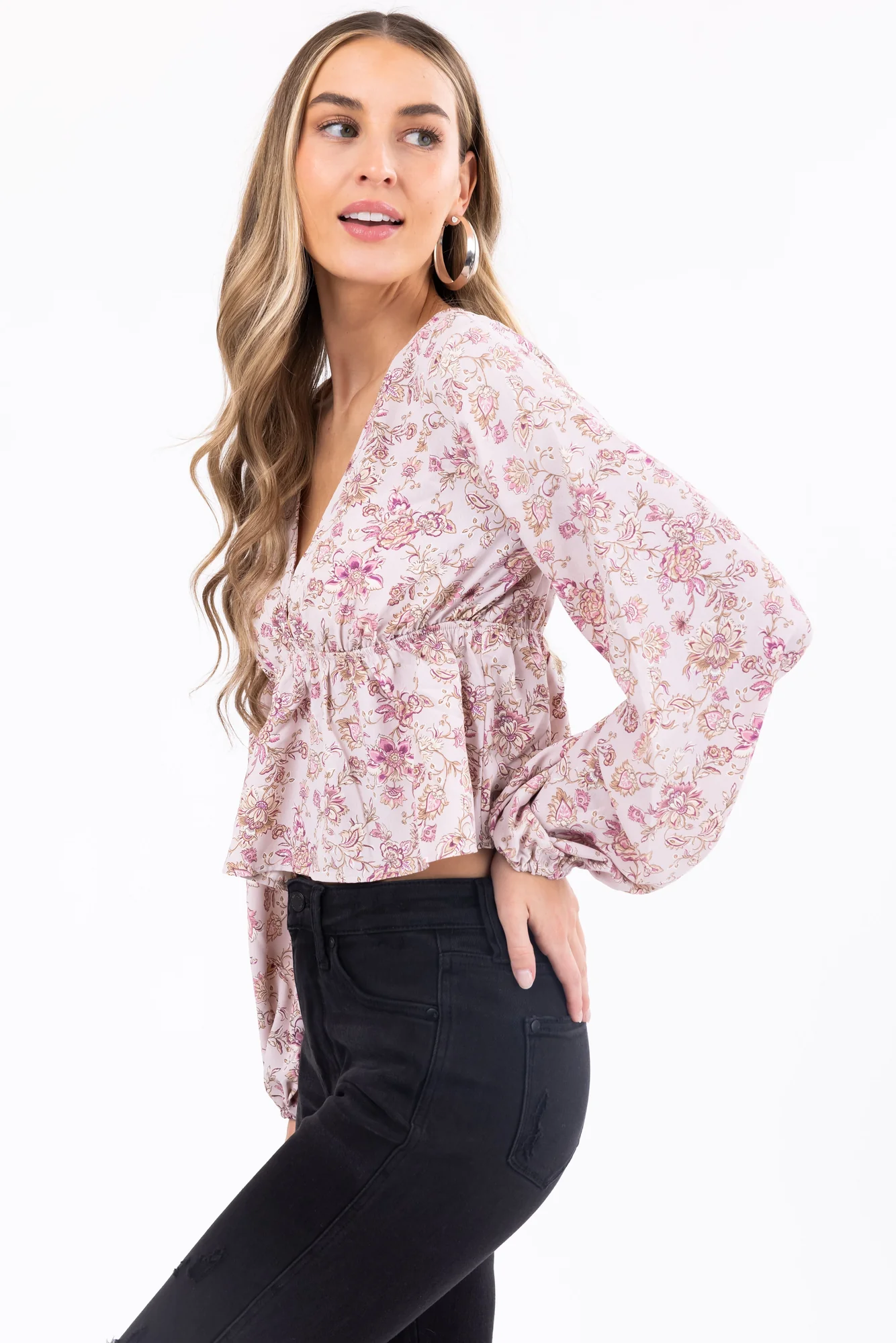 Elevate your style with our Floral Print V Neck Long Sleeve Top in Dusty Blush. This non-stretchy woven top features long puff sleeves, an elastic waistband, and a flare hem. The floral print in shades of Dusty Blush, Ivory, Beige, Baby Pink, and Grape adds a touch of elegance. Imported. Crafted from 100% Polyester. Care instructions: Dry clean only. Model is wearing size Small.