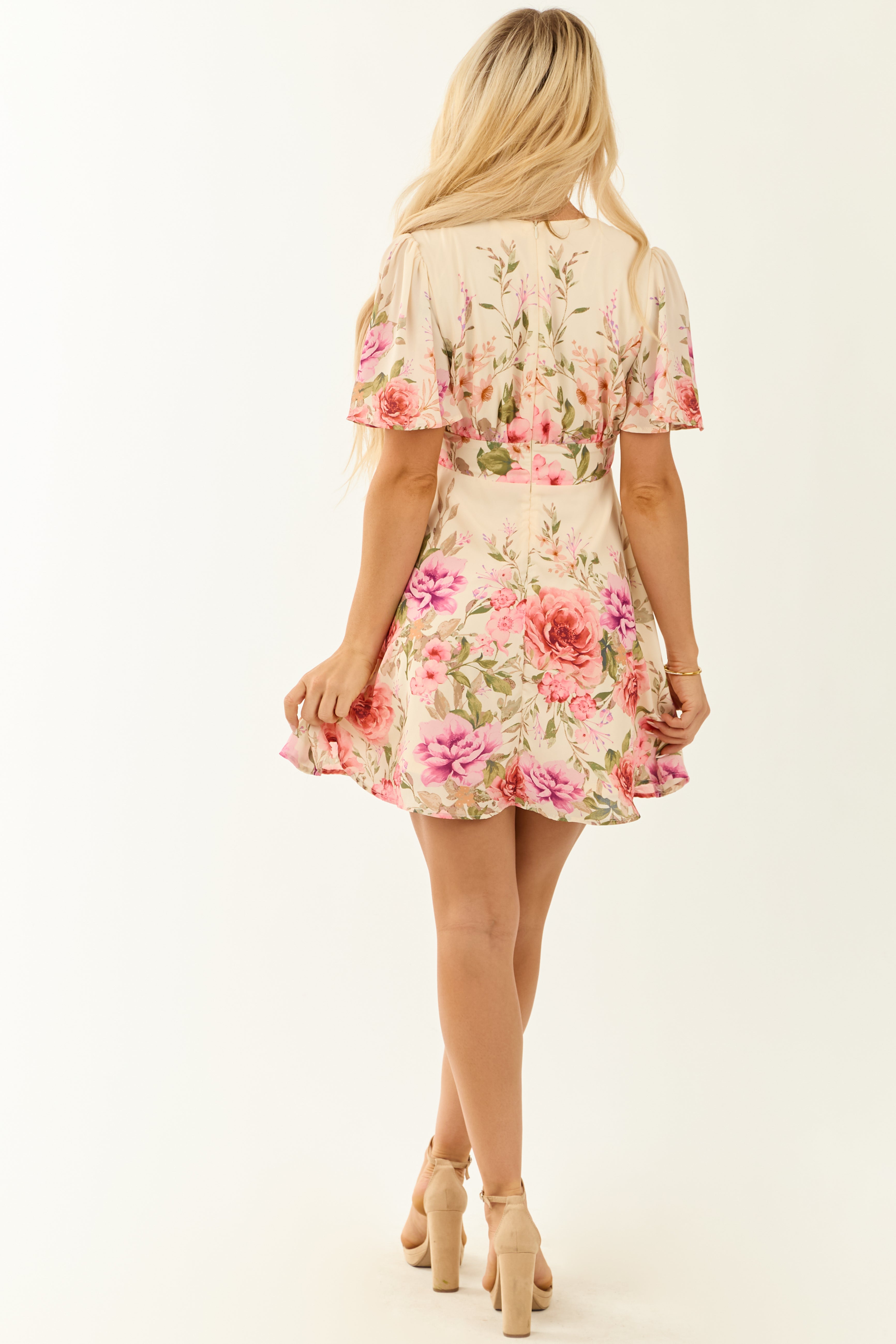 Elevate your style with this empowering Floral Print V-Neck Mini Dress in Cream. Featuring a deep V-neckline, flutter sleeves, and a figure-enhancing fit, this dress is a blend of elegance and confidence. The dress is adorned with beautiful floral patterns in Peach, Bubblegum, Iris, Latte, Mulberry, and Olive hues. It comes with a hidden back zipper, lining for comfort, and slight ruching for a flattering look. Perfect for various occasions, this dress is a must-have for your wardrobe.