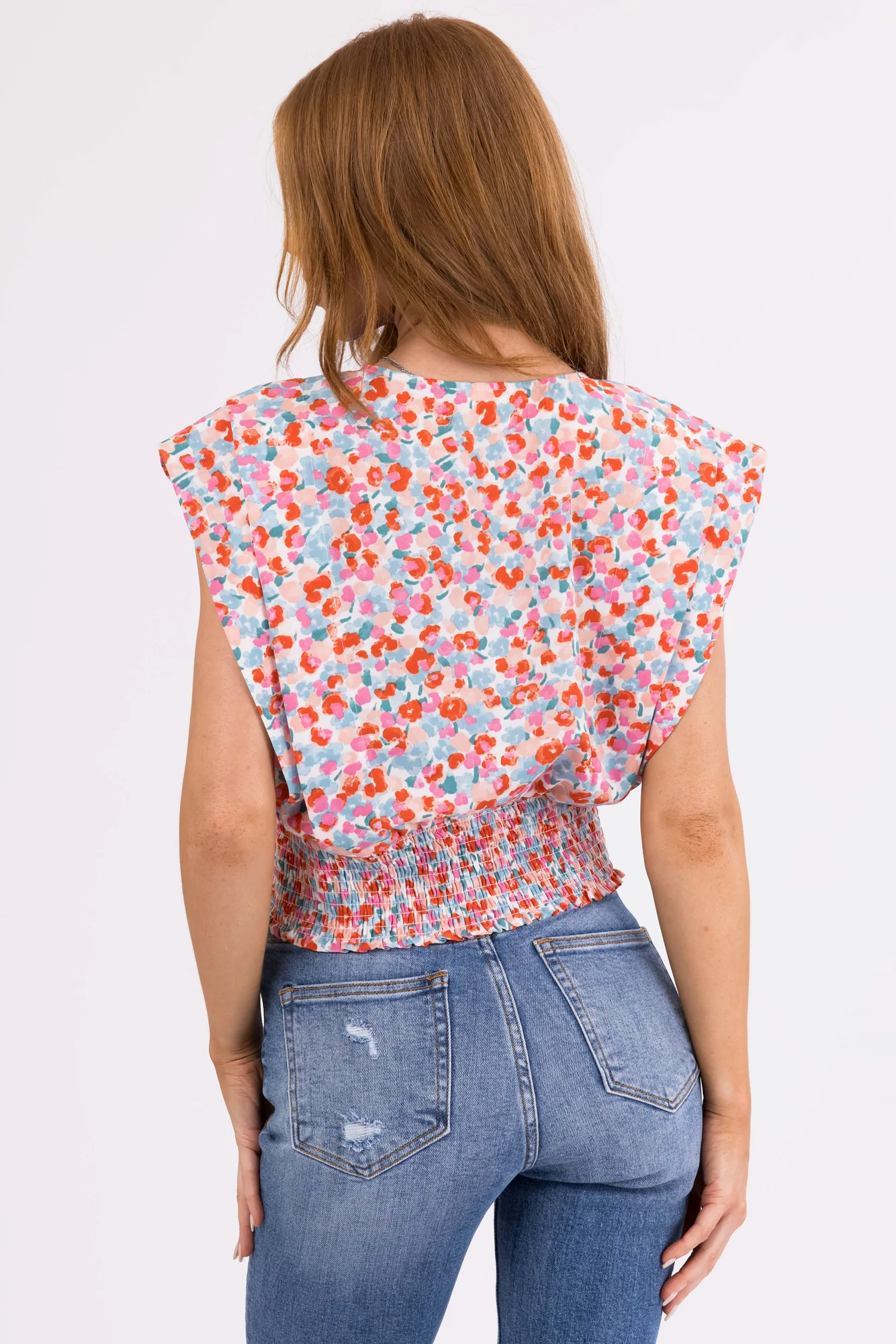 This stunning Floral Print V-Neck Short Sleeve Top in Vanilla is a must-have addition to your wardrobe. Crafted from non-stretchy woven fabric with a smocked back waistband, this top features a deep V neck with a snap button closure and overlay details. The banded waist and floral print in shades of Vanilla, Magenta, Poppy Red, Peach, Ocean, and Pine create a beautifully feminine look. Perfect for daytime or vacation wear, this top is unlined and imported. Care instructions: Hand wash cold water separately, hang to dry. Please note that due to the cutting and sewing process, items may vary slightly, and the floral print may differ on each piece. Model is wearing a size Small. Model’s Profile: Size 1, Height 55″, Bust 31″, Waist 24″.