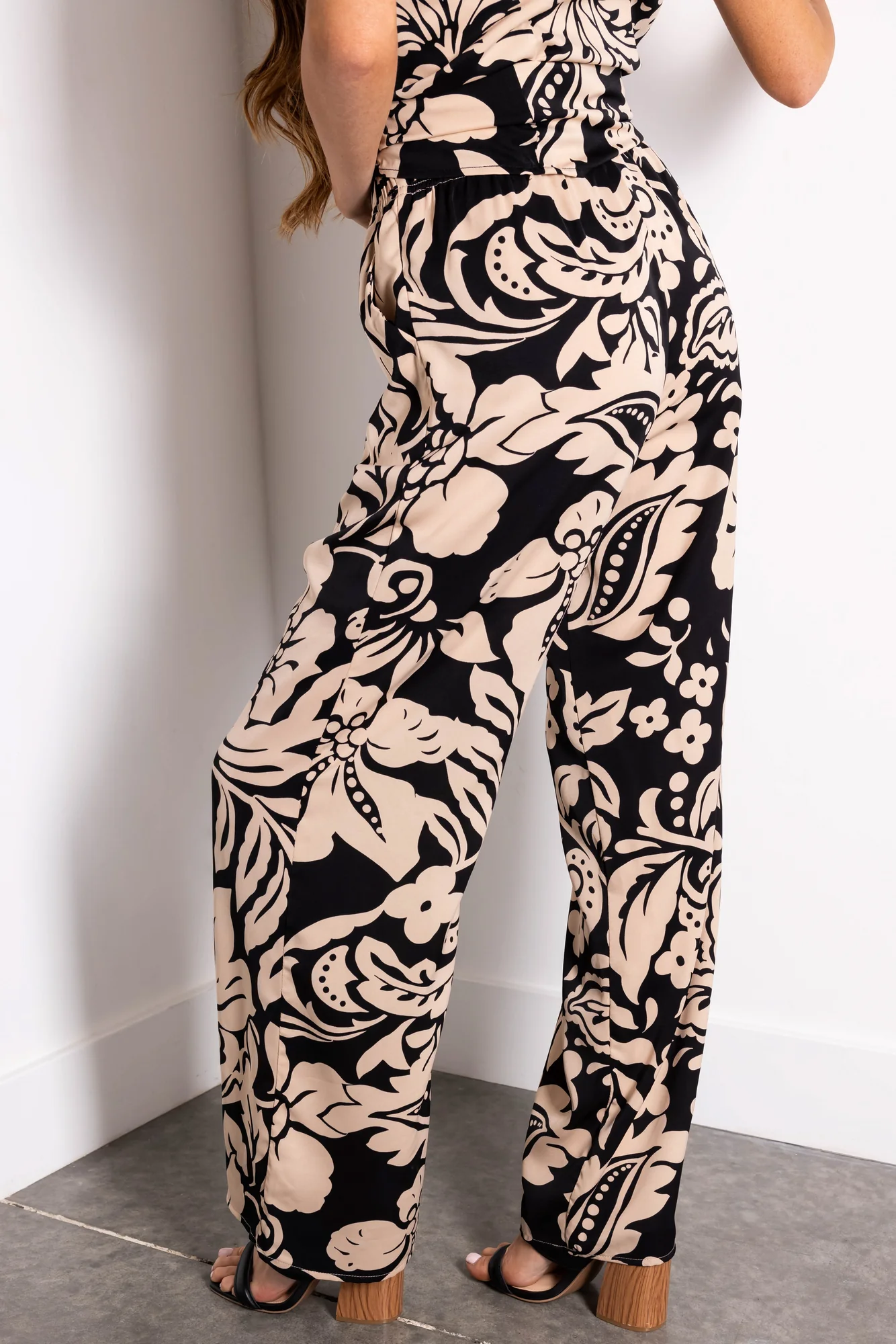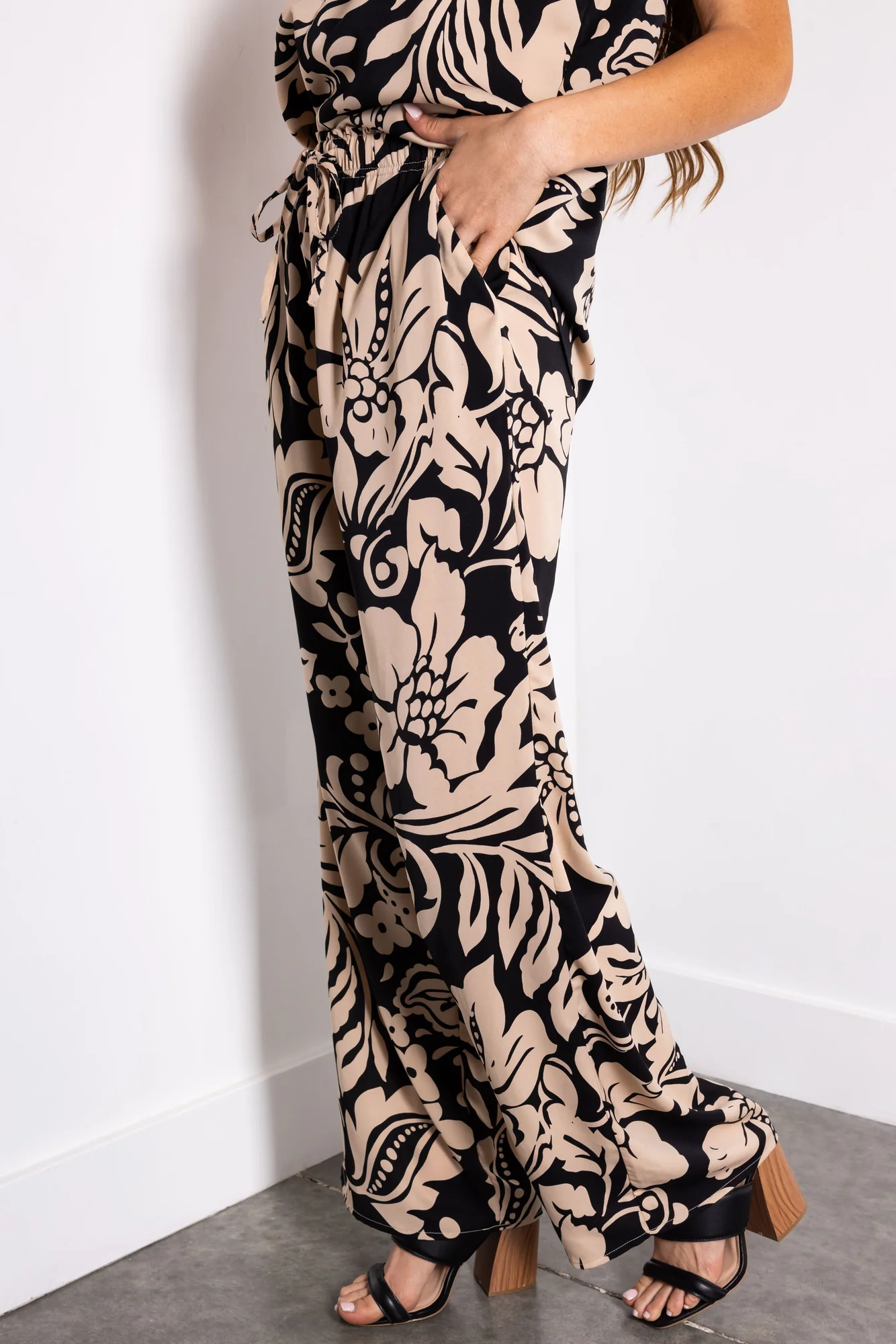 These Black and Beige Floral Print Wide Leg Pants in sizes Small, Medium, and Large feature a non-stretchy woven design with a drawstring elastic waistband, 2 pockets, and are unlined. Made of 100% Polyester, pair them with the matching Black and Beige Floral Print V Neck Tank Top for a cohesive look. Please note: Hand wash cold, do not bleach, low iron, do not dry clean, line dry for best care. Due to the fabrics print and the cutting process, each piece may vary slightly, and the floral pattern may not align perfectly at the seams. Model is wearing a size Small. Models stats: Size 2, Height 58, Bust 32, Waist 25.