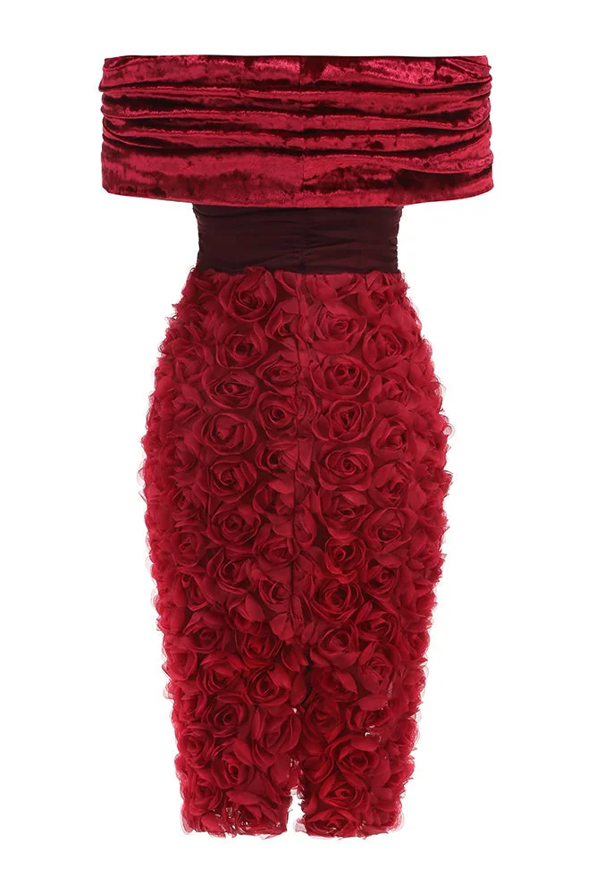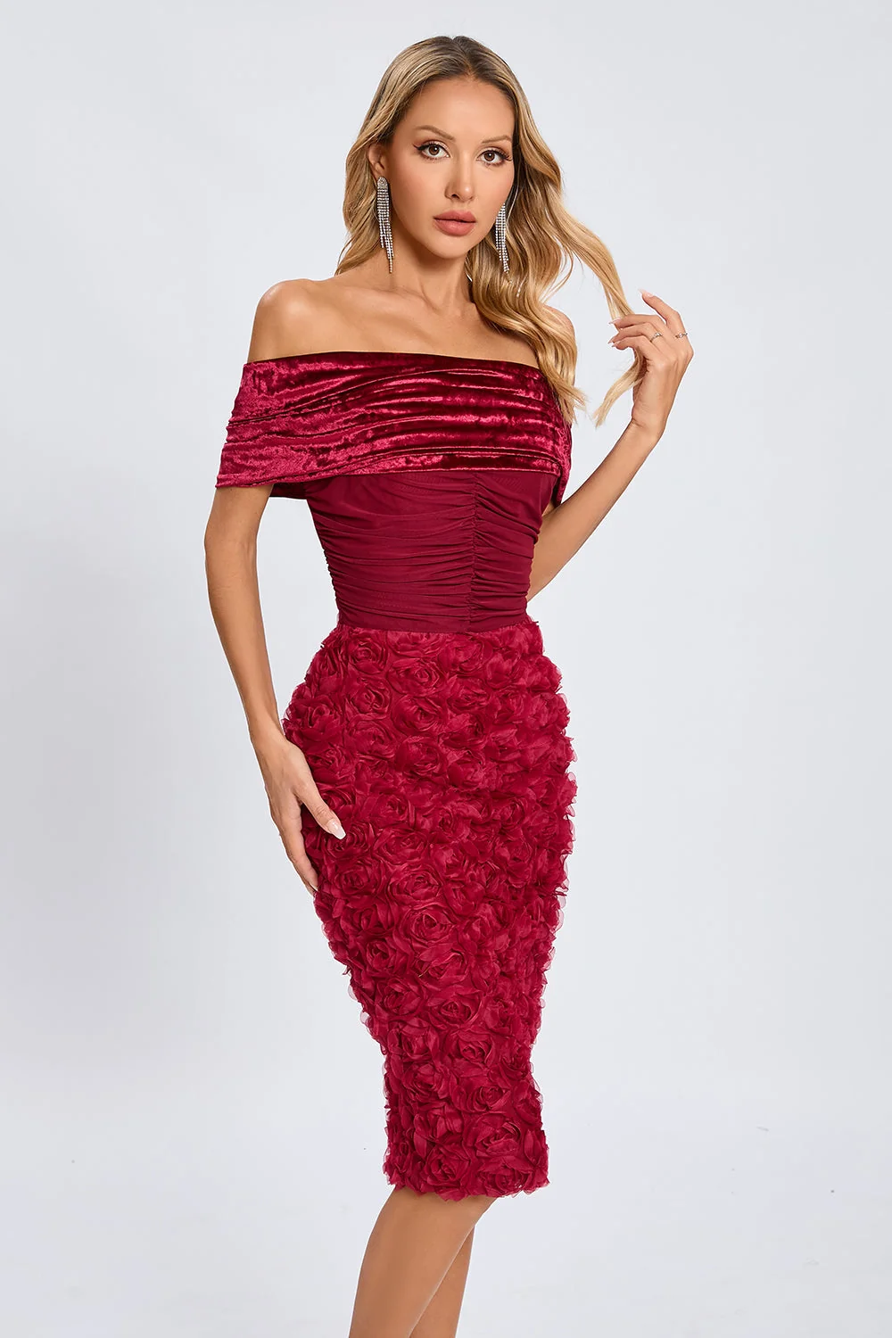 Indulge in the luxurious and romantic charm of this floral red off-shoulder midi dress. The delicate floral embellishments and elegant off-shoulder design will make you stand out in any crowd. Perfect for special occasions, this dress will boost your confidence and radiate beauty effortlessly. Made of 96% Polyester and 4% Elastane, this dress requires gentle dry cleaning for maintenance. Experience the true color without model bias in our real pictures. Shine bright with this captivating dress!