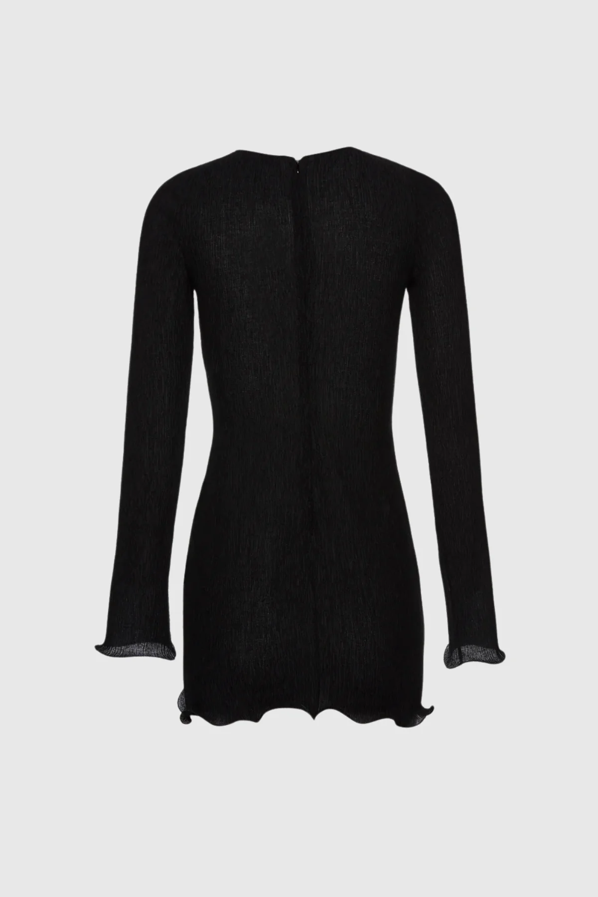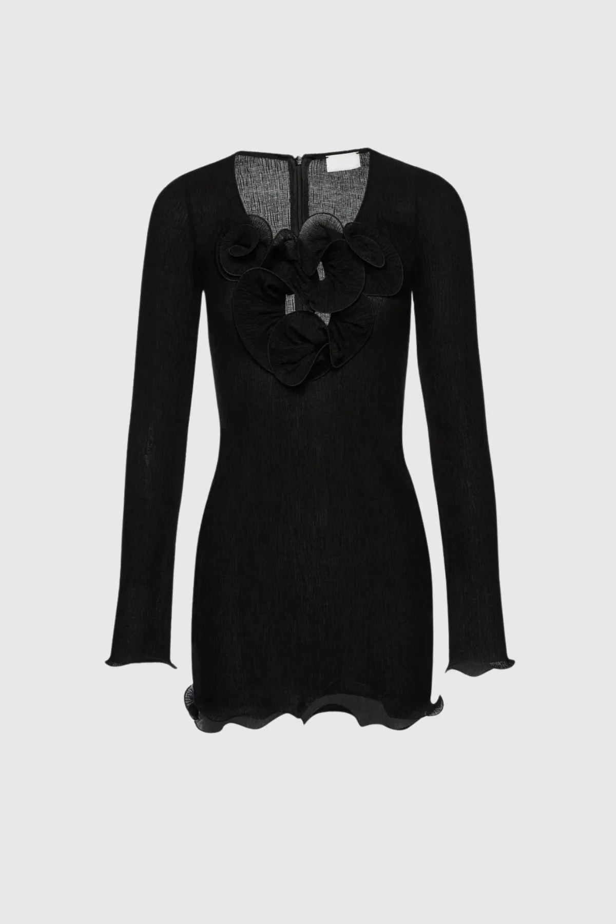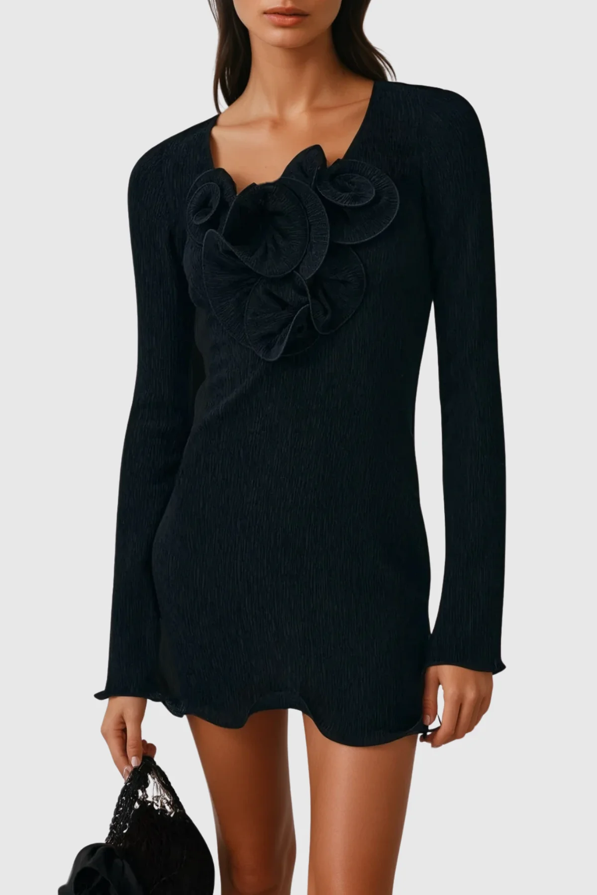 Elevate your wardrobe with the Floral Ruffle Mini Dress in Black, a refined choice for elegant occasions. Crafted with delicate floral detailing and feminine ruffle accents, this dress offers a flattering silhouette and effortless movement. Its classic black hue ensures versatility, seamlessly transitioning from day to evening wear. Designed for those who appreciate subtle sophistication and expert tailoring, it combines style and comfort for a confident, polished look. The slight stretch adds to its comfort, making it ideal for various events. Embrace timeless style and grace with this beautiful dress. Clean with a gentle machine wash to maintain its exquisite quality. Note: Color may vary due to lighting on images.