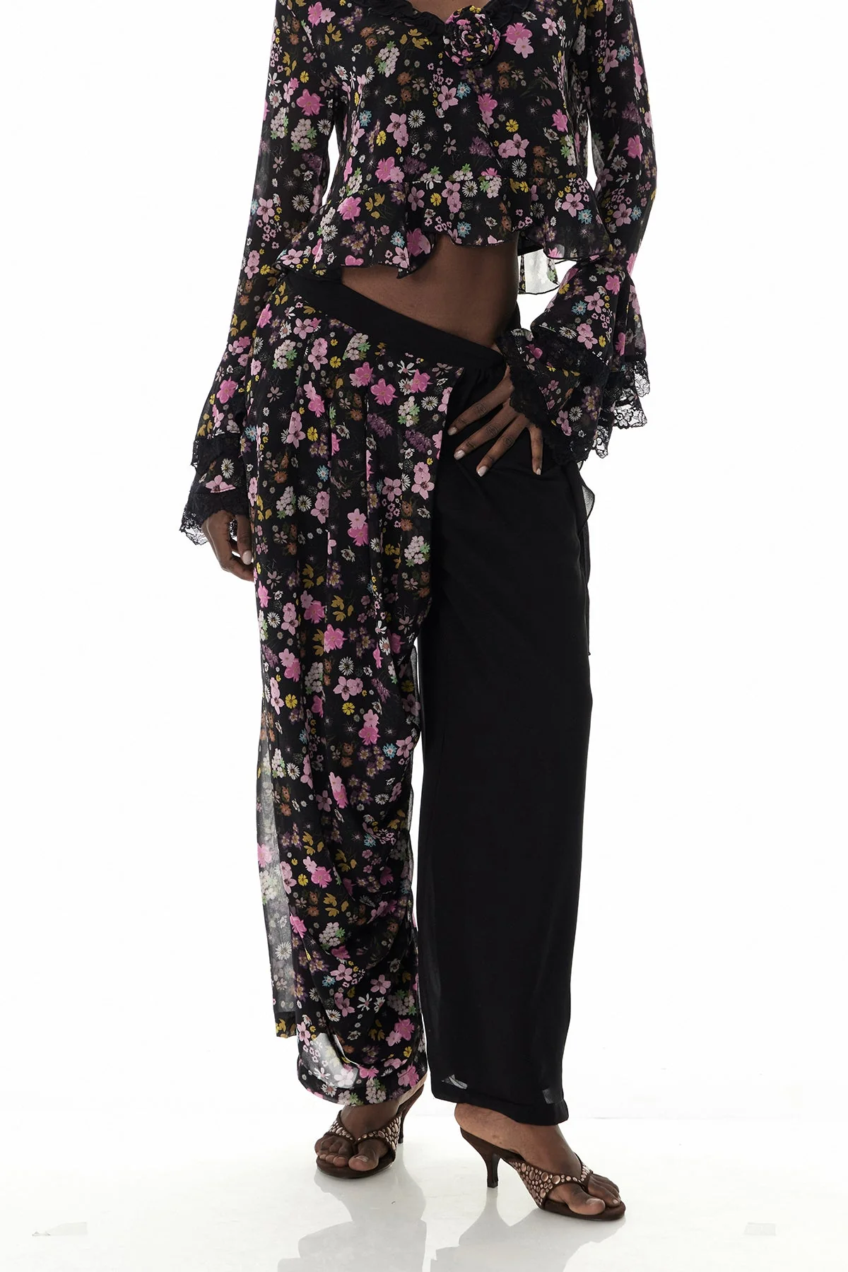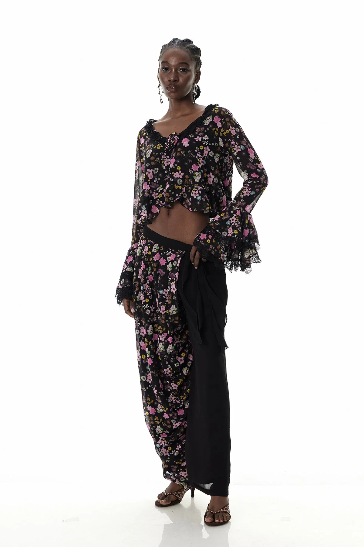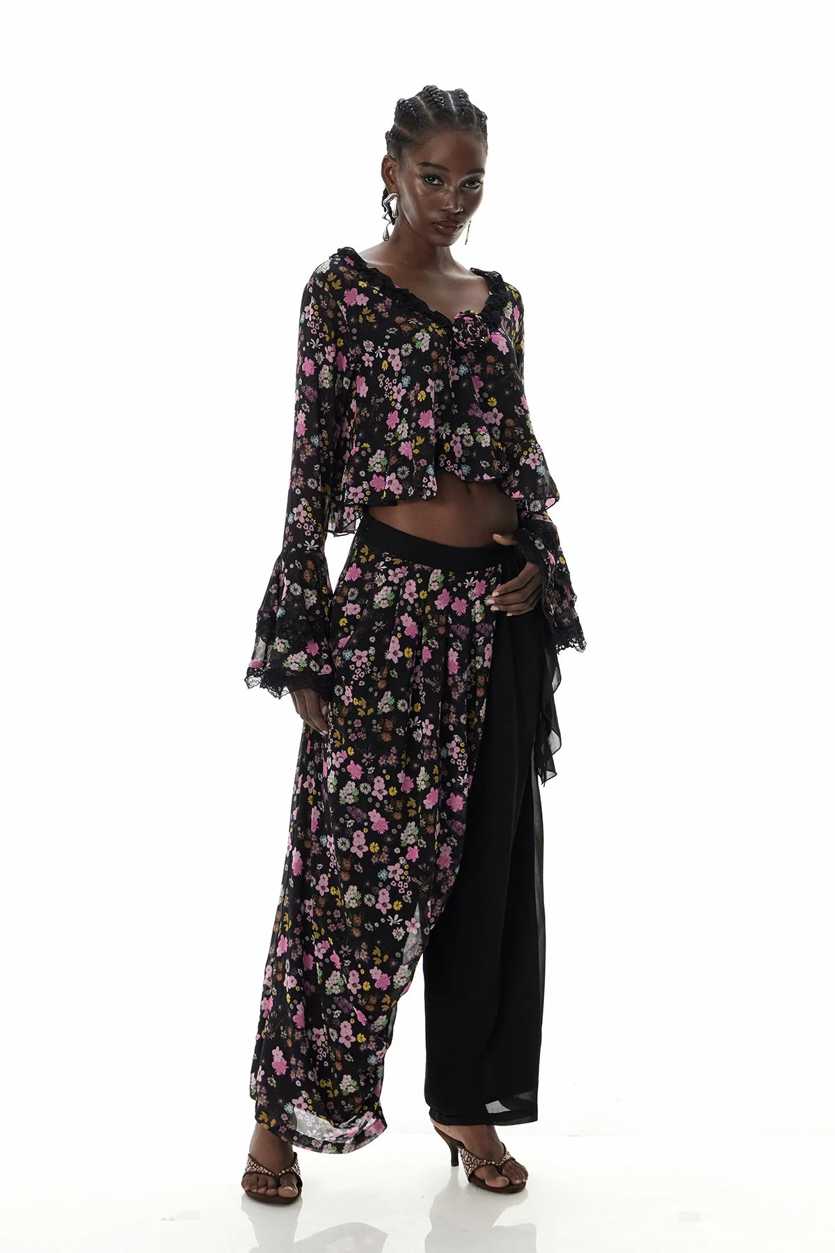 The Floral Ruffle Pants Set in Elegant Black offers a sophisticated ensemble combining floral design with refined ruffle accents. This beautifully tailored set ensures a flattering fit, allowing for comfortable movement ideal for various occasions. Elevate your wardrobe with this versatile pairing that adds a fresh, stylish touch. The set includes the top and pants, each sold separately to complete the look. Explore the romantic coquette vibe with the graceful floral pattern and elegant ruffle detailing. The non-stretch fabric requires gentle machine wash. Due to lighting variations, color may vary in images. Enhance your outfit with this chic and classic black ensemble.