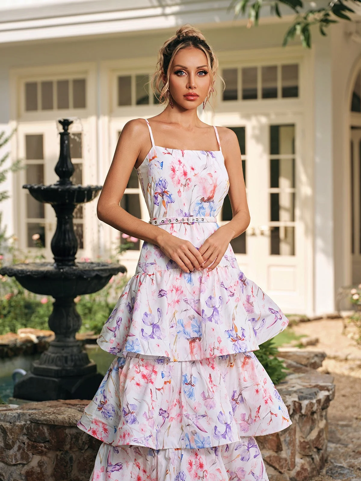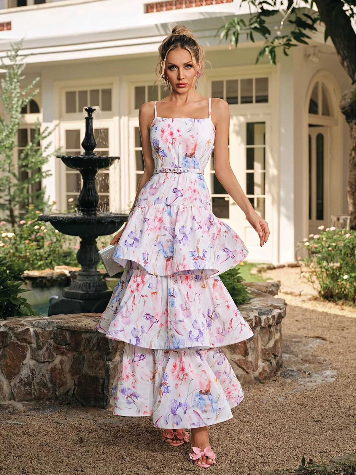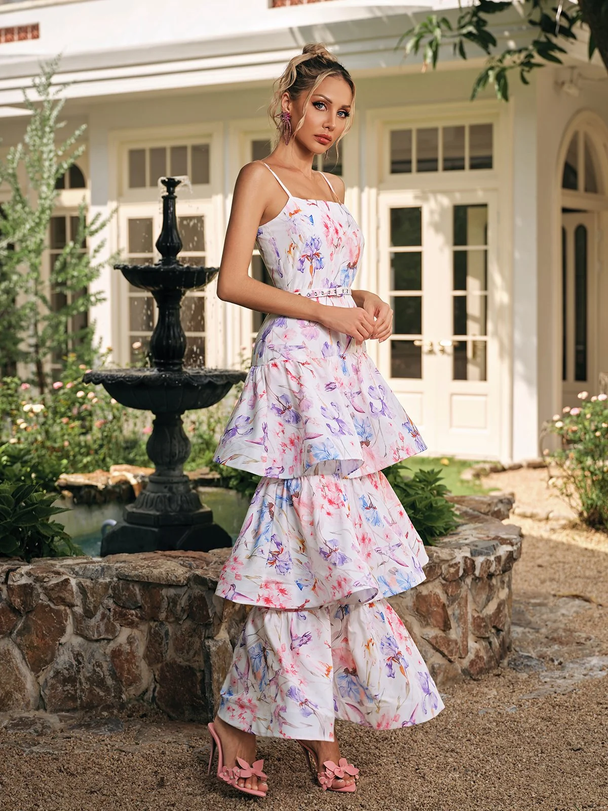 Indulge in the graceful blend of floral charm and flowing elegance with the Floral Ruffle Tiered Maxi Dress. Delicate spaghetti straps and tiered ruffles create a flattering silhouette that moves beautifully with every step, making you feel effortlessly stunning and confident. This dress is perfect for garden parties, special occasions, or any event where you want to stand out. Crafted from 100% Polyester with a slight stretch, it offers both style and comfort. The zippered opening at the back ensures easy wear. Elevate your wardrobe with this vibrant, feminine piece. *Please Note: Color may vary due to lighting. Model is wearing size S.