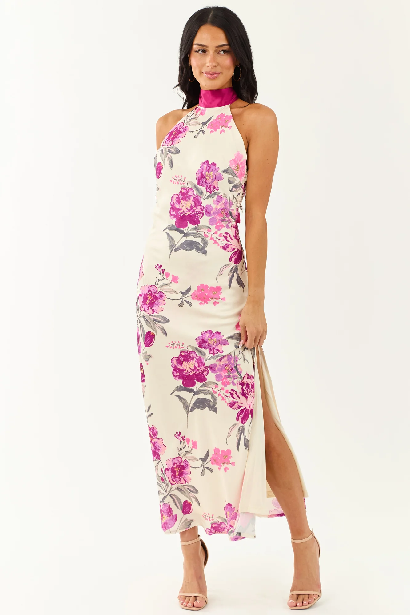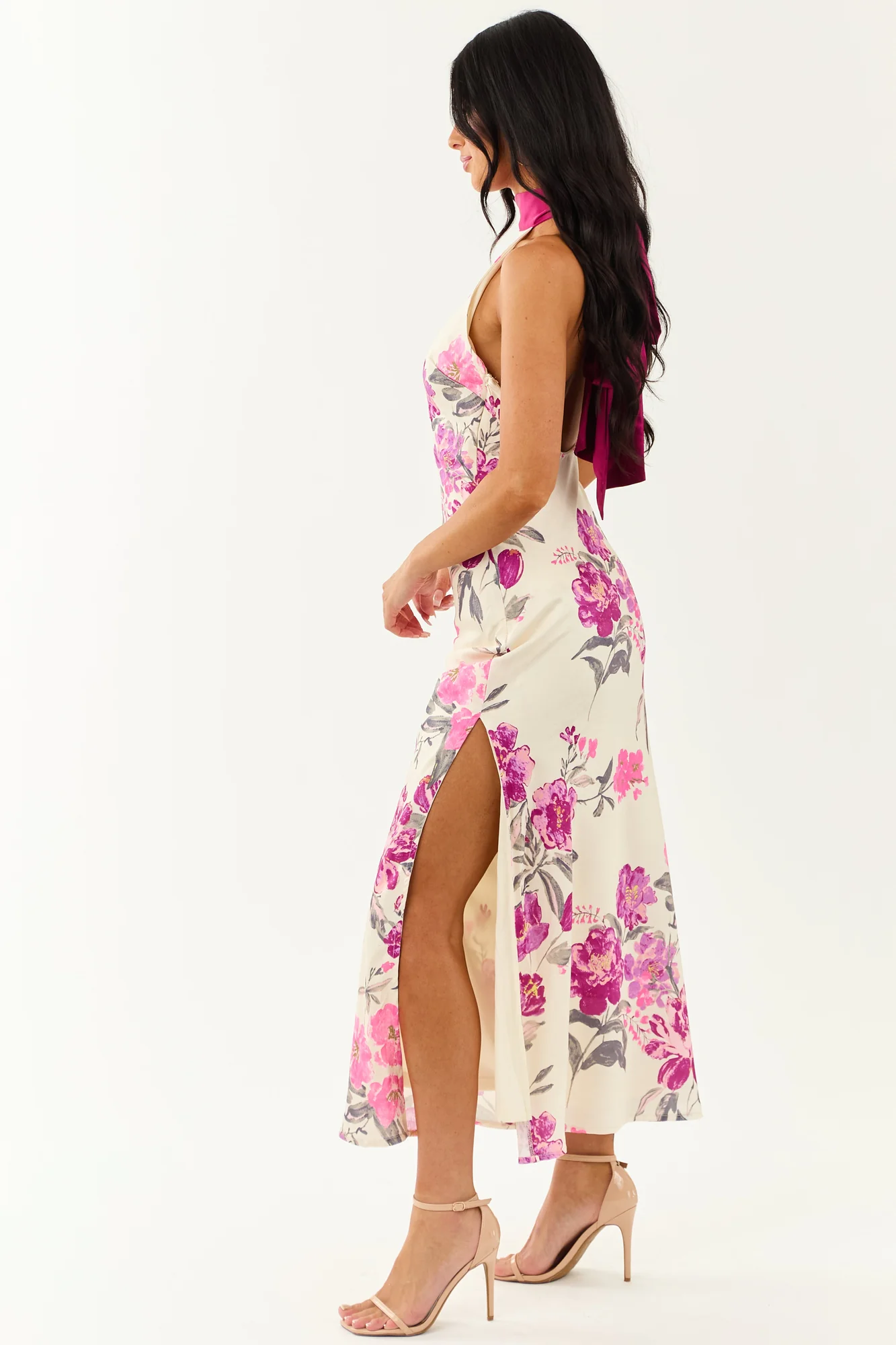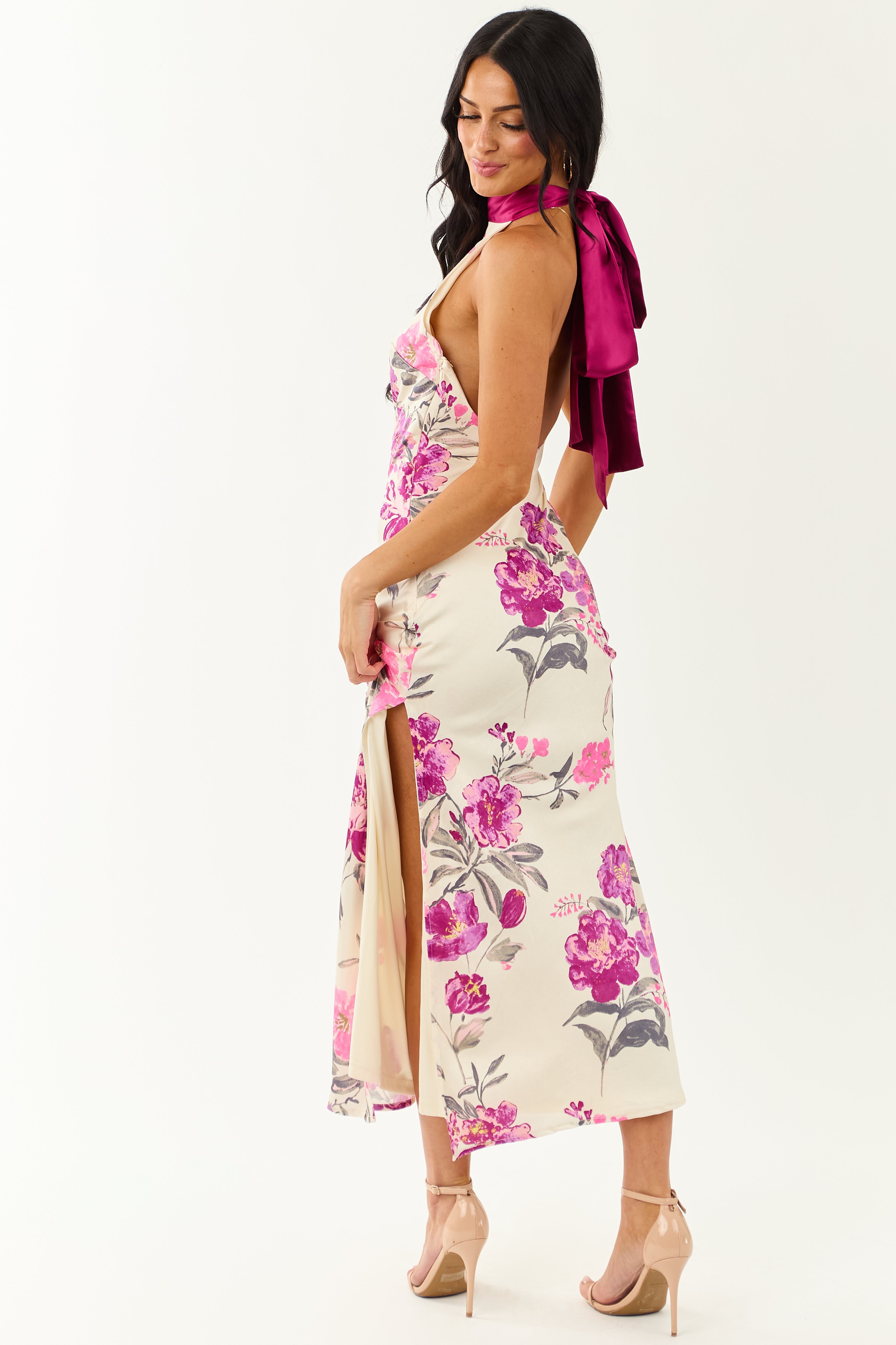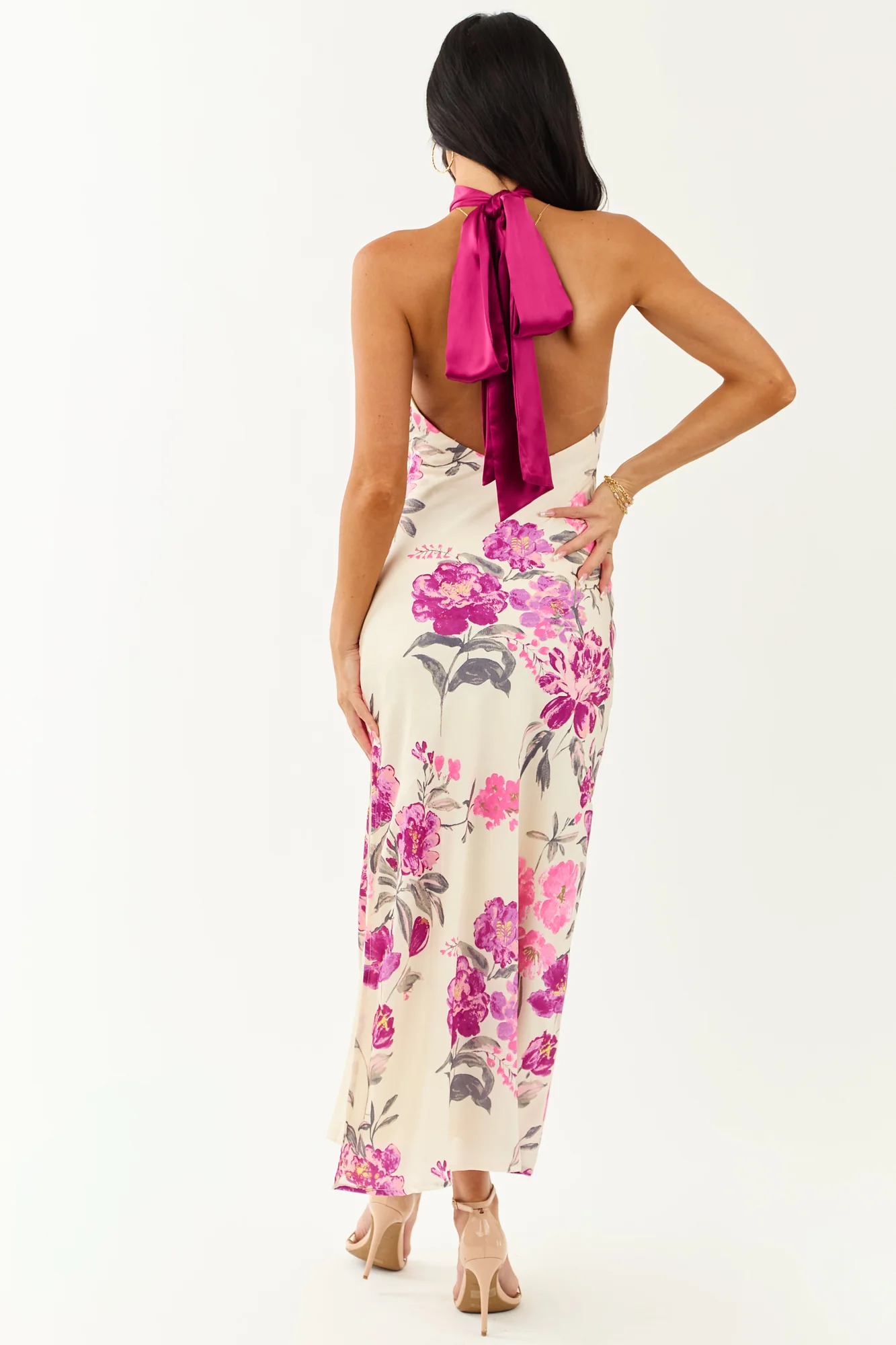 Indulge in elegance with this Floral Satin Halter Neck Maxi Dress. Designed for drama and romance, it features a non-stretchy satin fabric with a beautiful floral print in Bubblegum, Mulberry, Juniper, and Lemon shades. The dress comes with a long halter tie, hidden side zipper, backless design, and a striking side slit for added allure. Lined for comfort, made of 100% Polyester with a 95% Polyester, 5% Spandex contrast. Embrace enchanting sophistication with this Fore Collection piece. Available in sizes S, M, and L.