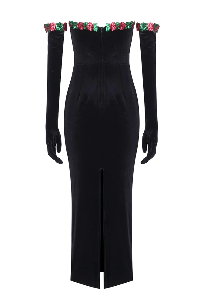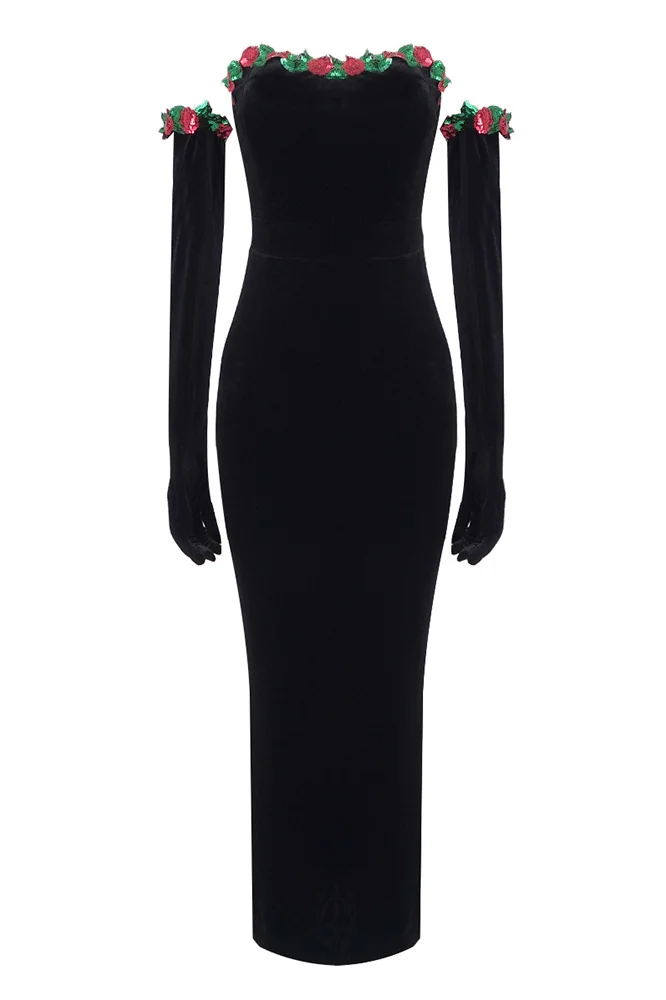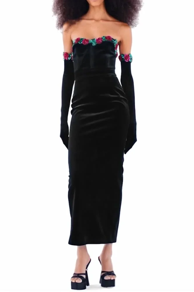 Indulge in luxury with our strapless floral sequined lace embellished velvet maxi dress. This midi dress comes with matching gloves for a glamorous touch. Please note that colors may vary slightly due to lighting. Refer to our size chart for the perfect fit. Embrace elegance and style with this exquisite piece.