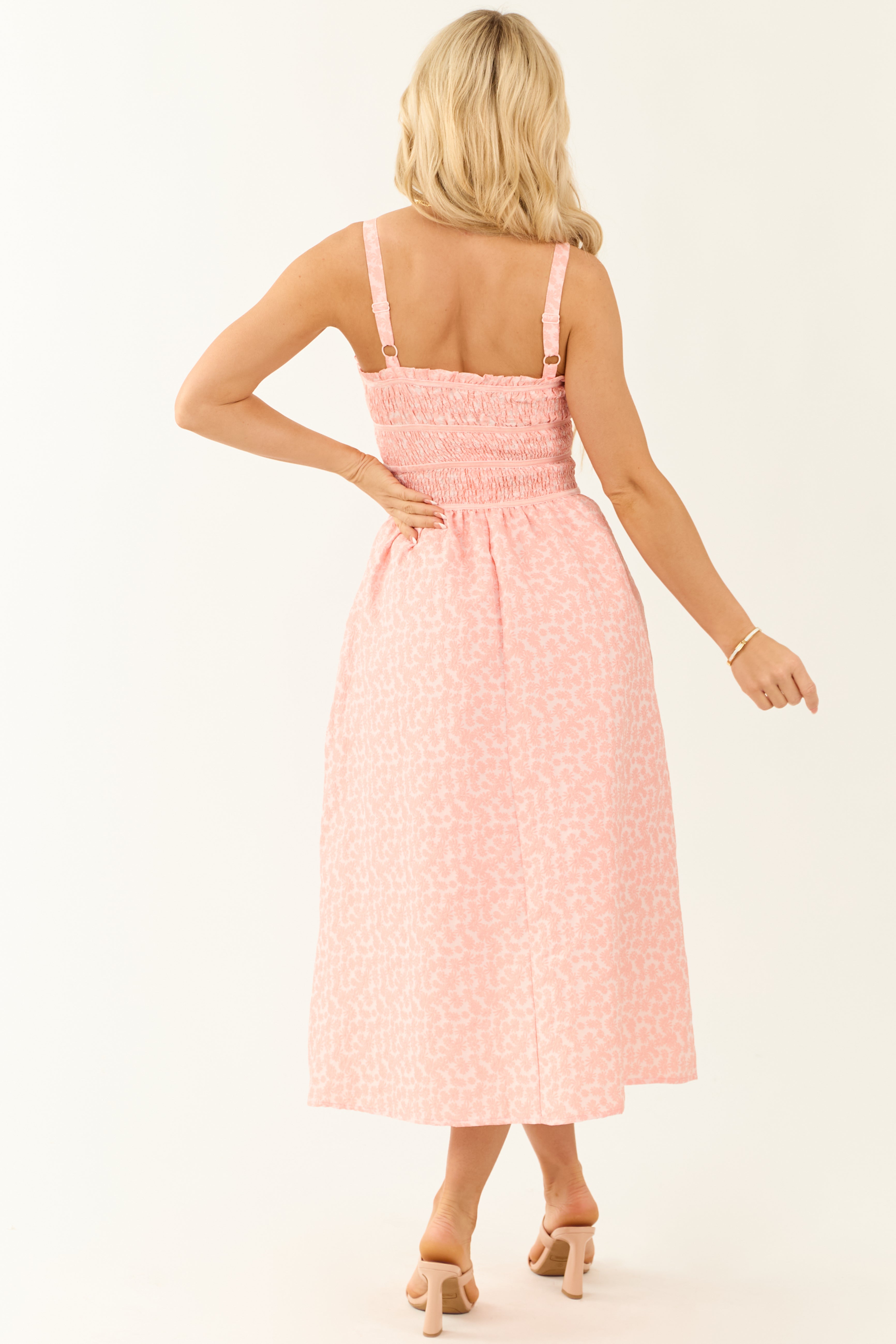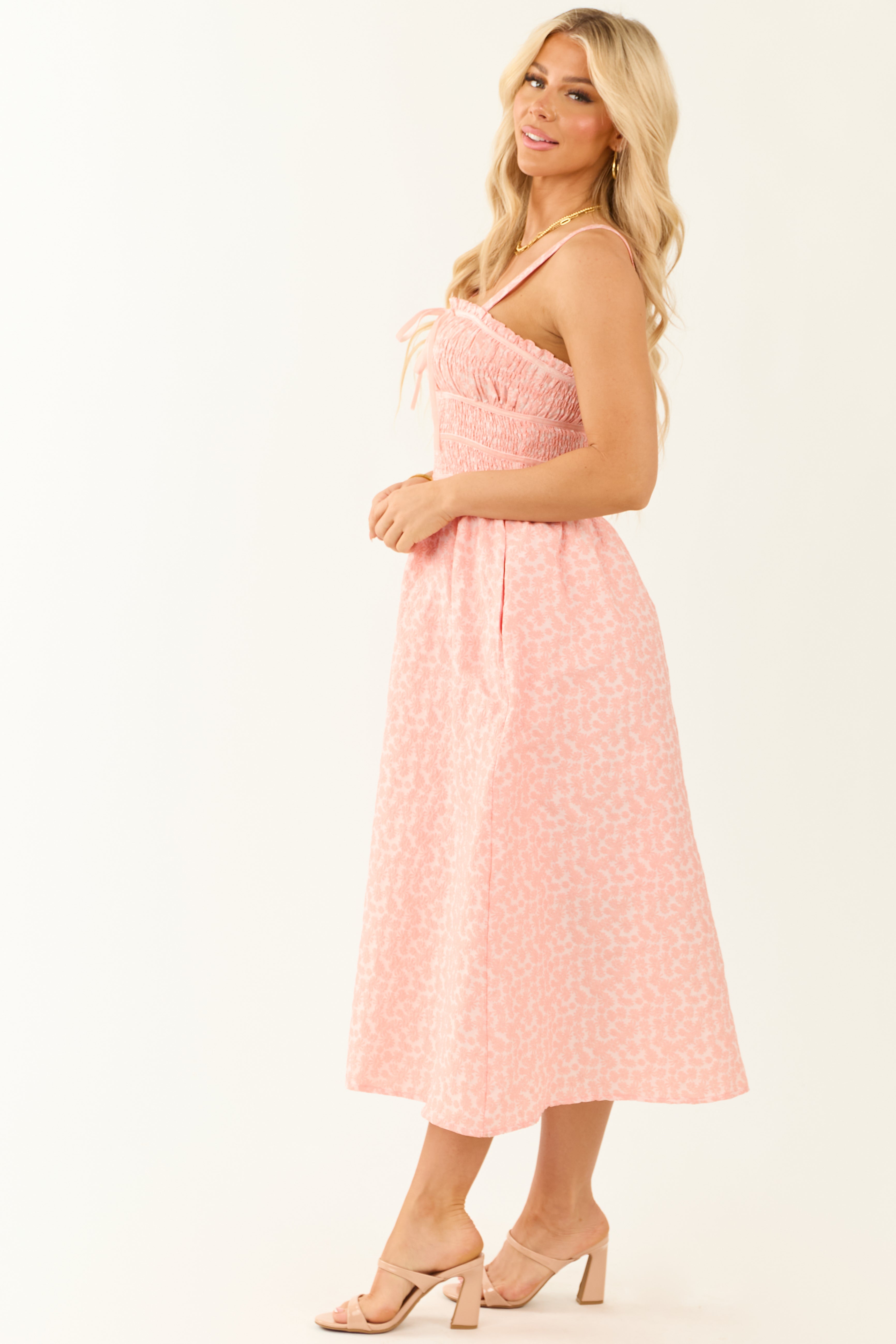 Elevate your wardrobe with this gorgeously feminine floral midi dress featuring a flattering fit, adjustable straps, frill neckline, and tiered velvet waist details. The elastic smocked bodice ensures a comfortable and stylish look. Stay chic and trendy with this square neckline dress that includes side pockets. Ideal for spring and summer outings. Crafted from 100% polyester with a 100% rayon lining. Available in sizes S, M, and L. Please note: Variations may occur in the fabrics print due to the sewing process.