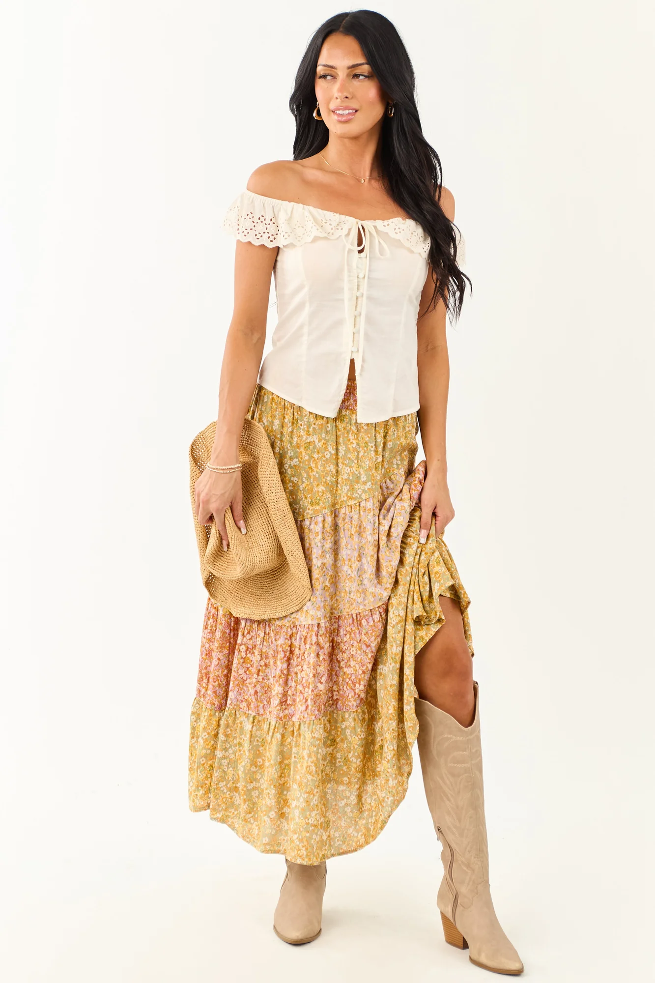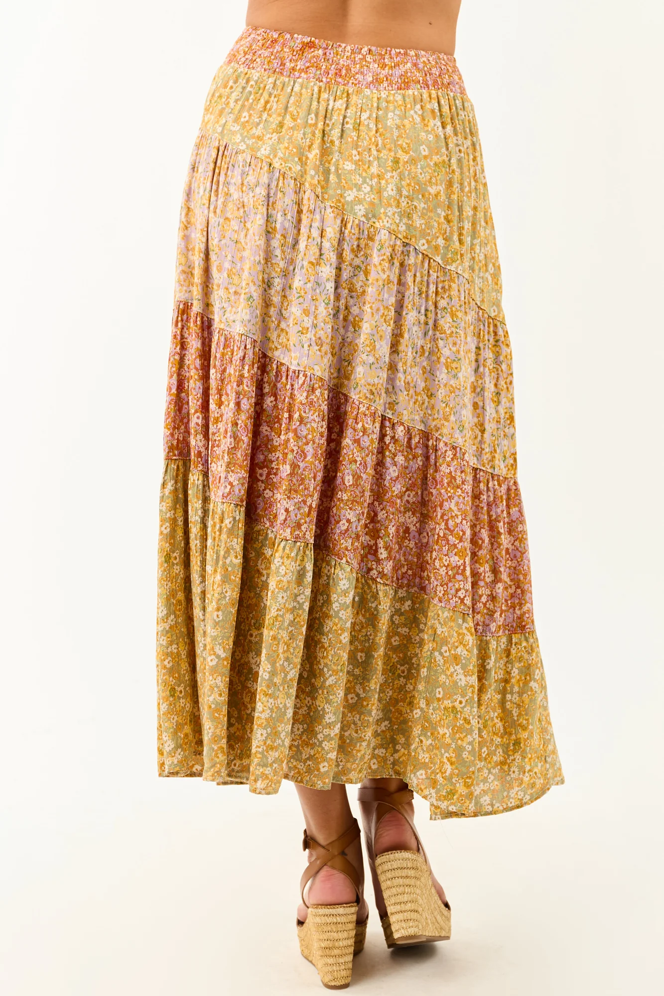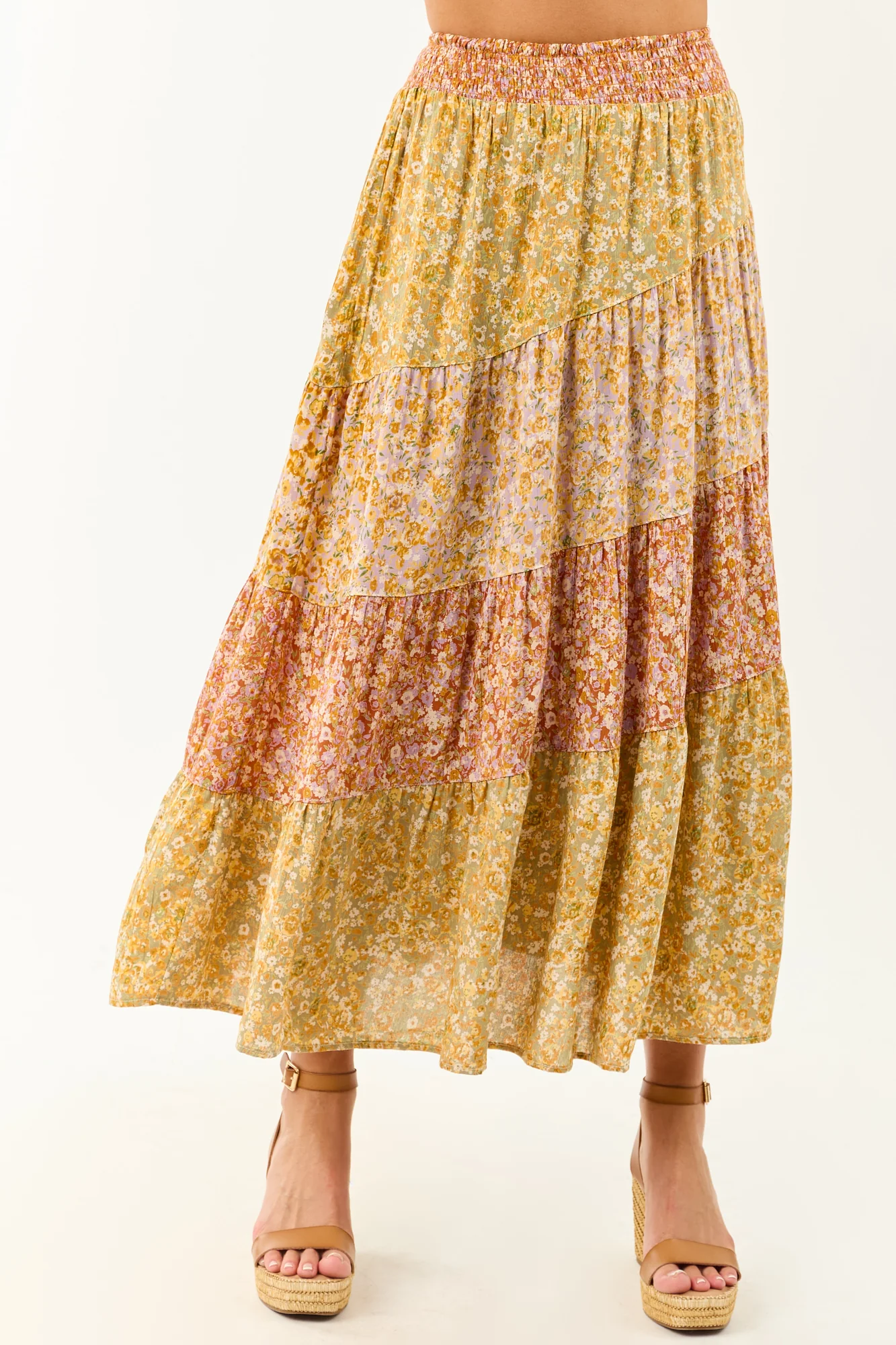 Indulge in the beauty of this bold and breezy floral maxi skirt featuring a pistachio colorblock pattern in shades of Lavender, Tawny, Jade, Marigold, and Vanilla. Made from 100% Rayon, this comfortably stylish skirt with an elastic smocked waist is designed to fit seamlessly. Whether worn during casual outings or special occasions, it adds an elegant touch to your look. The length ranges from 37 inches, available in sizes S, M, and L. Imported.