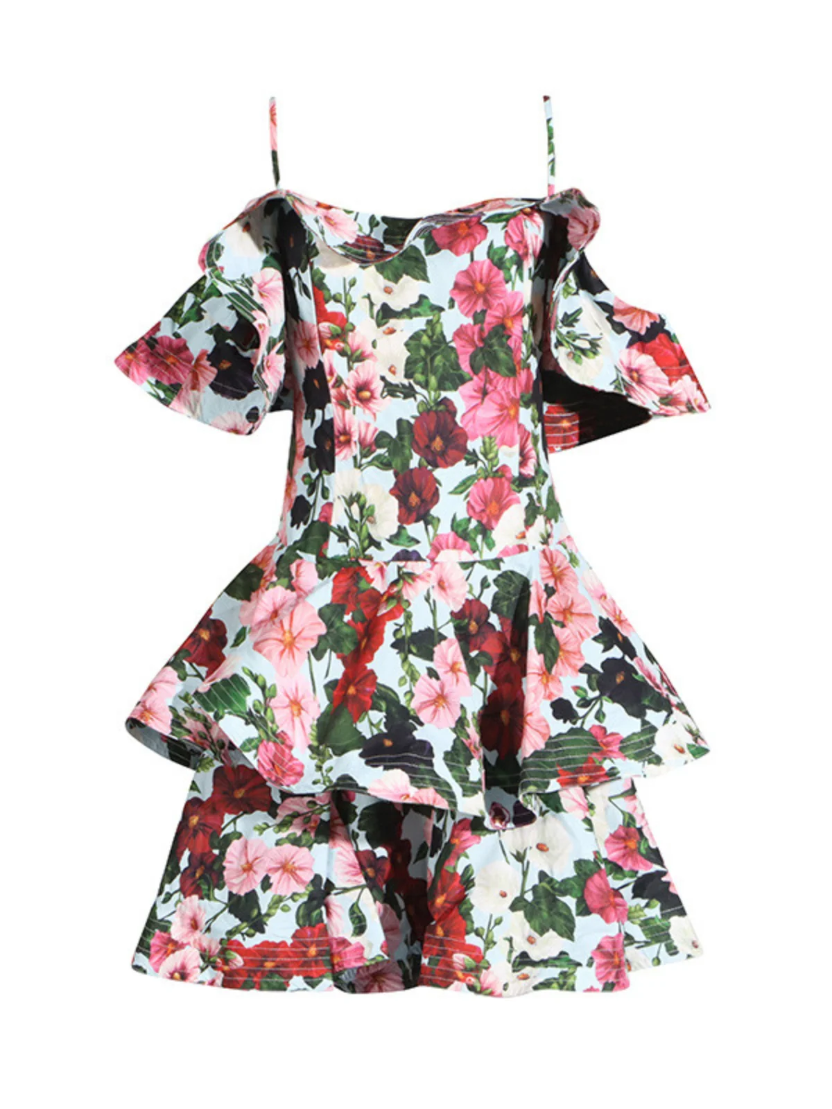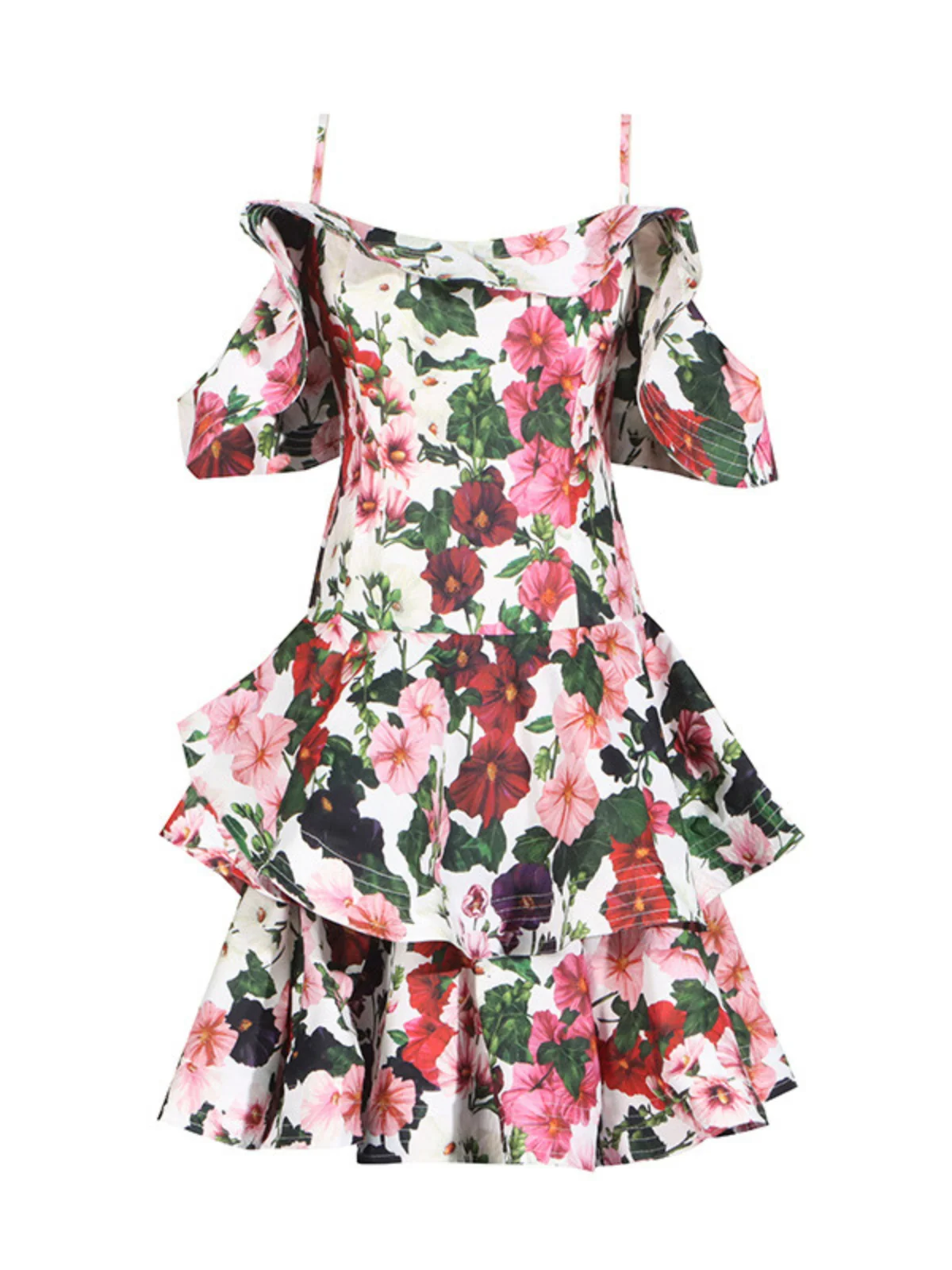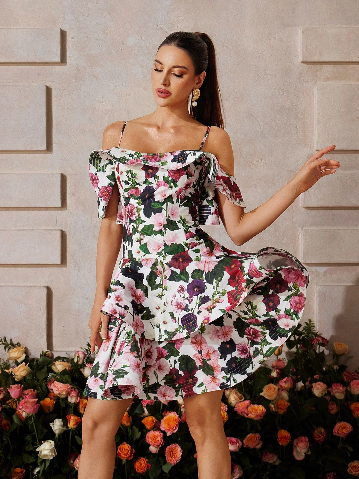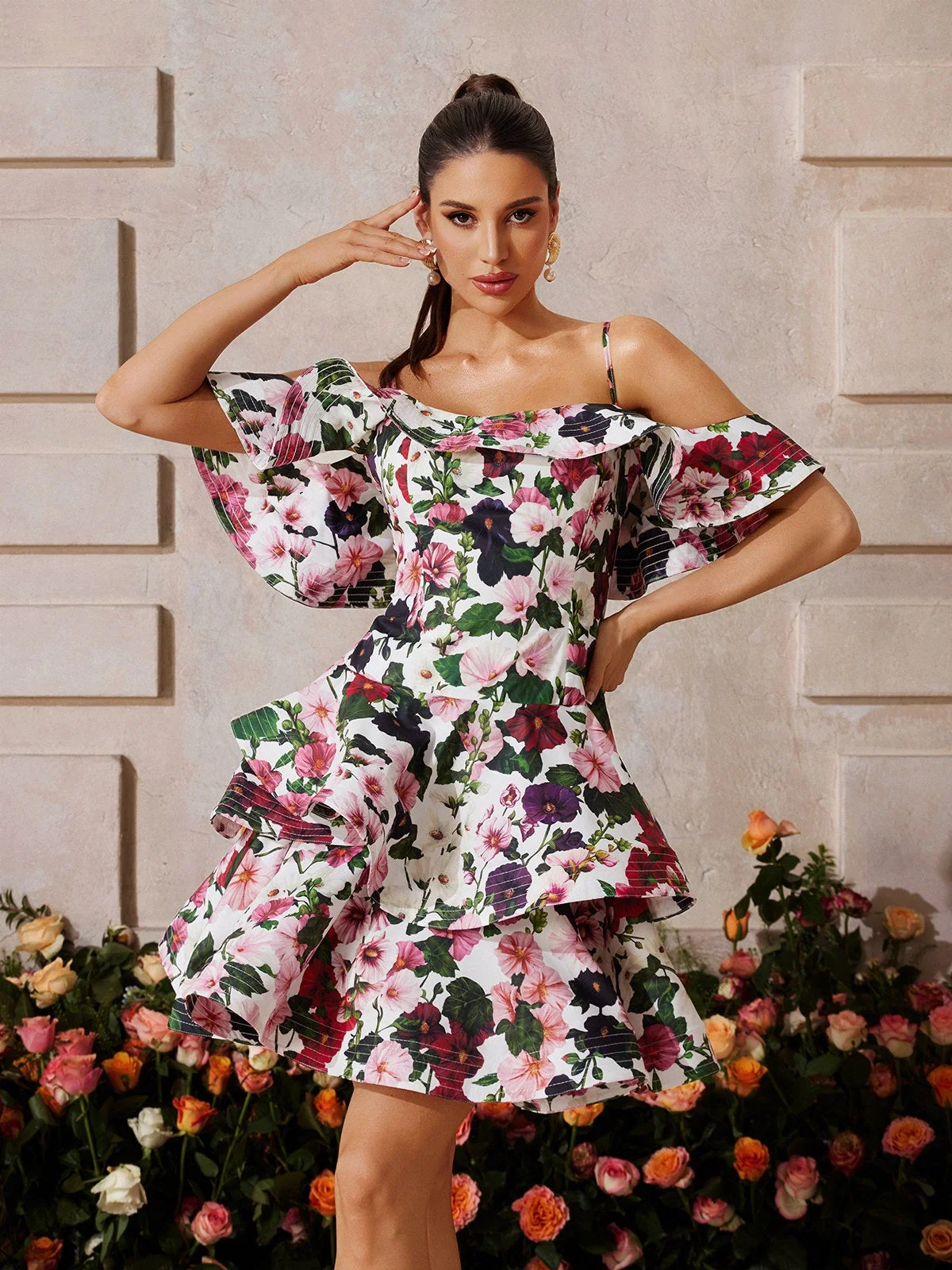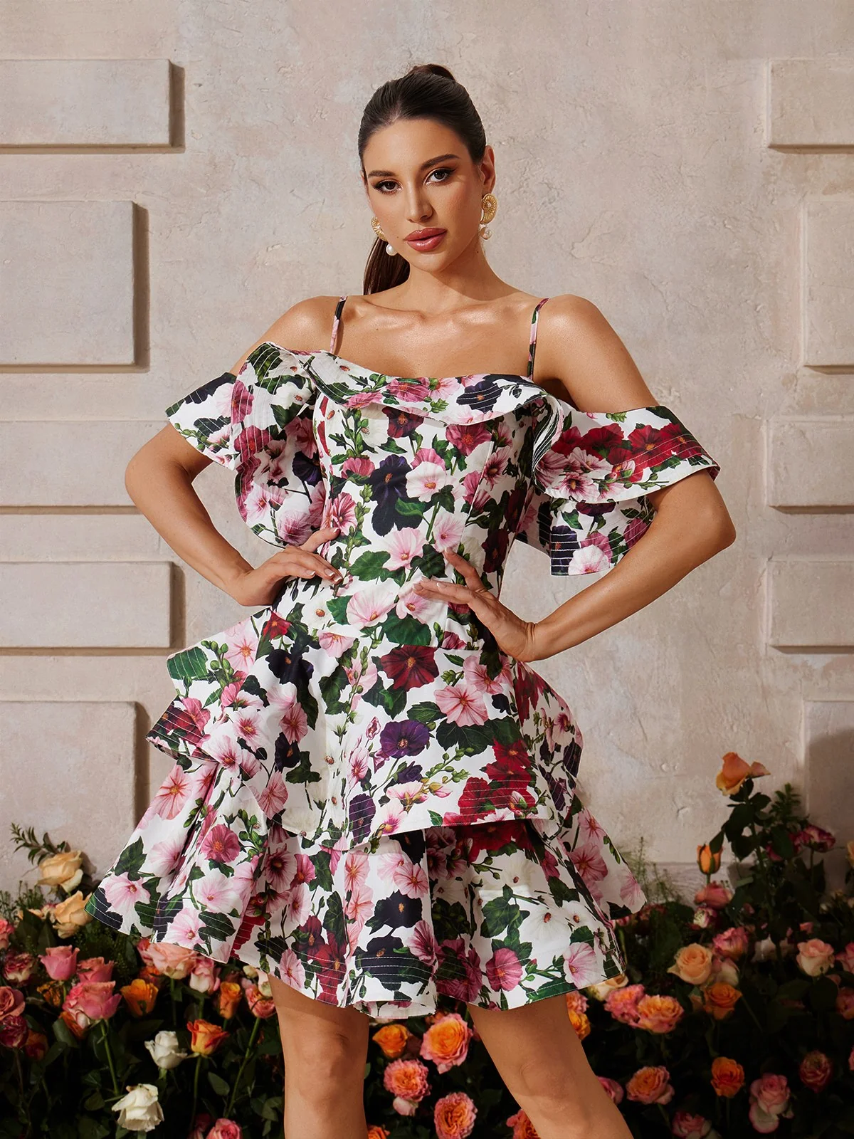 Elevate your style with our Floral Tiered Off-Shoulder Mini Dress. This dress features a delicate floral pattern, a tiered design for a flirty silhouette, and an off-shoulder neckline that exudes charm. Perfect for warm days or special occasions, this dress is crafted from 100% Polyester with a slight stretch for comfort. Dry clean only. Light may affect color perception. Choose from Slight Stretch. Choose from 4 sizes: S, M, L, XL. Model wearing size S.