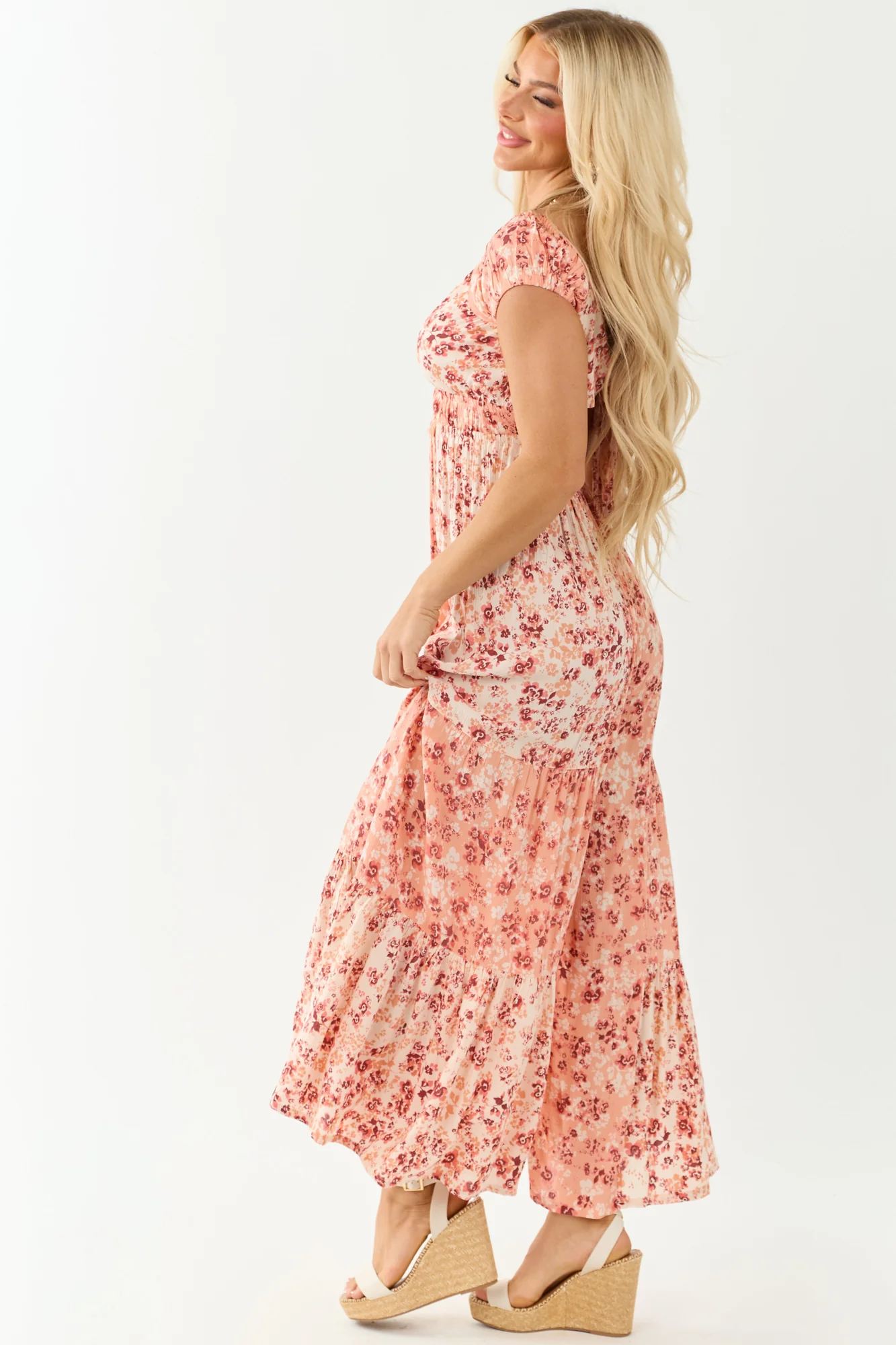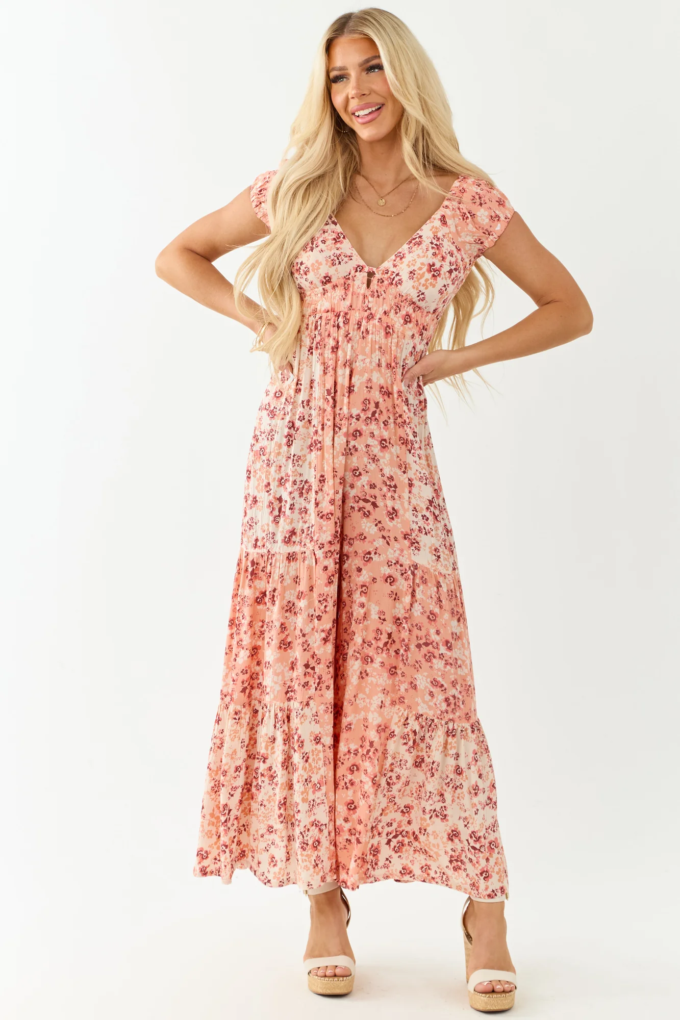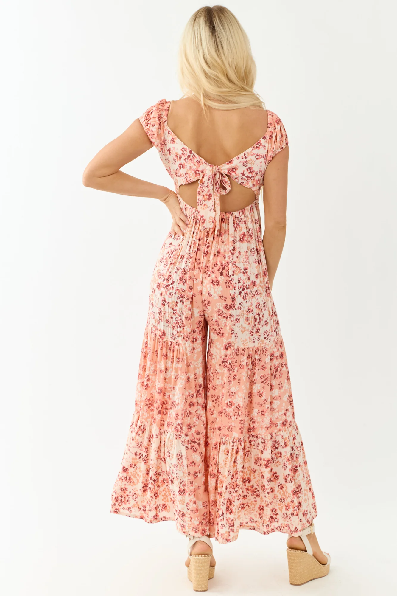 Experience the allure of soft florals in this charming tiered jumpsuit. Designed with an open back and adjustable tie, this jumpsuit features fitted stretchy waistband for a true-to-size fit. Made of 100% Rayon, it offers comfort and style. With elastic shoulders and cuffs and a chic pattern in Coral, Burgundy, and Punch shades, this jumpsuit is perfect for a stand-out look. The bust elastic strap with cut-out detail adds a touch of elegance. Unlined and comfortable, it is suitable for various occasions. Available in Small, Medium, and Large sizes.