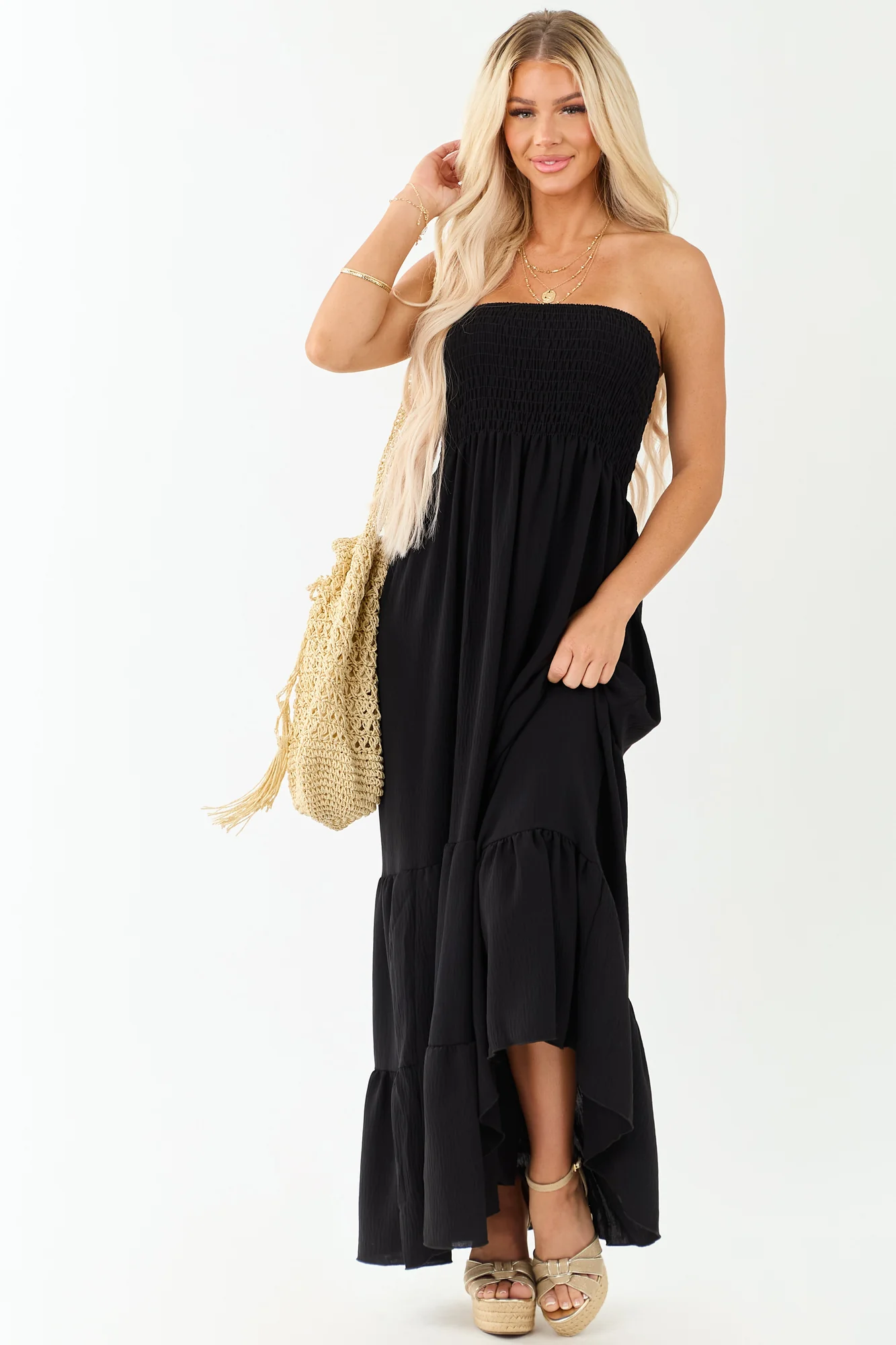 This black smocked maxi dress is a versatile one-piece outfit suitable for any occasion. The smocked bodice provides a flattering fit, while the flowy skirt adds elegance to your look. Made of 100% polyester, it features a stretchy bodice and comes unlined. Perfect for various sizes, with garment specs for size small (Bust: 28″, Waist: 26″, Length: 50″). Model is wearing a size Small – Size 1, Height 57″, Bust 34″, Waist 26″.