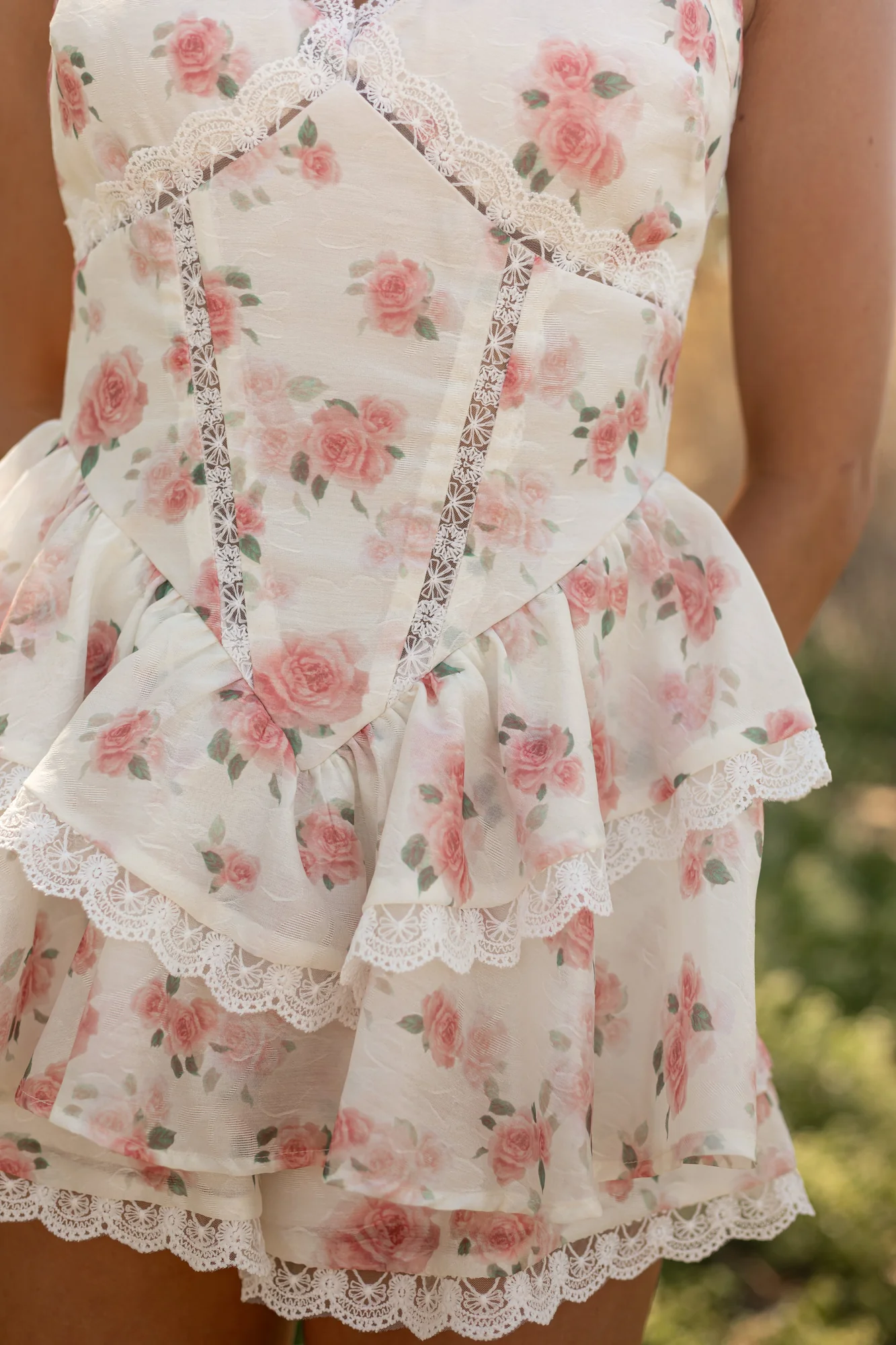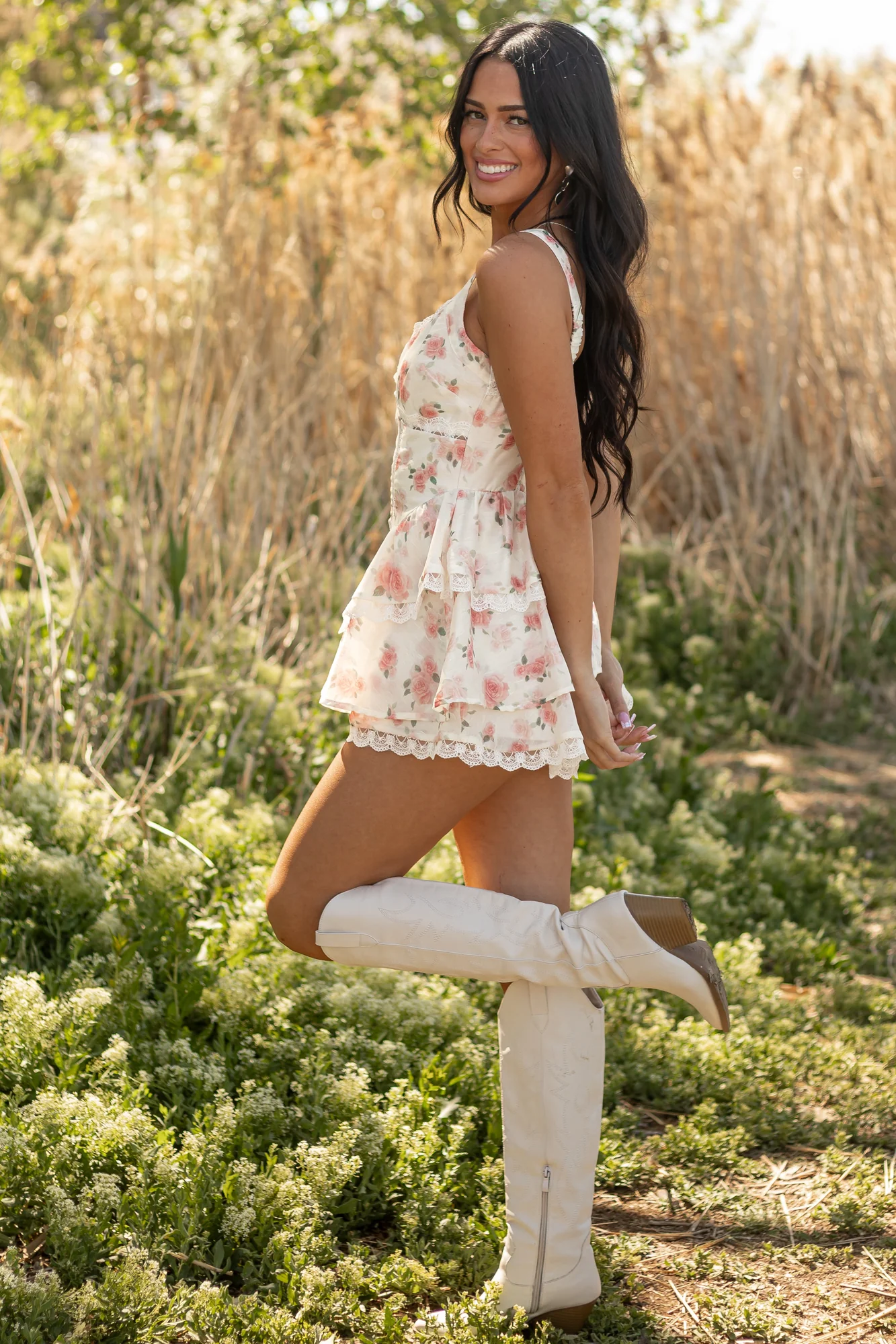 Embrace sunny days in style with this dreamy Flowy Cream Floral Lace Romper. The loose fit and soft fabric make it perfect for any occasion. Featuring elegant lace details in shades of Cream, Punch, Peach, Pine, and Ivory Off White. This romper comes with elastic straps, a back zipper with hook closure, and is fully lined for comfort. Ideal for those who love floral patterns, this romper is a must-have for your summer wardrobe. Note: Each piece is unique due to the print variation. Model is wearing size Small.