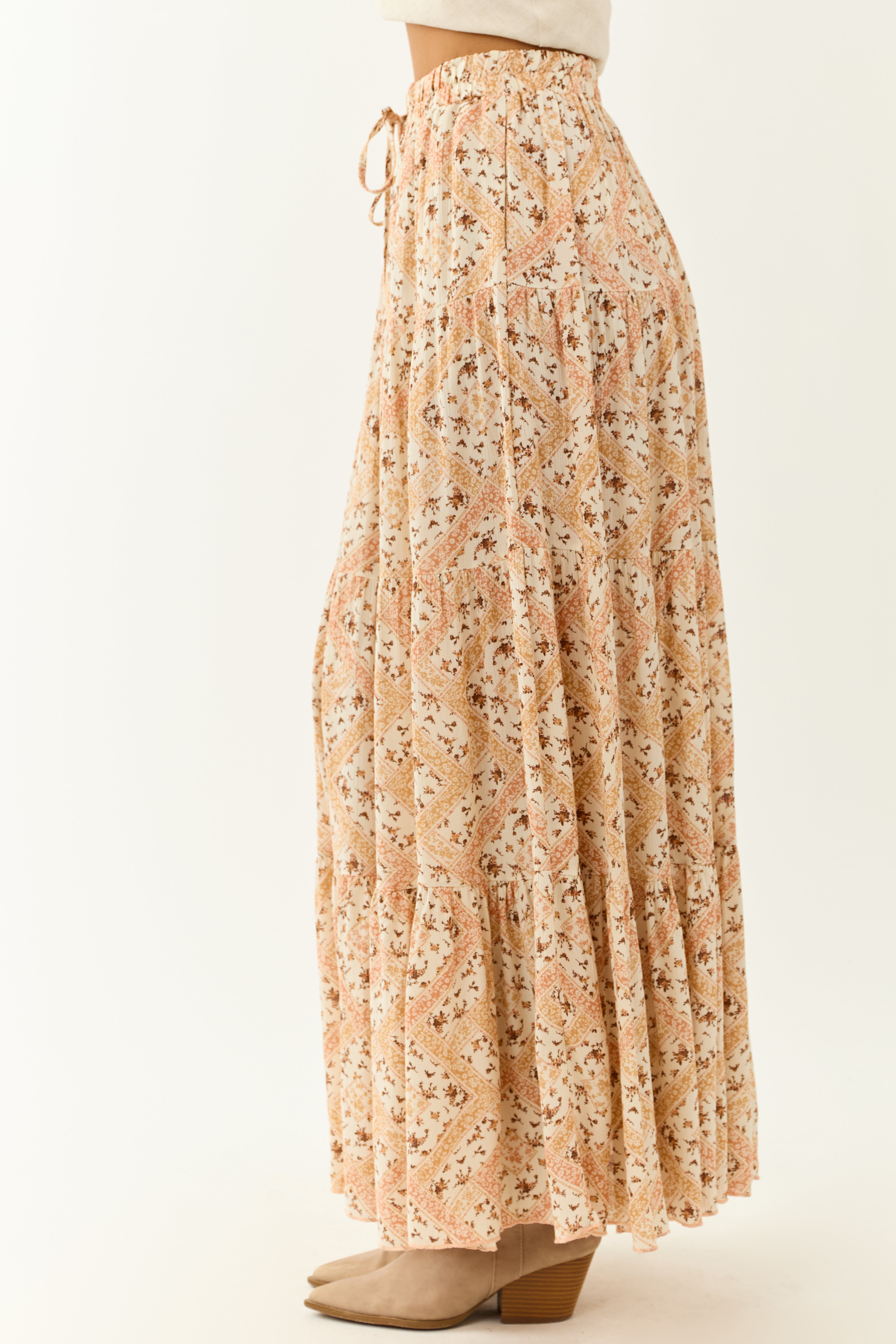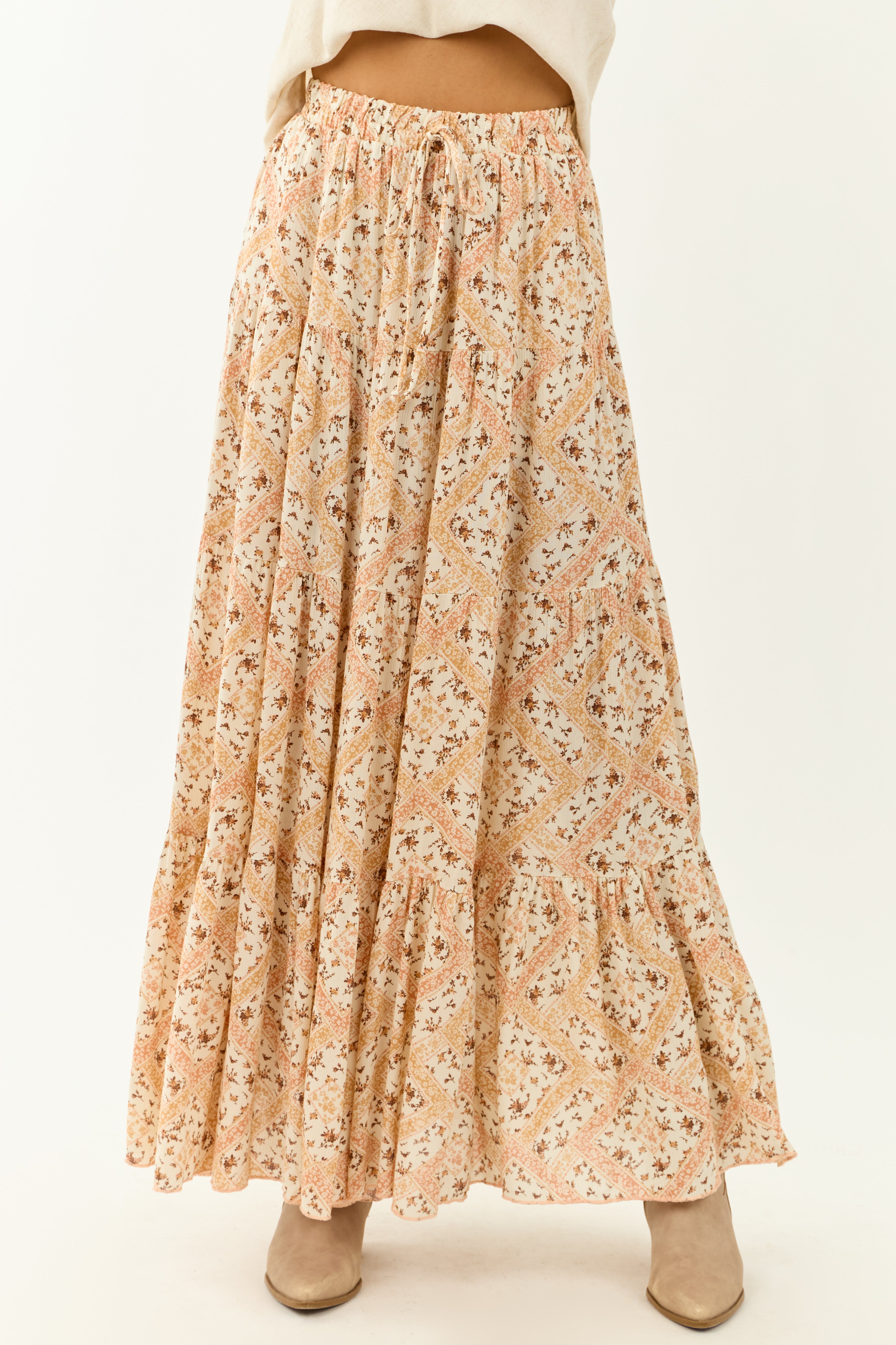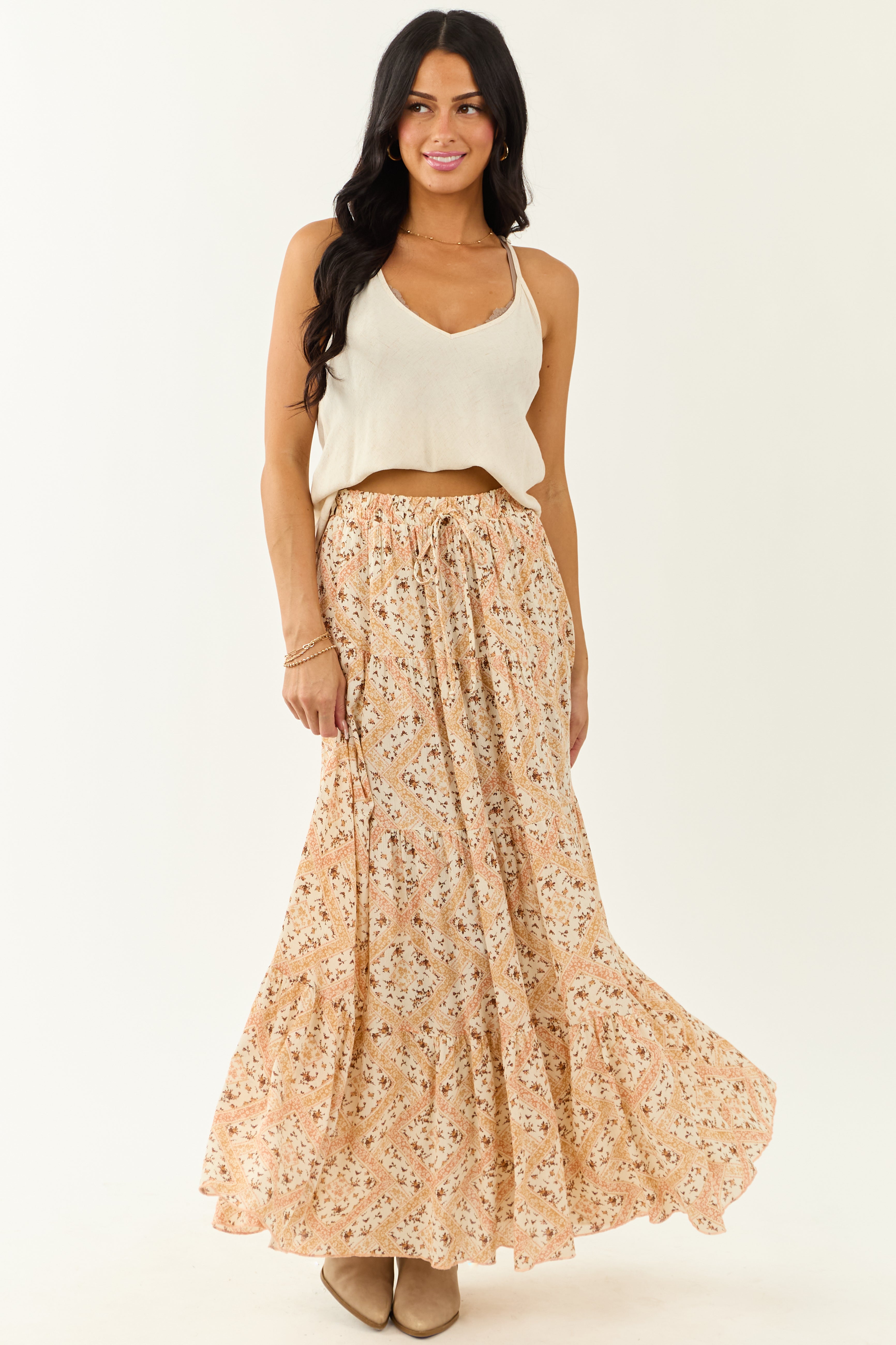 Embrace your feminine side with this lovely maxi skirt and Hearts. The elastic waistband offers a comfortable fit, while the decorative waist tie adds a stylish touch. Featuring a beautiful floral print in Peach, Coffee, and Melon hues, this skirt also includes convenient side pockets. Made from 100% Rayon in the USA. Model is wearing a size Small. Perfect for a chic and elegant look that blooms with style.