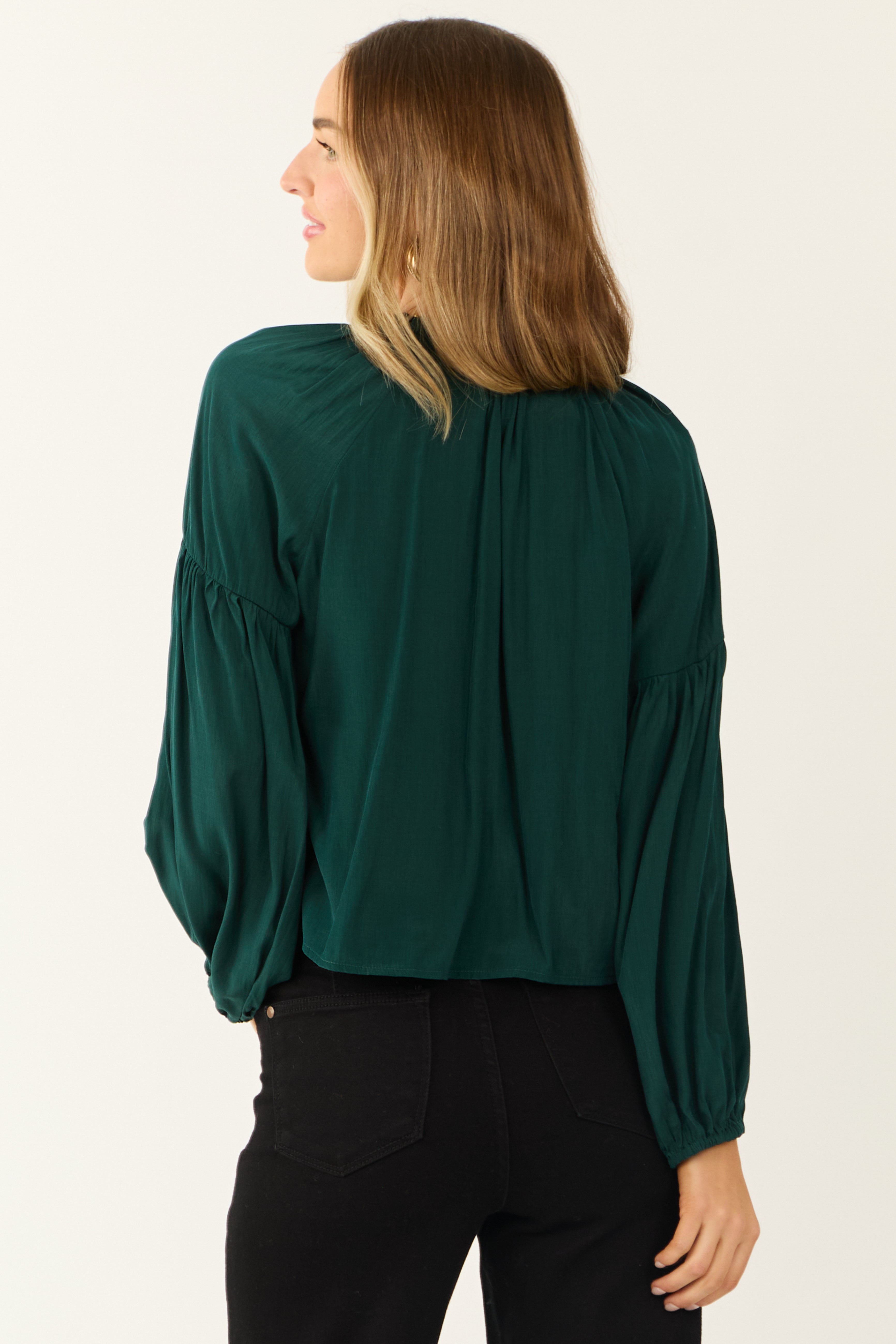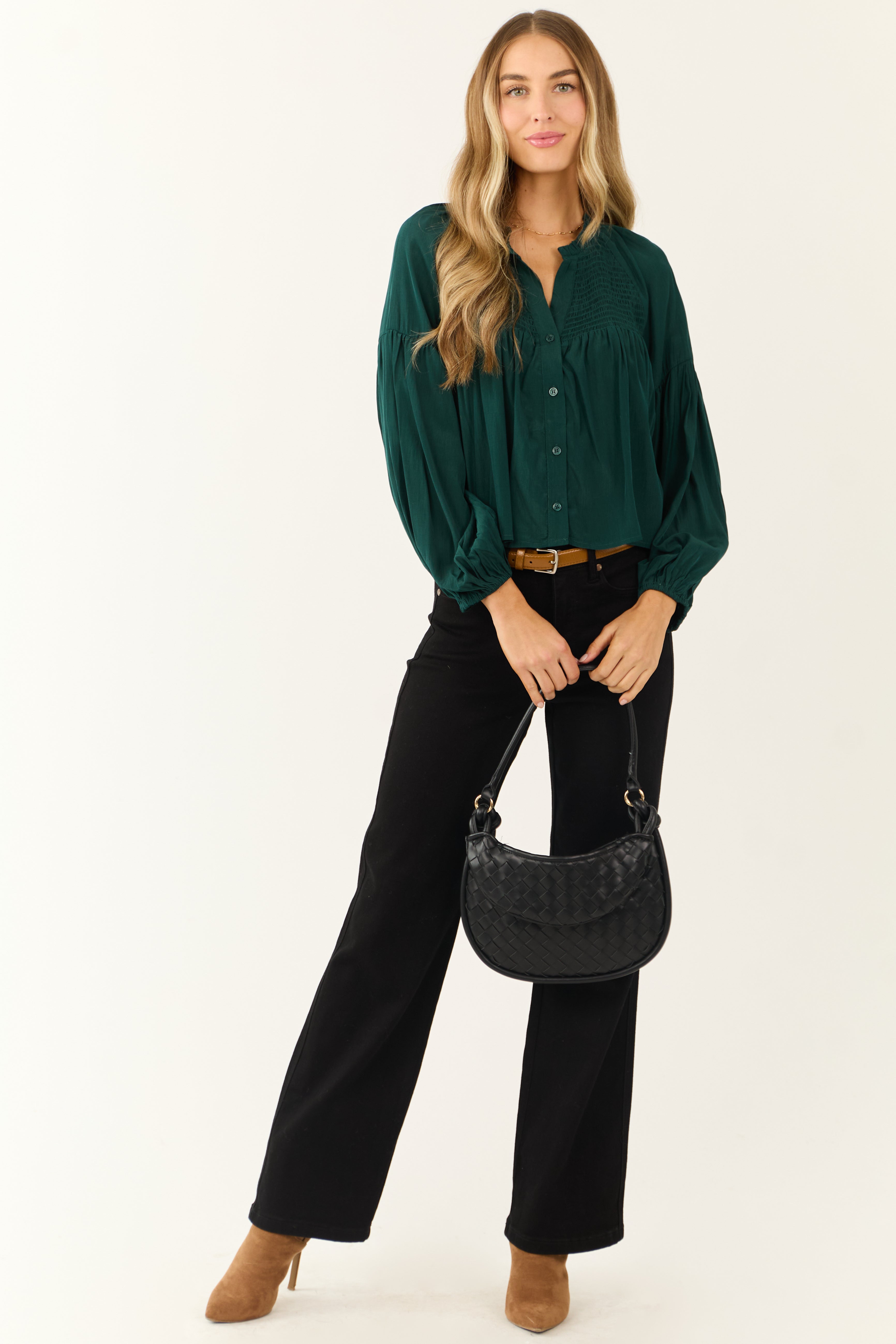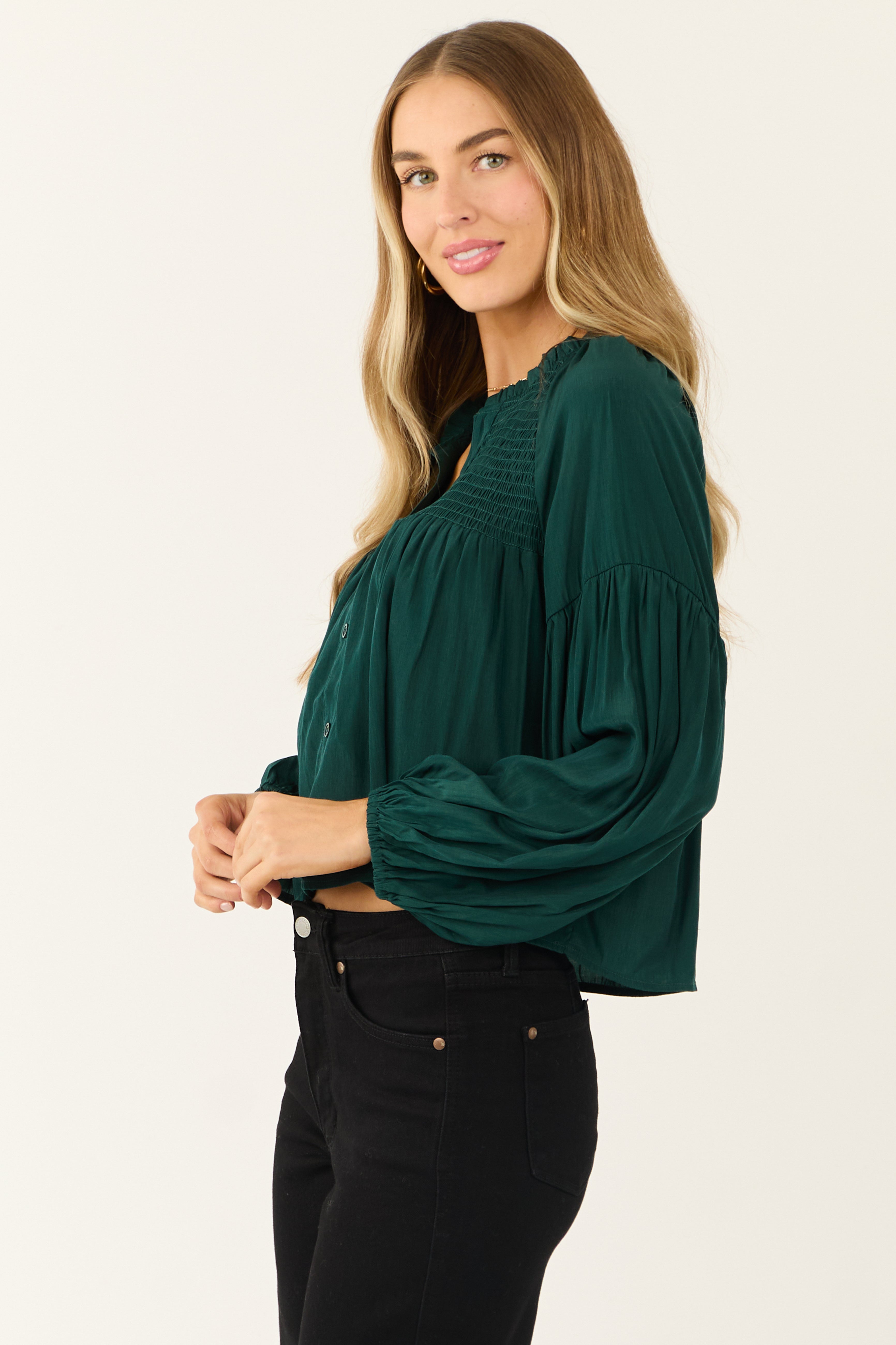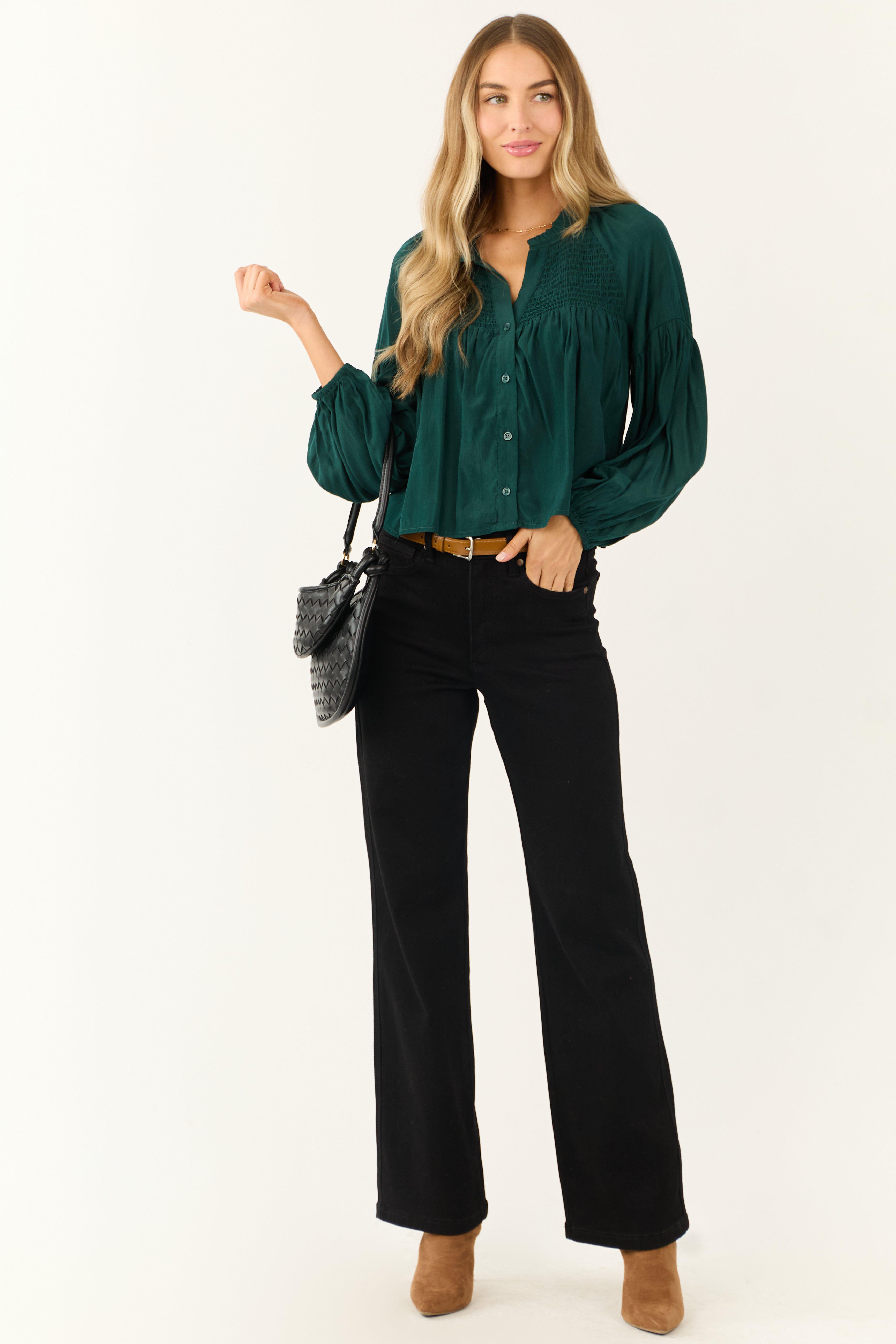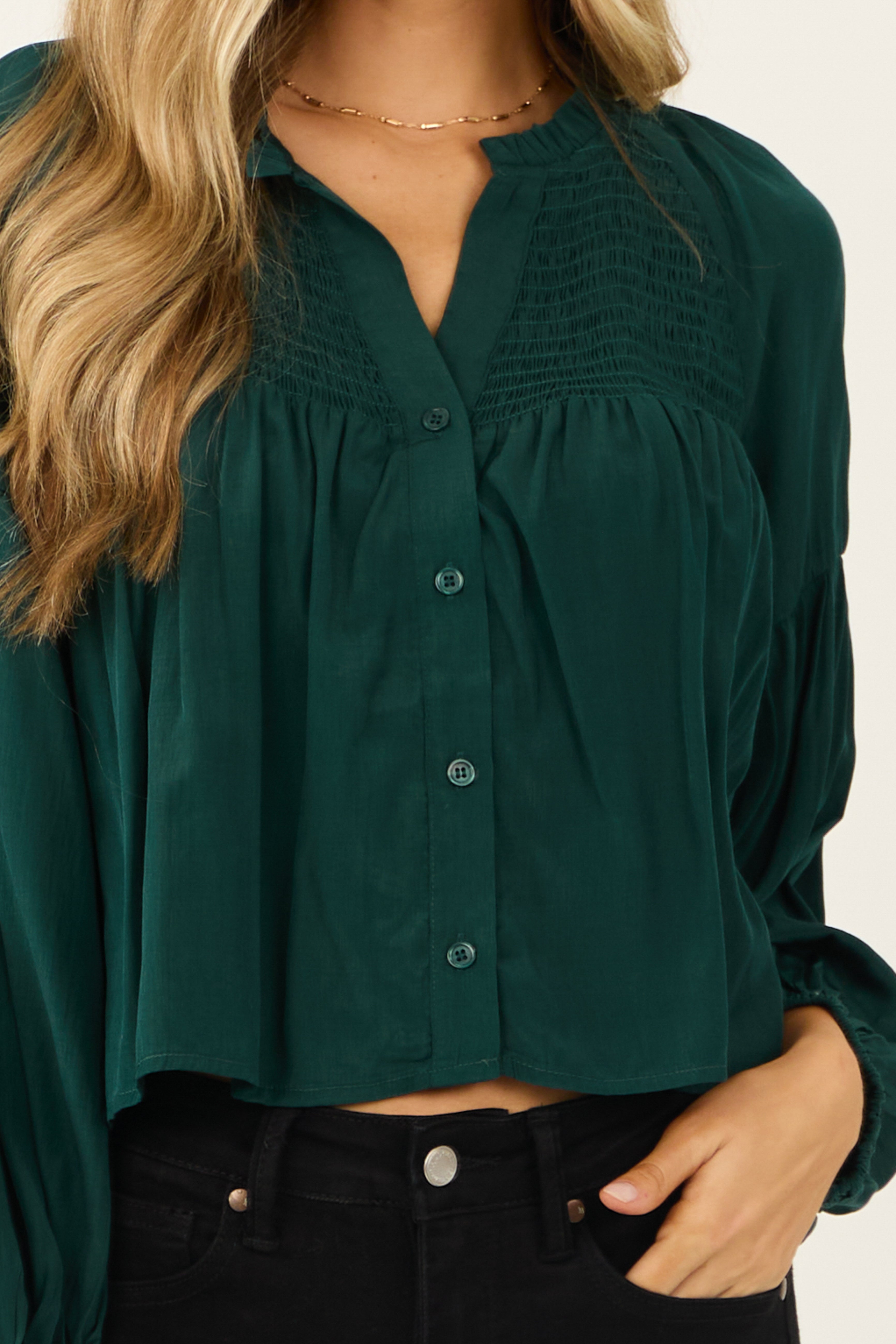 Experience effortless style with our Forest Green Button Up Long Sleeve Top. This flowy top features a round frill neckline, notched neckline, and long balloon sleeves with elastic cuffs for a chic look. Perfect for daytime wear, this semi-cropped top is unlined and made of 50% Polyester and 50% Rayon for a comfortable fit. Hand wash cold and hang dry to maintain its quality. Model is wearing a size Small. Bust: 40″ (S) 42″ (M) 44″ (L), Sleeve: 21″ (S) 21.5″ (M) 22″ (L), Length: 19″ (S) 19.5″ (M) 20″ (L).
