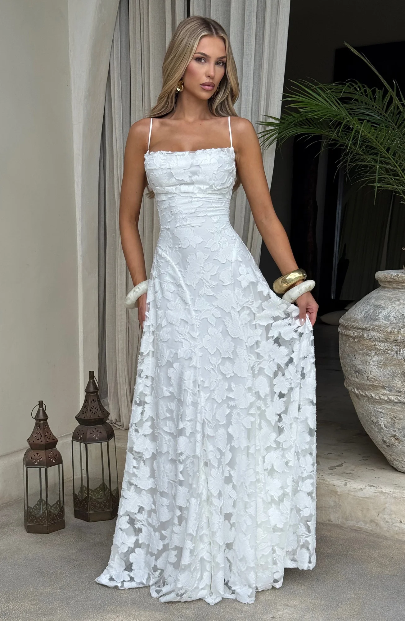 Elevate your style with the Flowy Ivory Maxi Dress by L.F. This stunning dress is crafted from custom-designed floral burnout jersey fabric, featuring a pleated cowl neckline, lace-up back, and godet panels for a graceful, flowy silhouette. Perfect for occasions like weddings, proms, parties, and more. Stay chic and comfortable all day long in this fully lined maxi dress with a cowl neck and elegant full skirt.