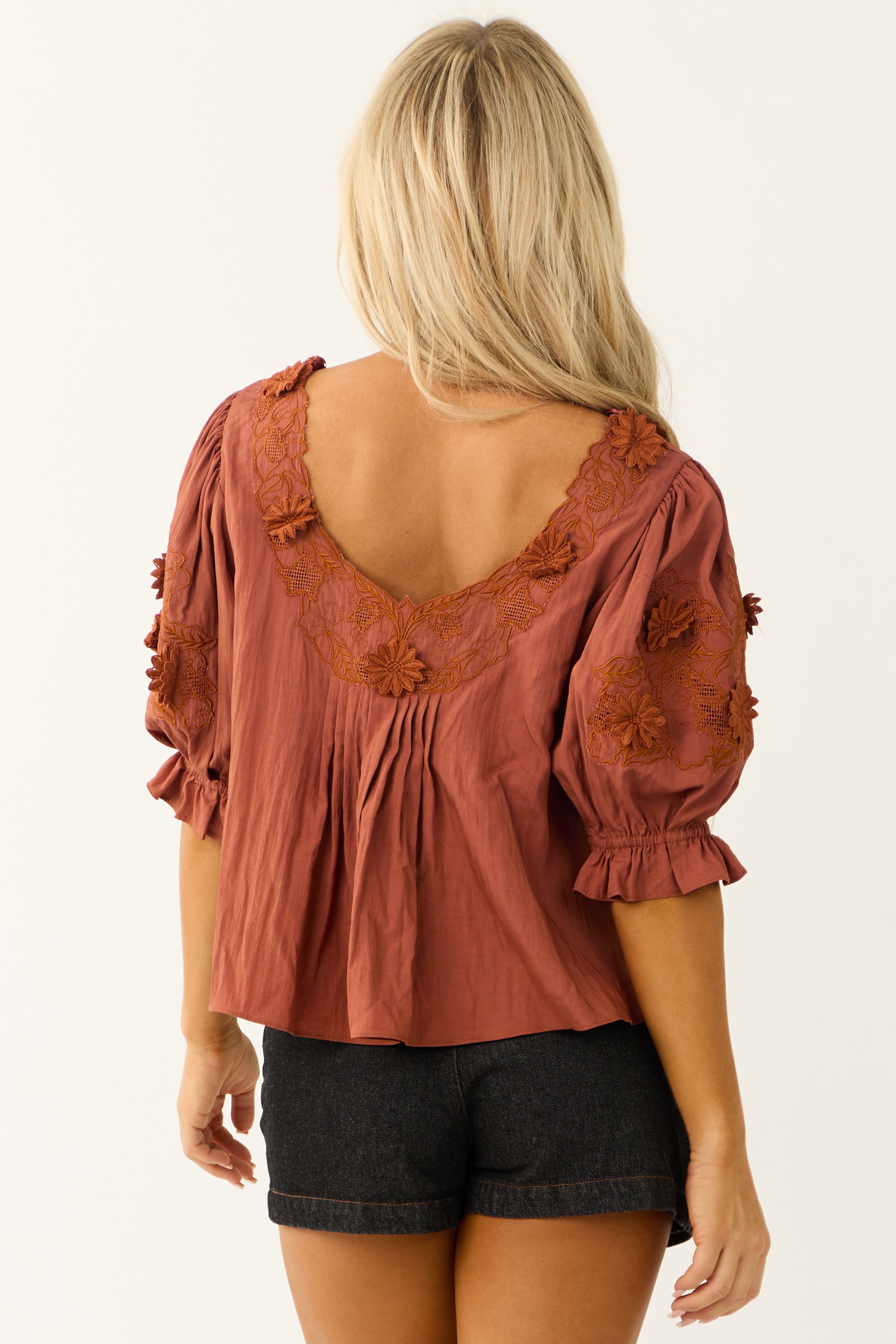 Indulge in the elegance of our Floral Embellished Blouse, offering a flowy fit with 3D floral appliqué details. Crafted from lightweight woven fabric in a warm pumpkin spice hue, this blouse features a V neckline, V back, and half puff sleeves. Pleating details under the neckline add a touch of sophistication. Unlined for comfort, this blouse is made from 70% Rayon and 30% Nylon, offering a chic and versatile addition to your wardrobe. Machine wash cold for easy care. Please note that variations may occur due to the cutting and sewing process. Model is wearing a size Small.