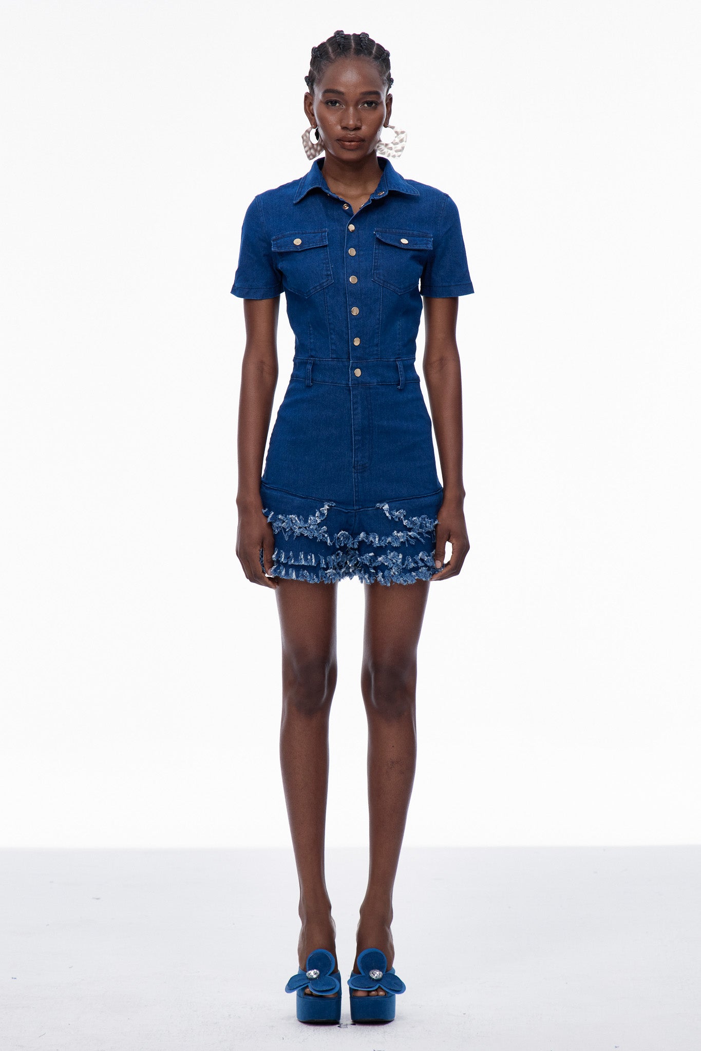 Step out in confidence with the Fringe Denim Bodycon Jumpsuit in blue. This sleek piece features distinctive fringe detailing that adds a bold, fashion-forward touch. Crafted from quality denim, it offers structure and comfort, making it perfect for events or casual outings. The form-fitting silhouette enhances your shape, while the fringe accents deliver dynamic movement, blending modern edge with classic denim appeal. Enjoy the non-stretch fit thats easy to care for with gentle machine wash. *Color may vary due to lighting on images.* Elevate your wardrobe with this fashion statement.