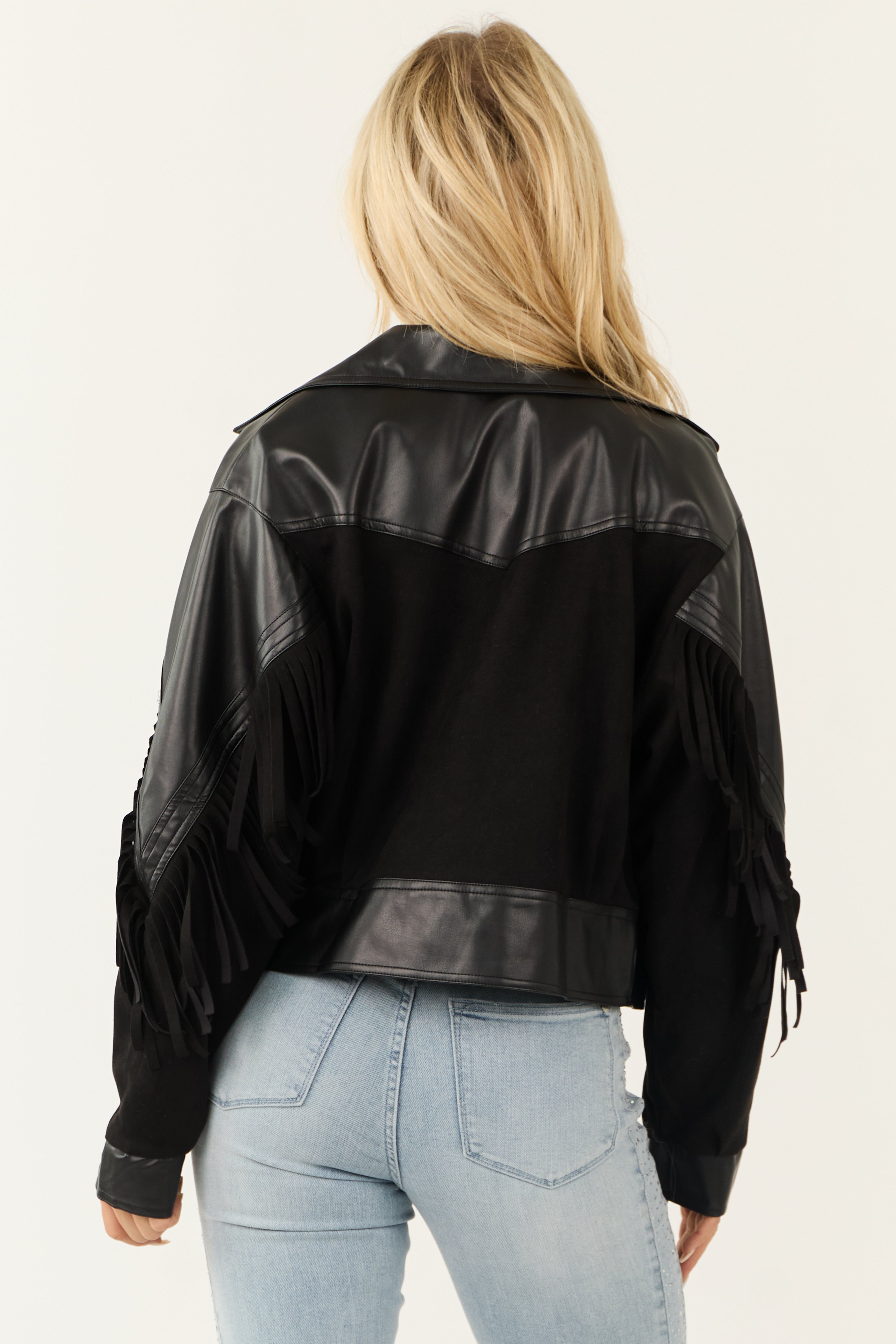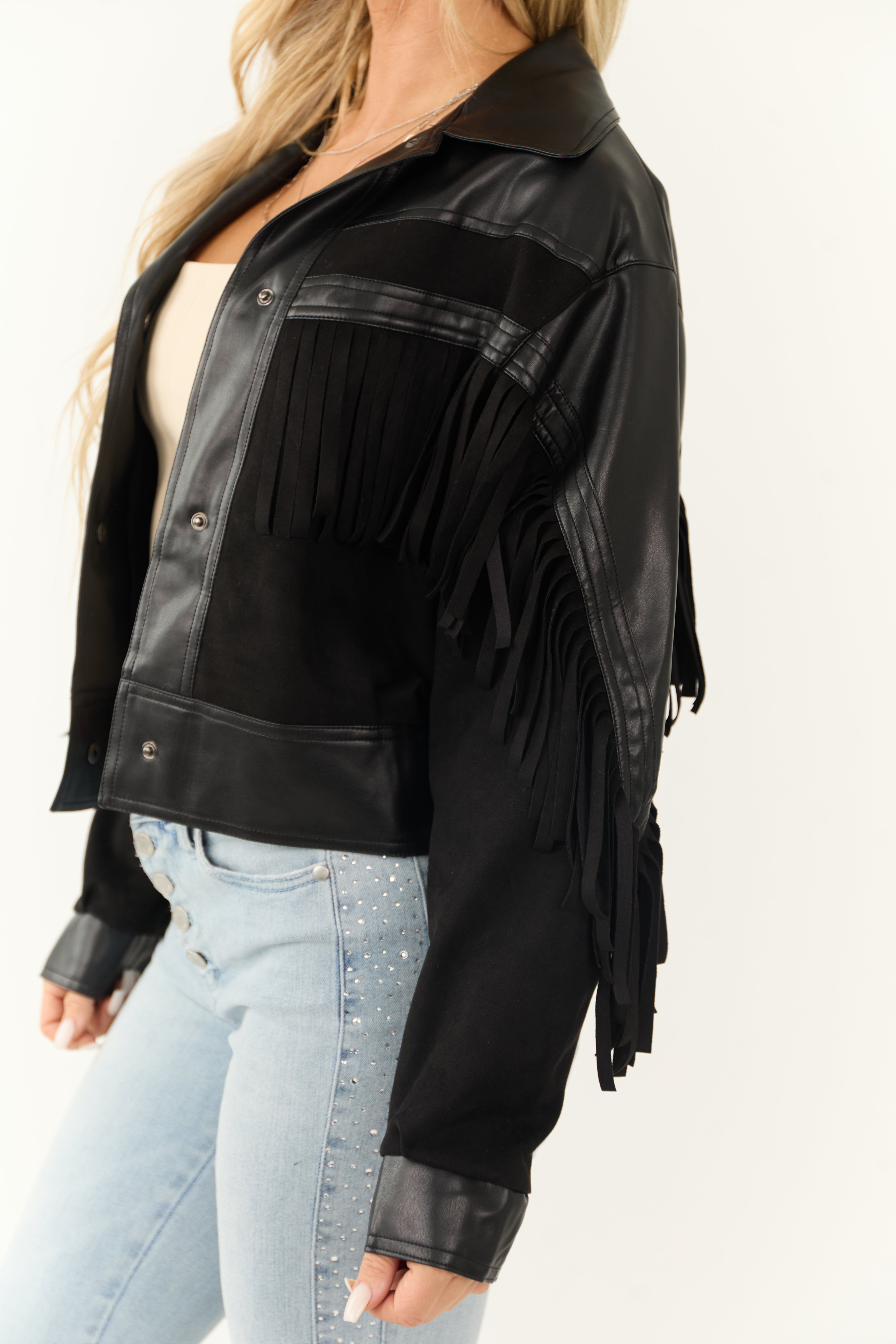 Stay warm and stylish in this trendy Fringe Detail Black Button Up Jacket. Made from non-stretchy faux suede and leather, featuring side pockets, a collared neckline, and long sleeves with faux leather trim. Available in sizes S, M, and L. Perfect for winter nights out. Hand wash cold for best care.