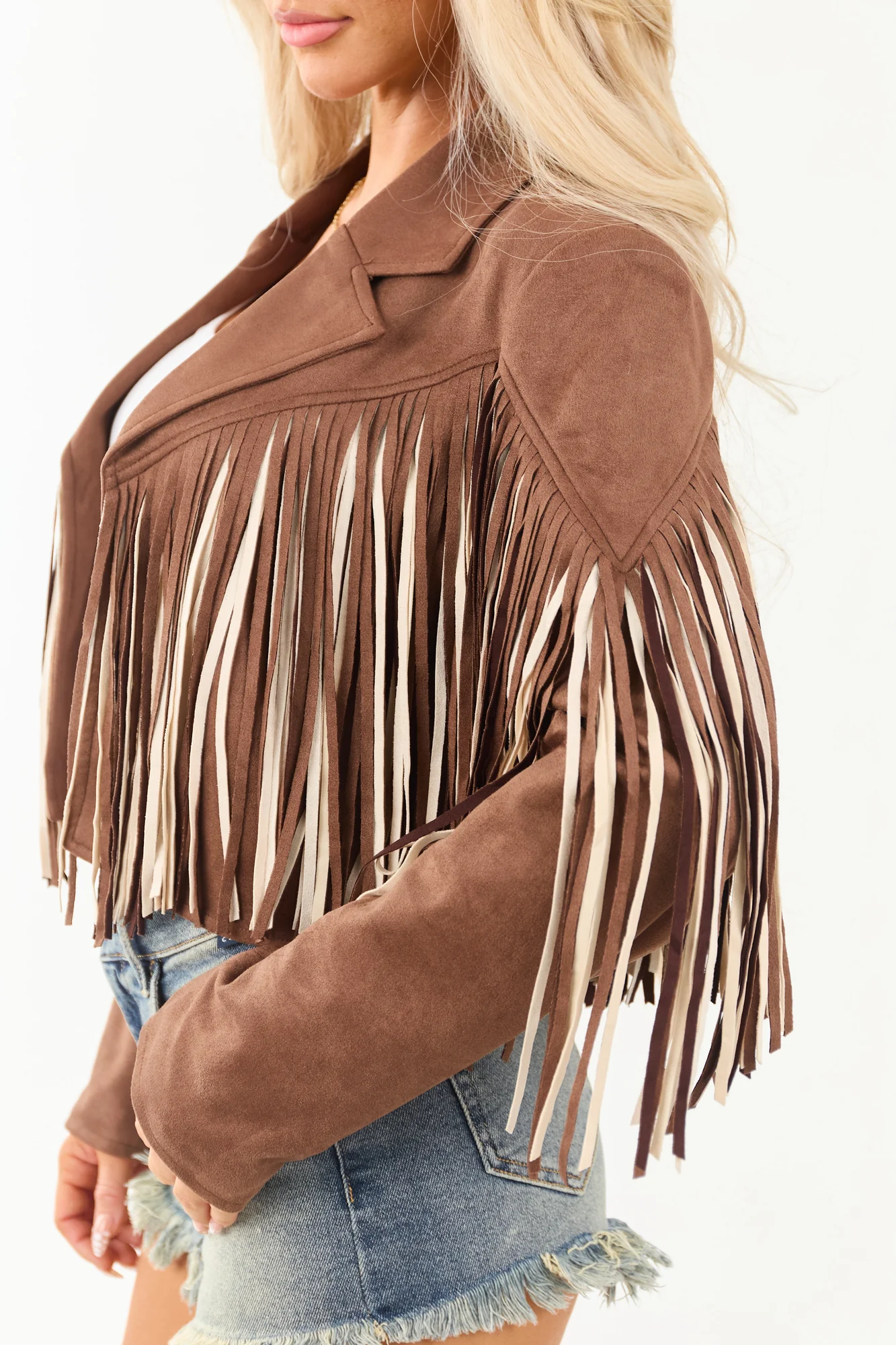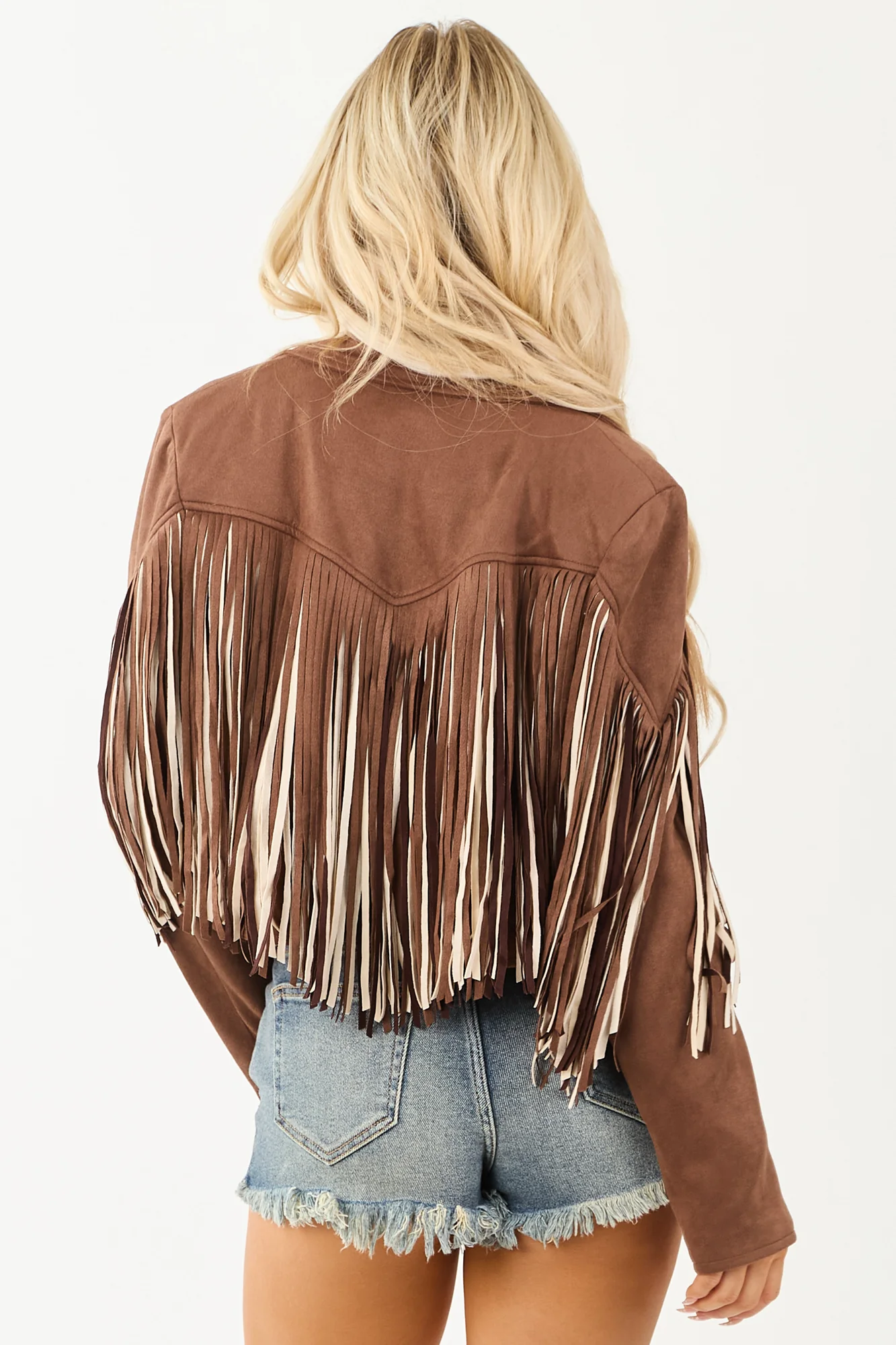 Make a style statement with this stunning fringe faux suede open front jacket in Walnut, Cocoa, and Champagne shades. Crafted from semi-stretchy faux suede with 90% Polyester and 10% Spandex. Stay comfortable and chic all day long. This fringe suede crop jacket is more than just an outfit – its a fashion statement. The jacket measures 21″ to 22″ in length and features sleeves ranging from 25″ to 26″. The lining is made of 100% Polyester. Imported. Available in sizes S, M, L. Model #1 is 59″ tall, bust size 34″, and waist size 26″. Model #2 is 57″ tall, bust size 35″, and waist size 26″.