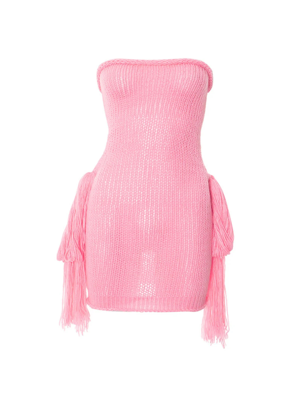 Elevate your style with the Fringe Knit Strapless Mini Dress in pink. This chic and figure-flattering dress features a playful fringe design for dynamic movement and texture. Made of 100% polyester with a slight stretch, this dress offers both comfort and style for a night out or special event. Stand out in this fashionable and cozy outfit. Product color may vary due to lighting. Machine wash cold. Available in sizes S, M, and L.