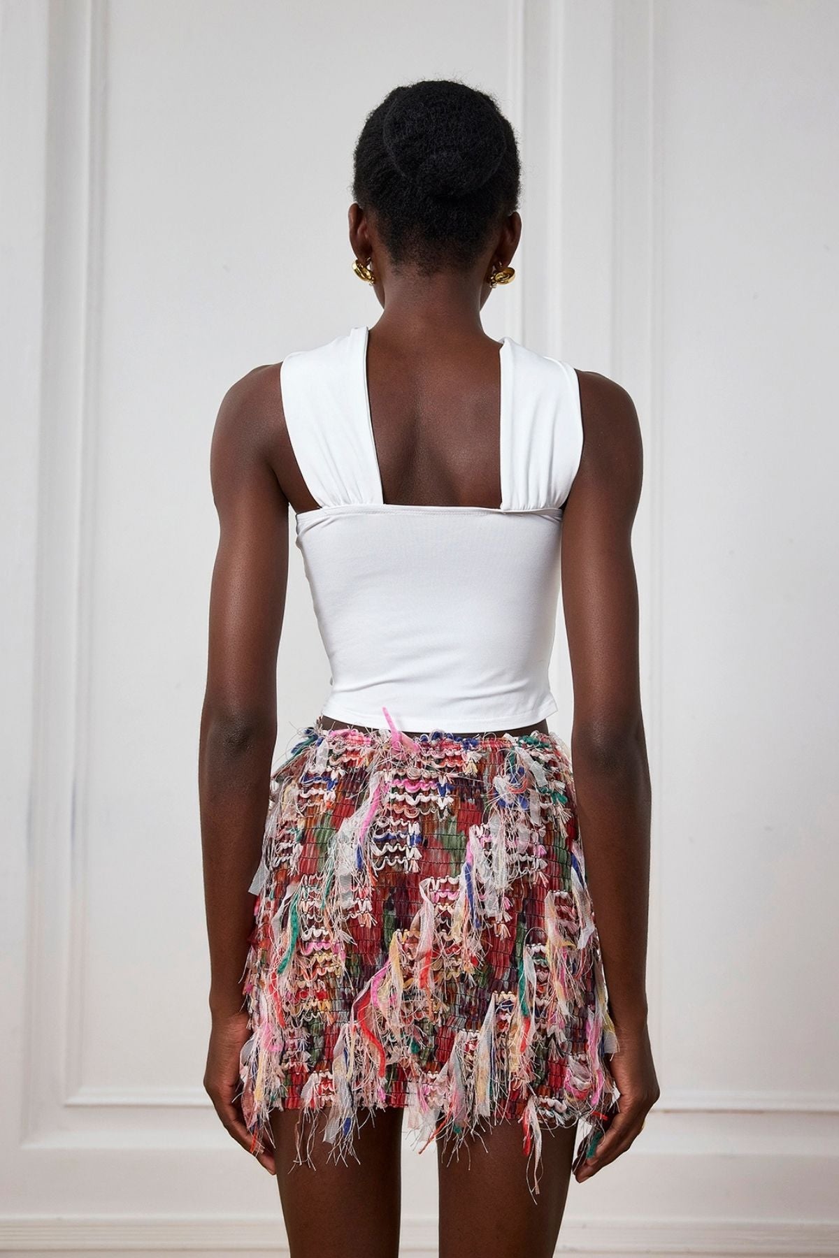 Experience a blend of elegance and playfulness with this unique Fringe Striped Mini Skirt in pink, black, or khaki. Designed for fashionable women, the skirt features delicate fringe detailing and bold stripes, adding a touch of flair to your outfit. Crafted with 100% Polyester fabric offering a slight stretch, this skirt ensures both style and comfort for various occasions, whether its a casual day out or a night on the town. Please note that colors may vary due to lighting. Care Instructions: Machine wash gently. *Disclaimer: Due to the material, some feathers may shed naturally.
