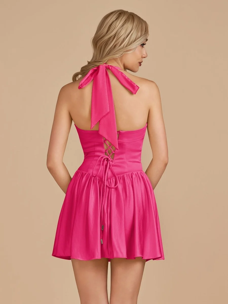 Elevate your style with this chic Fuchsia A-Line Satin Homecoming Dress featuring a flattering halter neckline. Perfect for homecoming, parties, or any special occasion, the lace-up back allows for a customizable fit while exuding elegance. Available in a range of vibrant colors including Aqua, Pink, and Royal Blue. Embrace your confidence with Undine! Silhouette: A-Line | Fabric: Satin | Length: Short | Neckline: Halter | Back: Lace-up