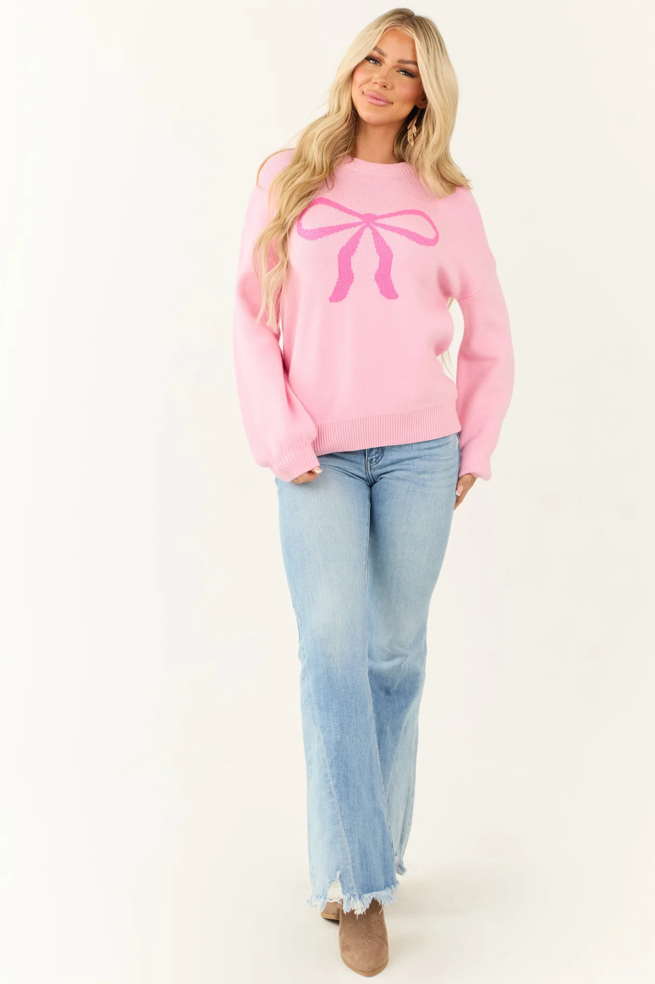Stay cozy and stylish in this charming Fuchsia Bow Graphic Puff Sleeve Sweater. Made of stretchy ribbed knit fabric with a bow graphic design, featuring long sleeves, banded trim, and drop shoulder fit. Crafted from 85% Acrylic and 15% Polyester. Perfect for daywear in the winter season. Care instructions: Line dry, iron on medium heat. Model details: Size Small, Bust 32″, Waist 25″. Available in sizes S, M, L, and XL.