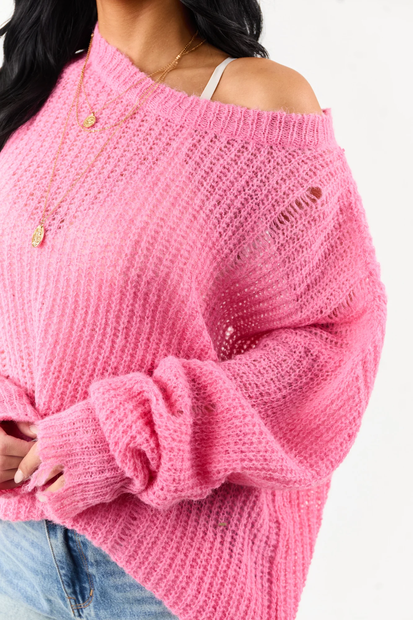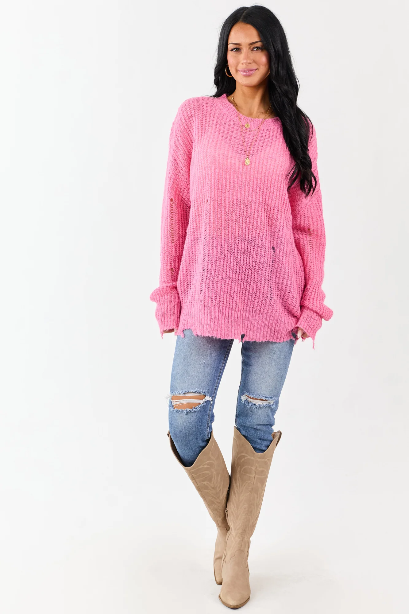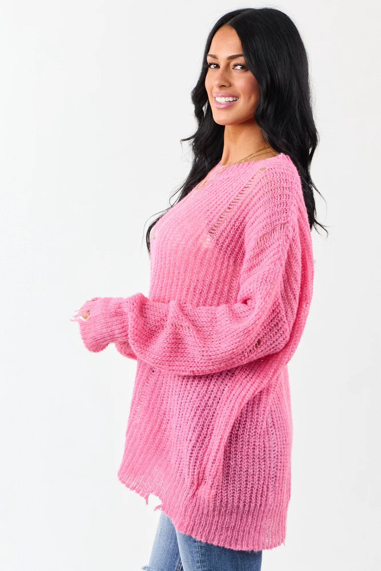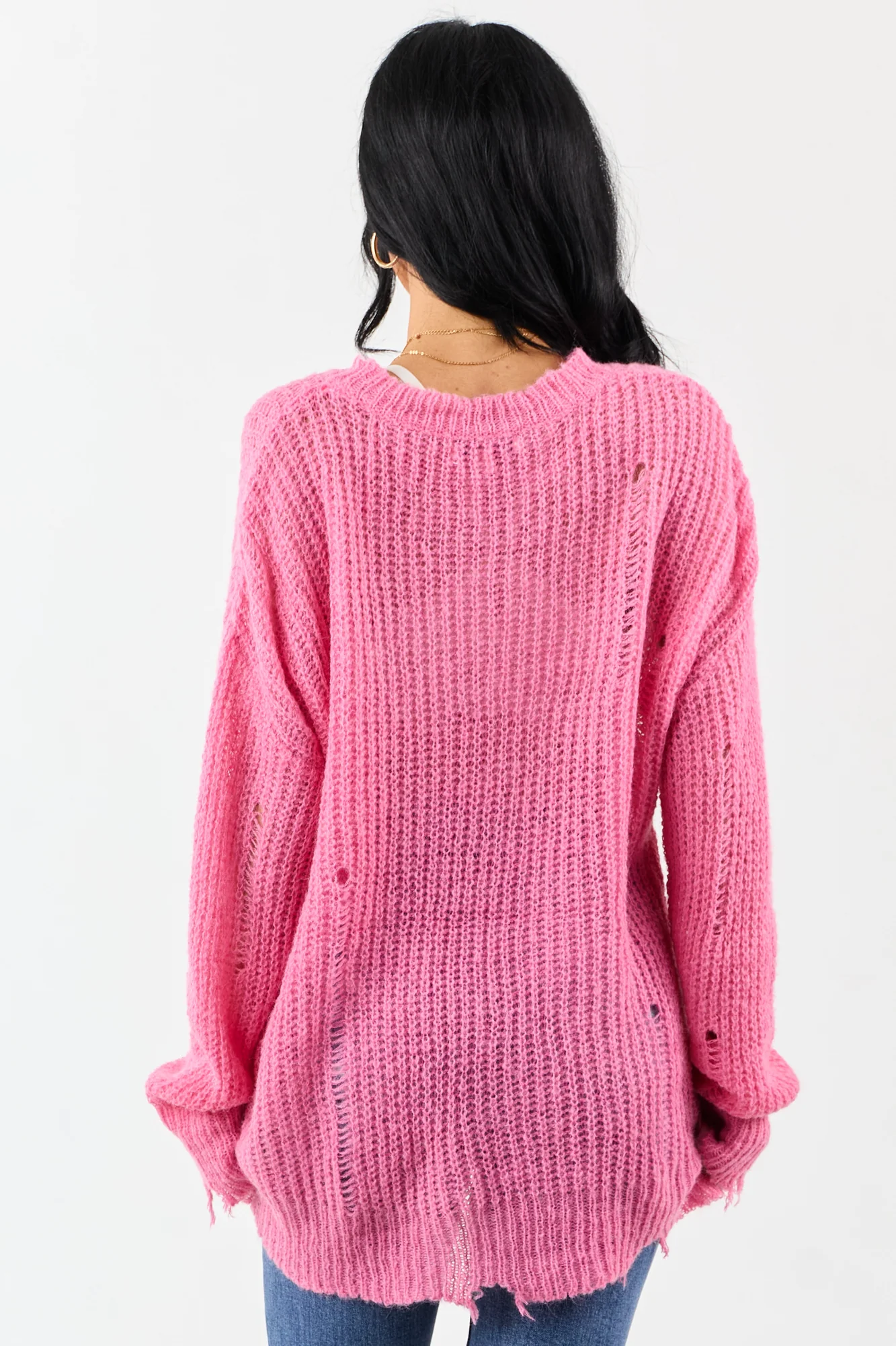 Experience the perfect blend of comfort and style with our fuchsia distressed ribbed knit sweater. Crafted from 80% Acrylic and 20% Wool, this sweater boasts a relaxed fit, oversized silhouette, and modern distressed accents for a trendy look. The stretchy ribbed knit ensures a comfortable wear, while the semi-sheer design adds a touch of allure. Whether youre out and about or lounging at home, this sweater is a versatile addition to your wardrobe. Available in sizes S, M, and L.