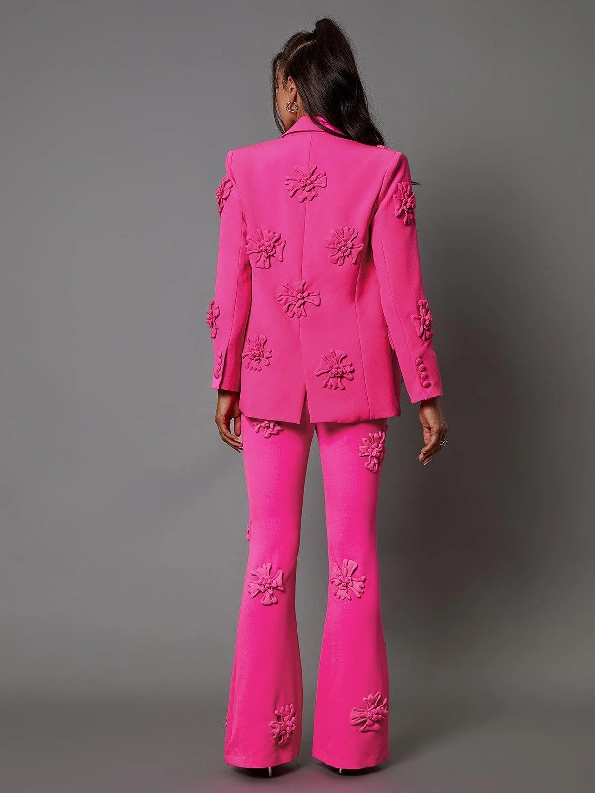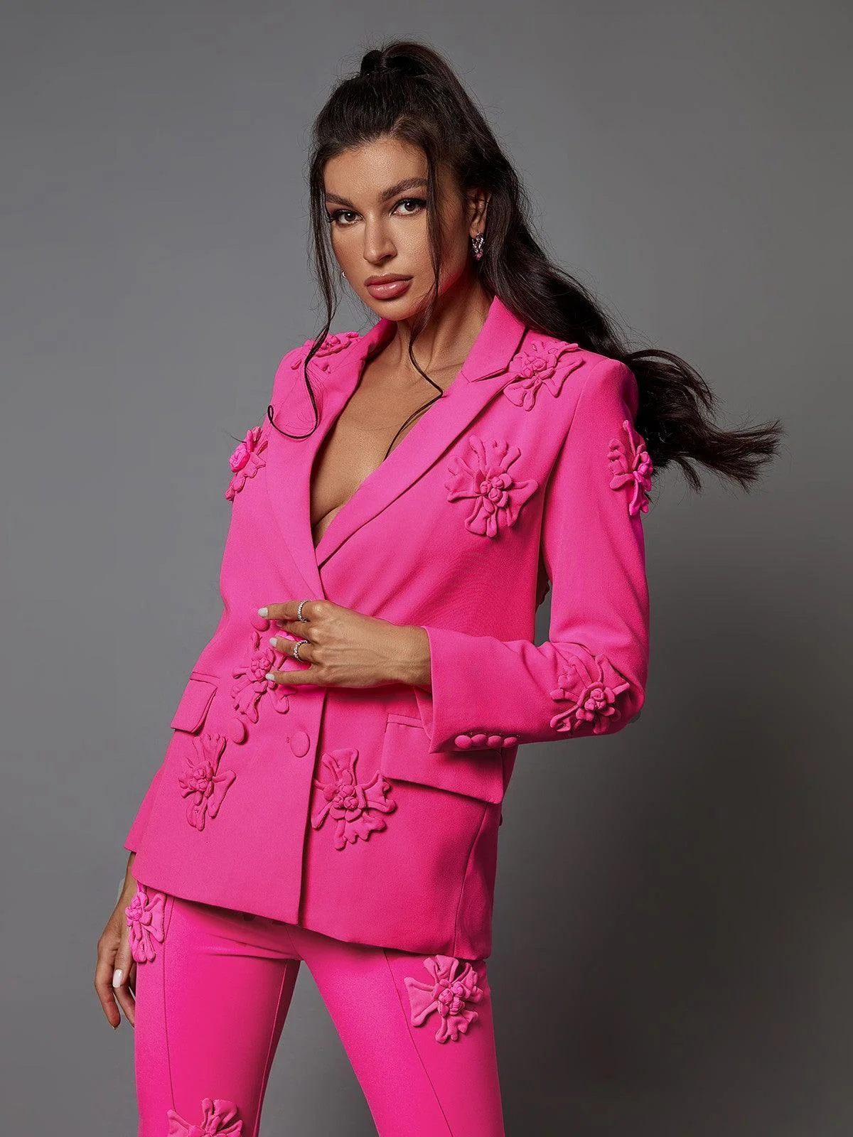 Make a chic statement in the Fuchsia Floral Blazer Set with exquisite embellishments. This sophisticated set from Li Fu boasts a stylish blazer in vibrant fuchsia, perfect for making a memorable entrance at any event. Crafted from 100% Polyester, this non-stretch blazer needs dry cleaning for care. Note: Both blazer and pants are sold separately.