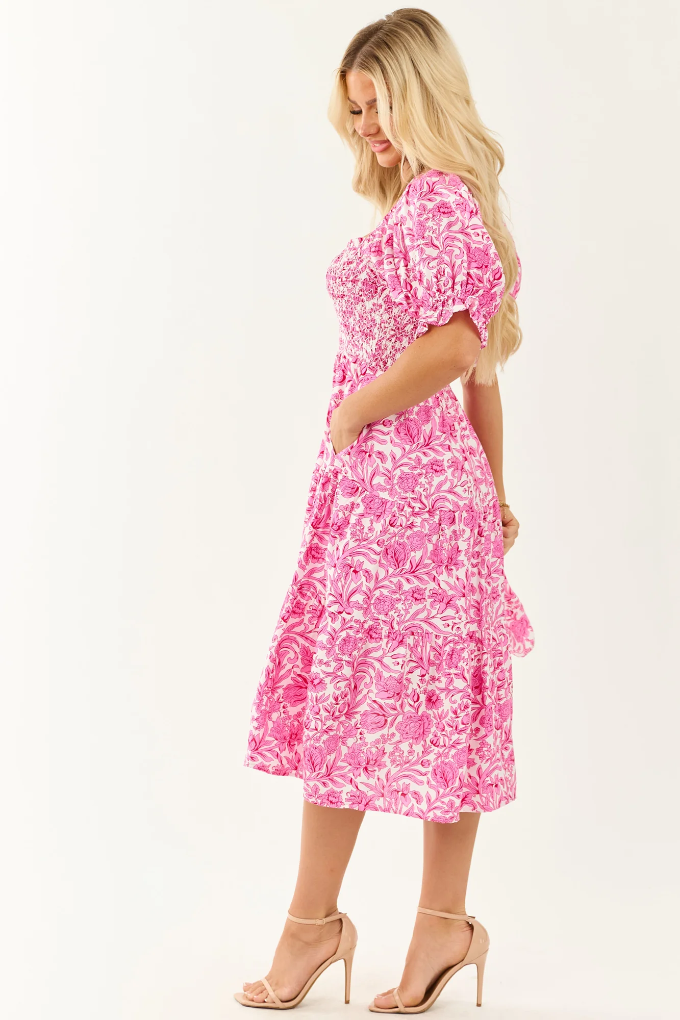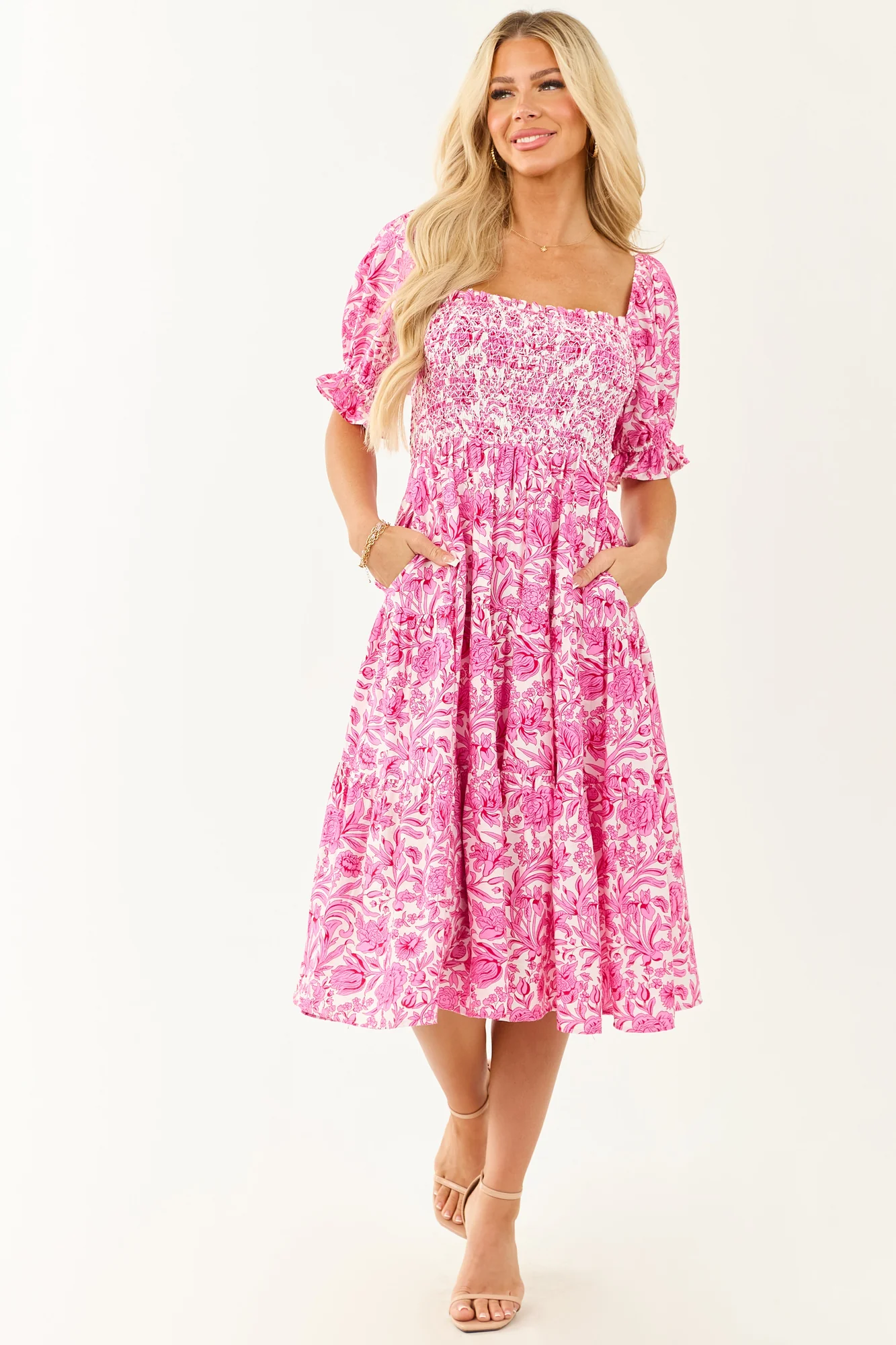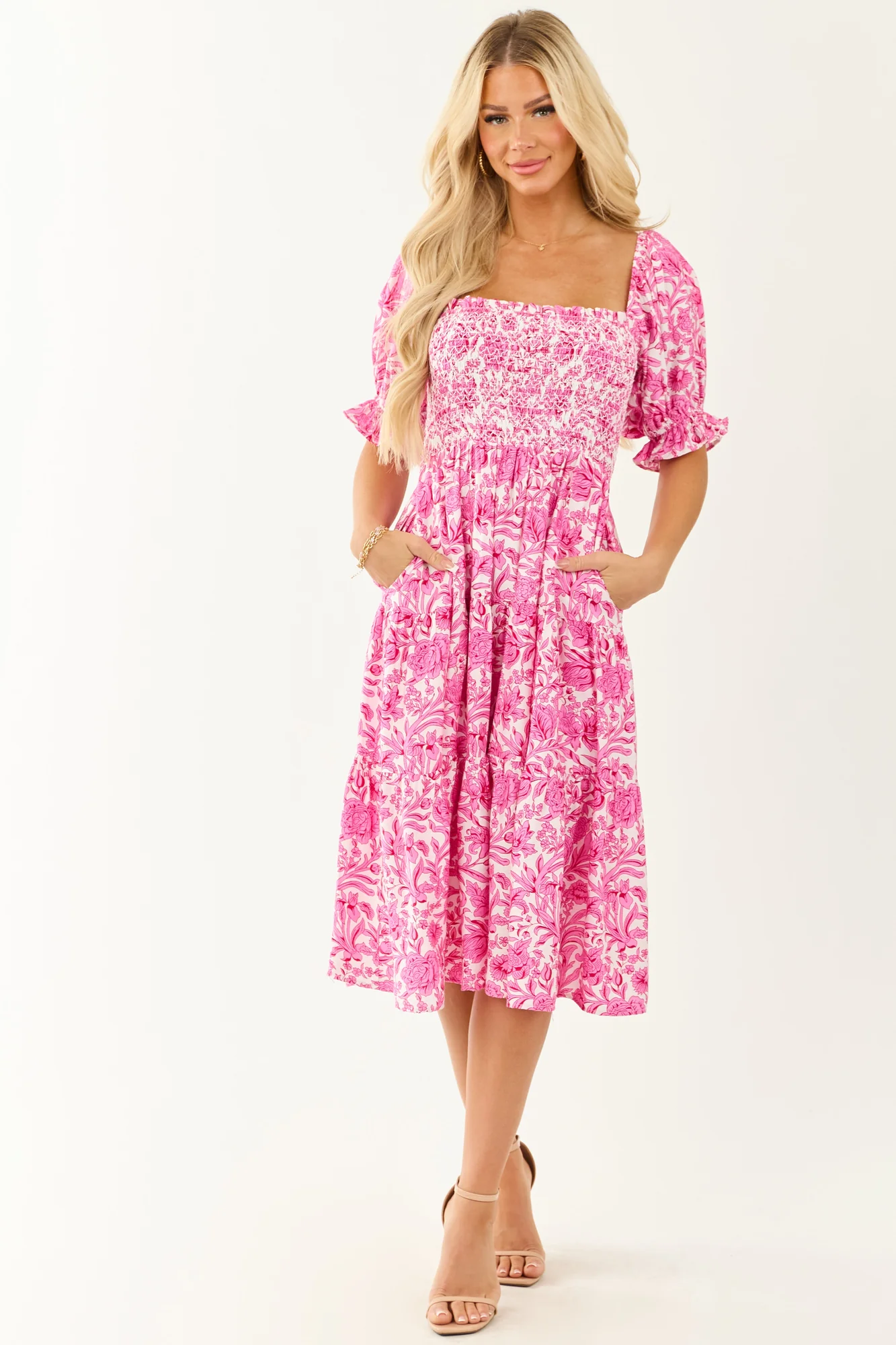 This stunning fuchsia midi dress boasts a flattering smocked bodice, romantic half sleeves, and a tiered skirt in vibrant floral hues of Fuchsia, Raspberry, and Ivory. Crafted from 100% Polyester with a lining of 97% Polyester and 3% Spandex, this dress offers a sleek and feminine fit. Ideal for various occasions, the dress features elastic cuffs and shoulders, side pockets, and is lined for comfort. With a bust size range from 31-40 inches and a waist size range from 23-32 inches, this dress comes in sizes XS to XL, fitting true to size. Get ready to turn heads and enjoy the breezy elegance of this statement piece.