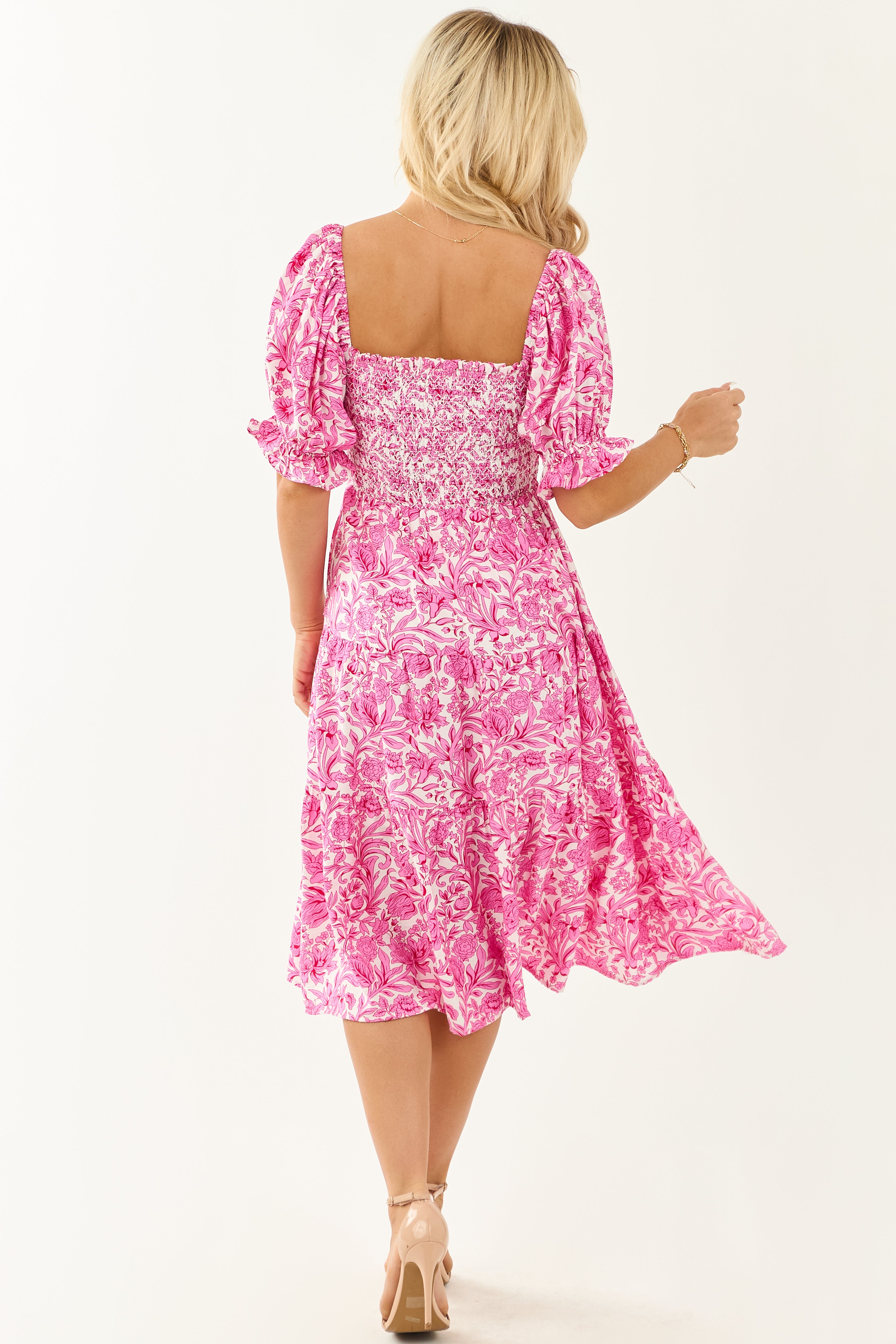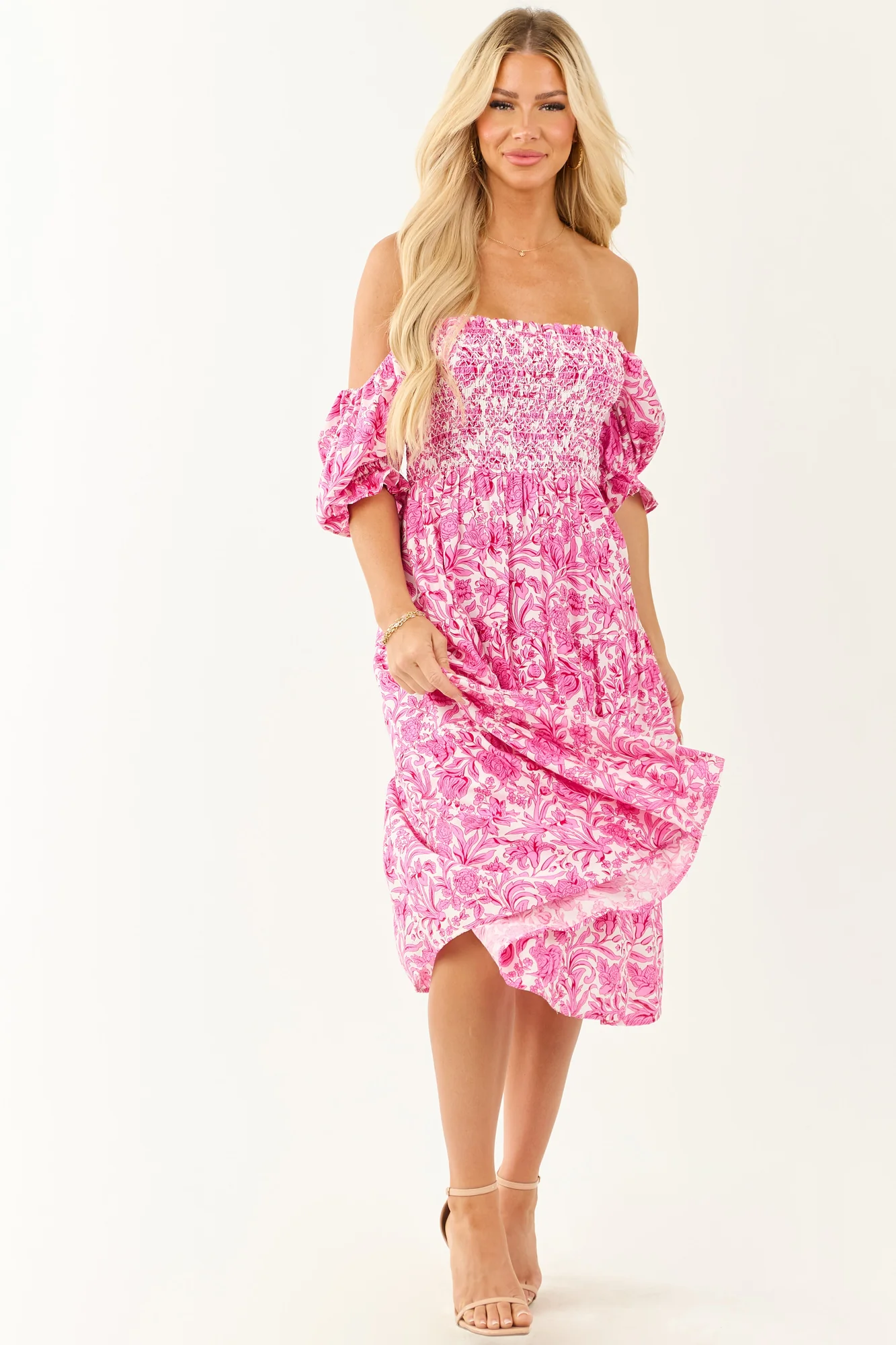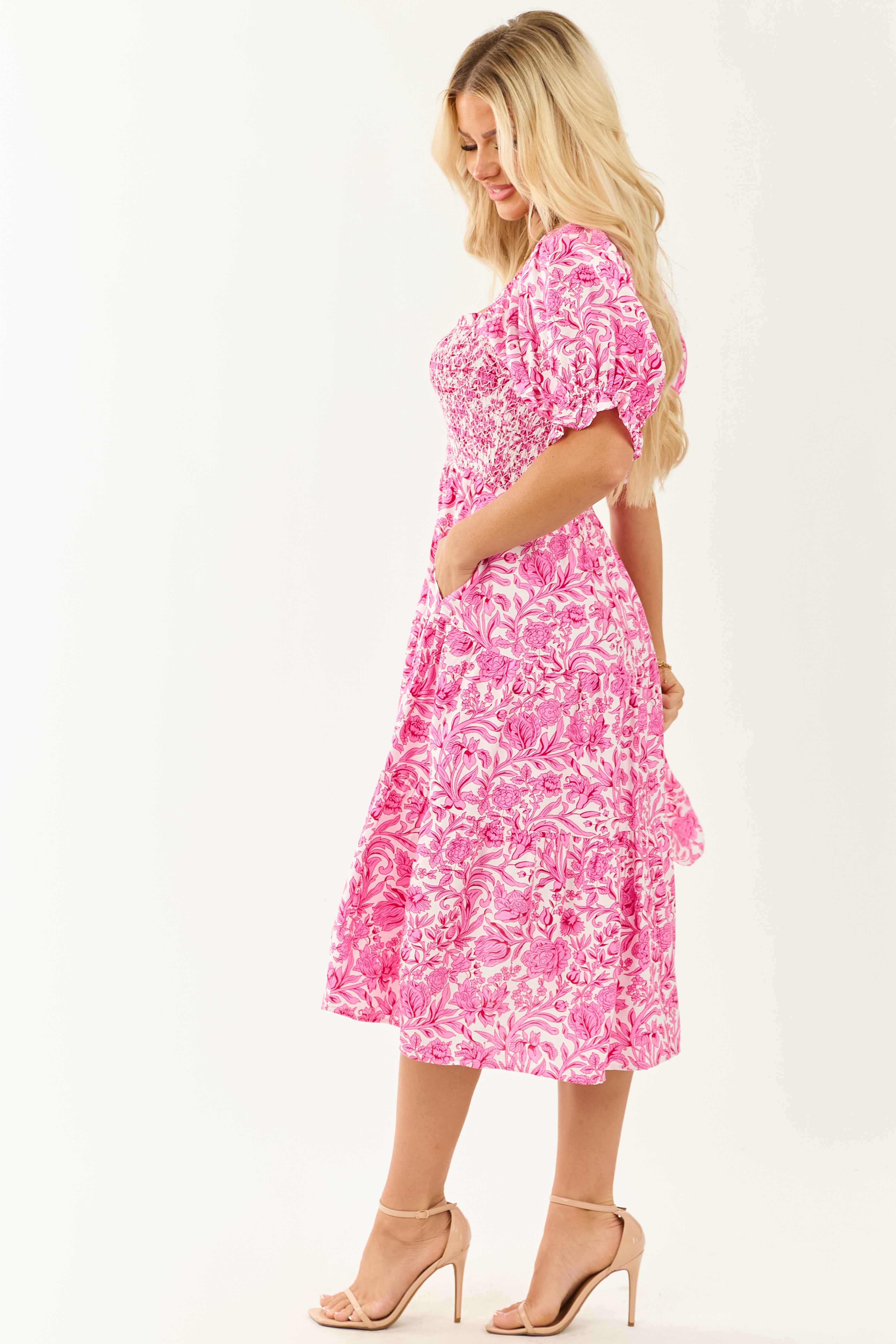 This stunning fuchsia midi dress boasts a flattering smocked bodice, romantic half sleeves, and a tiered skirt in vibrant floral hues of Fuchsia, Raspberry, and Ivory. Crafted from 100% Polyester with a lining of 97% Polyester and 3% Spandex, this dress offers a sleek and feminine fit. Ideal for various occasions, the dress features elastic cuffs and shoulders, side pockets, and is lined for comfort. With a bust size range from 31-40 inches and a waist size range from 23-32 inches, this dress comes in sizes XS to XL, fitting true to size. Get ready to turn heads and enjoy the breezy elegance of this statement piece.