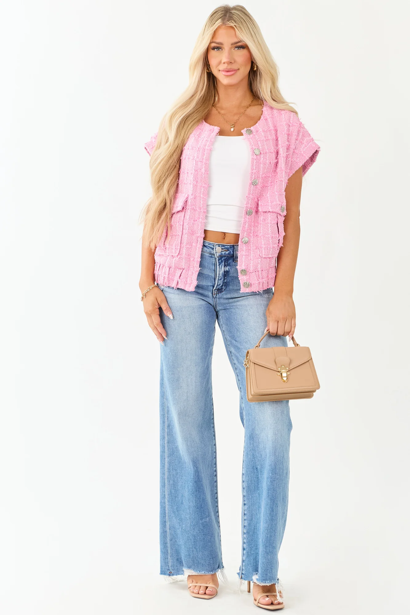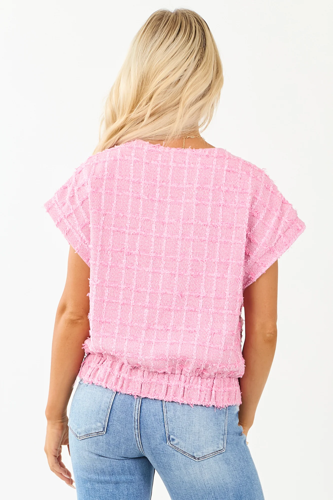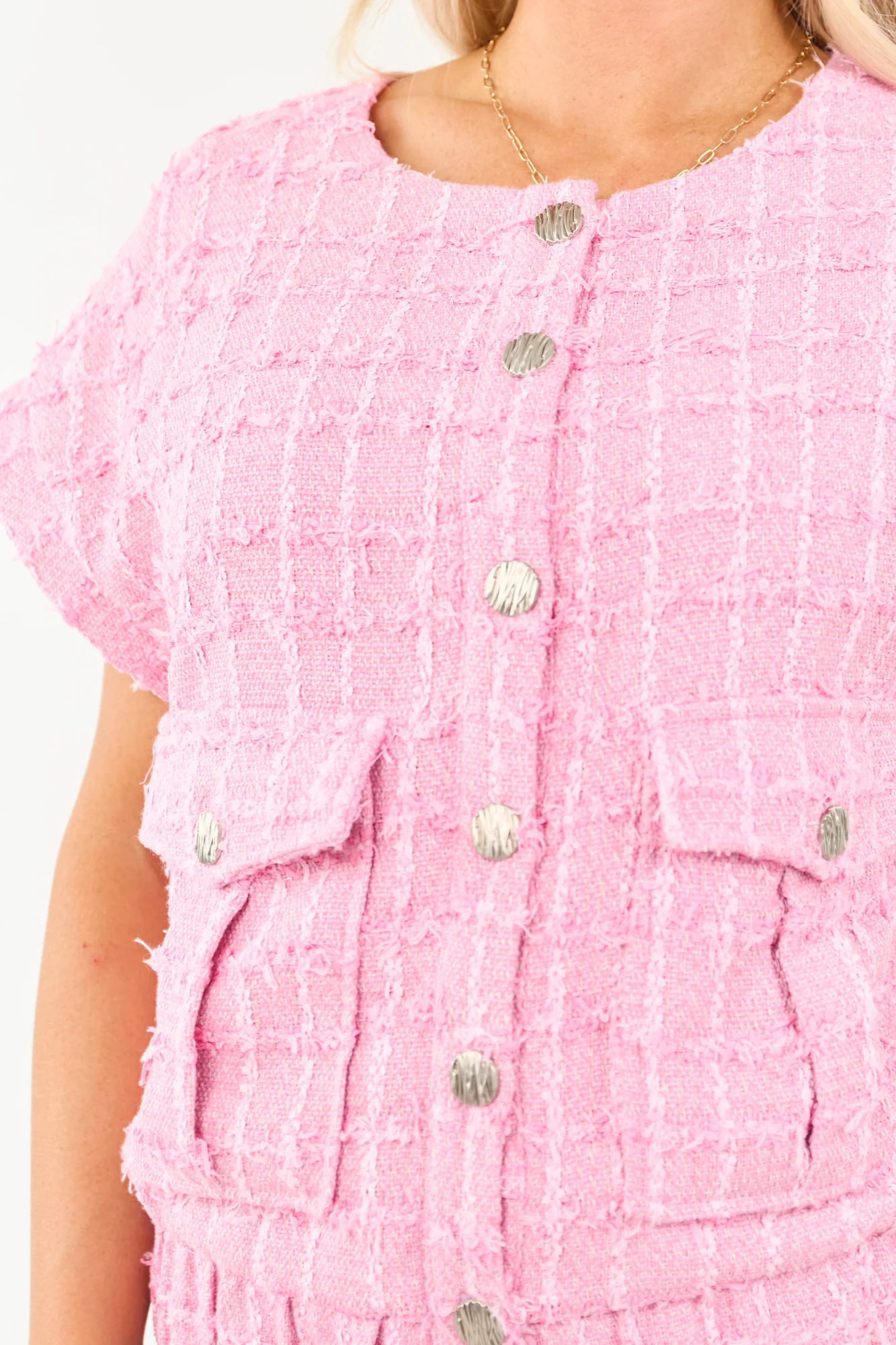 Elevate your style with our Fuchsia Tweed Short Sleeve Top featuring a modern twist on classic tweed. This cool and chic top is designed to steal the spotlight wherever you go. Crafted from non-stretchy textured tweed with elegant ivory and carnation threading details, it boasts an elastic waistband, 2 functional button-up pockets, and a comfortable lining. Step out in confidence and turn heads with this runway-ready piece. Available in sizes S, M, and L.