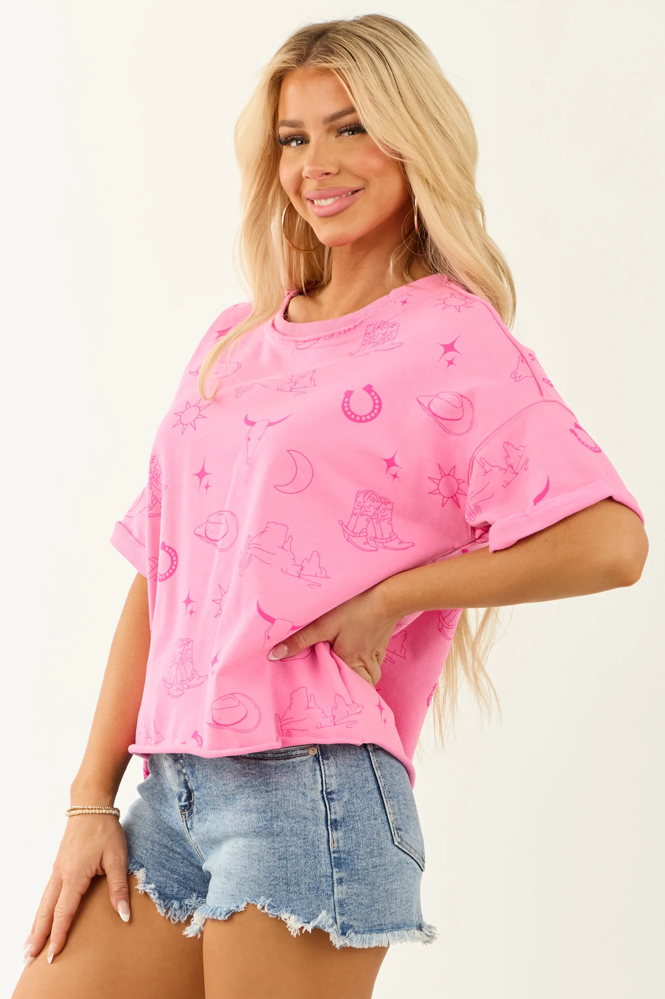 Experience cowgirl charm with a cozy twist in our Fuchsia Western Print Boxy Tee. This oversized tee features a hot pink print, banded cuffs, raw hem and seams, and a ribbed round neckline. Crafted from a blend of cotton and polyester, this tee offers both style and comfort. Please note that due to the unique print and cutting process, each piece may vary slightly. Embrace individuality with this versatile top.