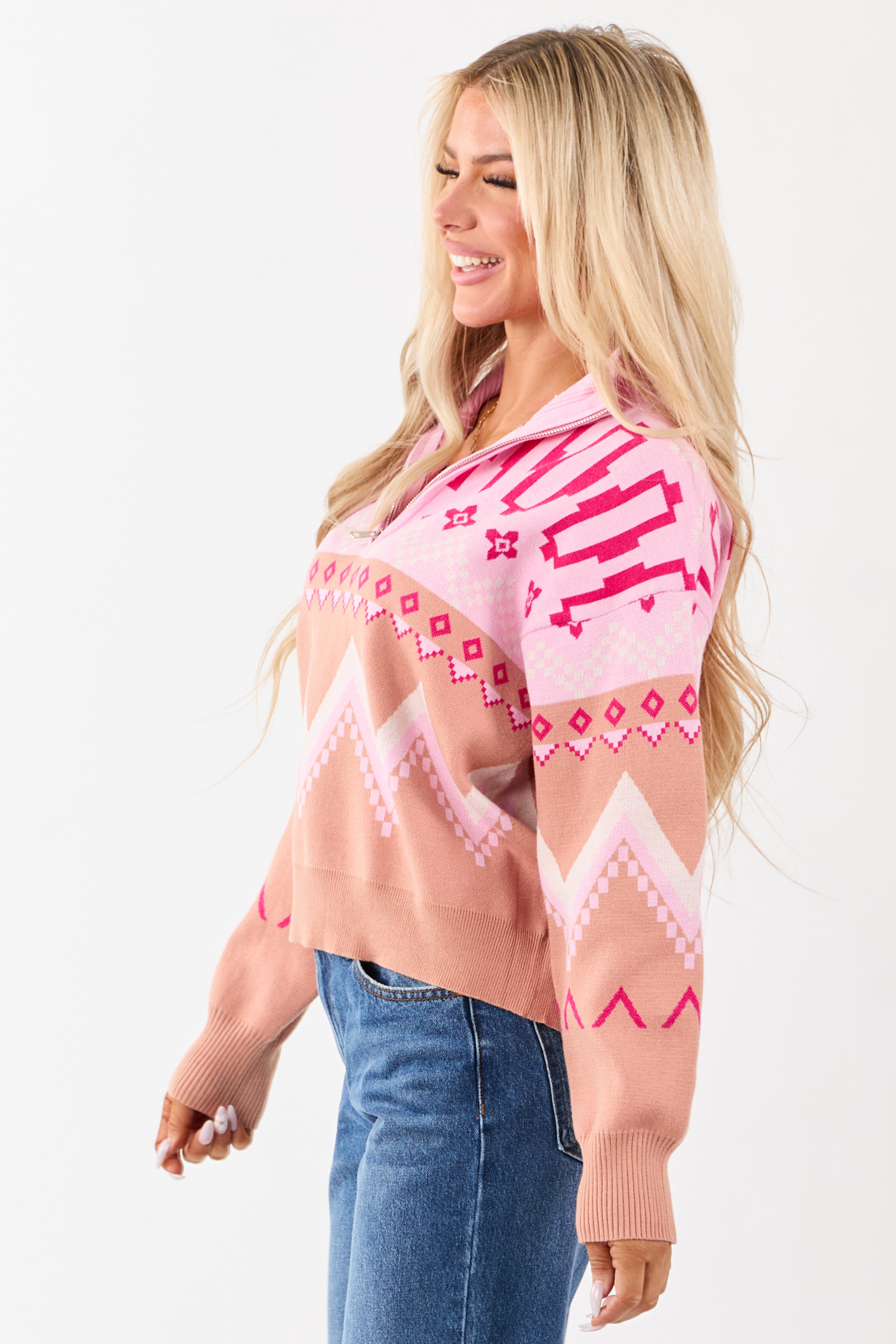 This trendy mock neck pullover sweater comes in sizes S, M, and L. Featuring a stylish geometric print in Camel, Raspberry, and Ivory colors, this sweater boasts a bold Western-inspired pattern with banded ribbed trim, drop shoulder, and stretchy knit for ultimate comfort. Made from 100% Polyester, this versatile sweater is perfect for fall and winter seasons. This relaxed fit sweater is suitable for various occasions and pairs well with different bottoms. The model is wearing a size Small and has a bust size of 35 inches, height of 57″, and waist of 26 inches.