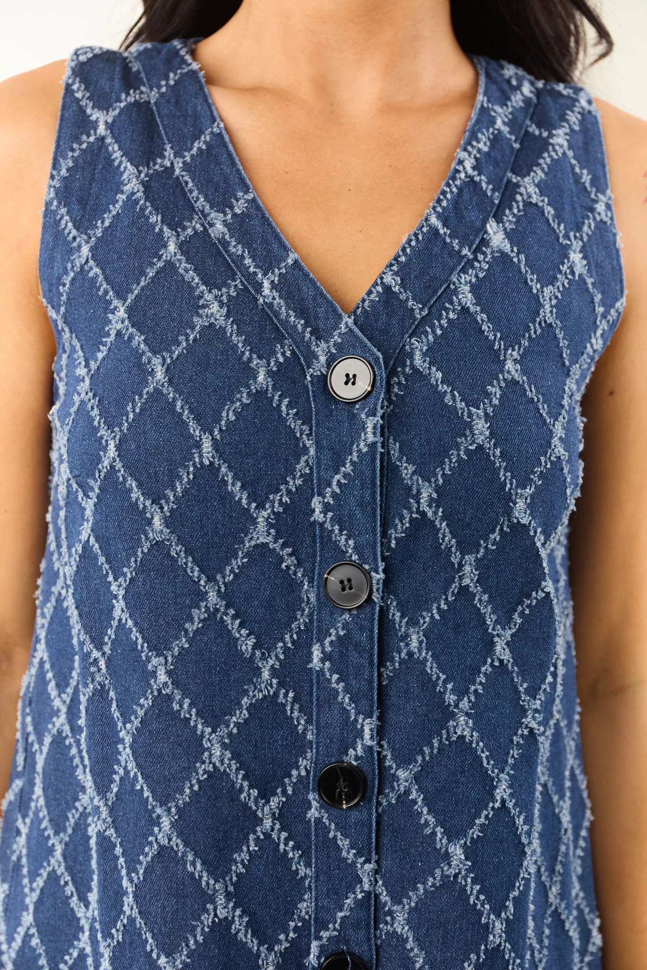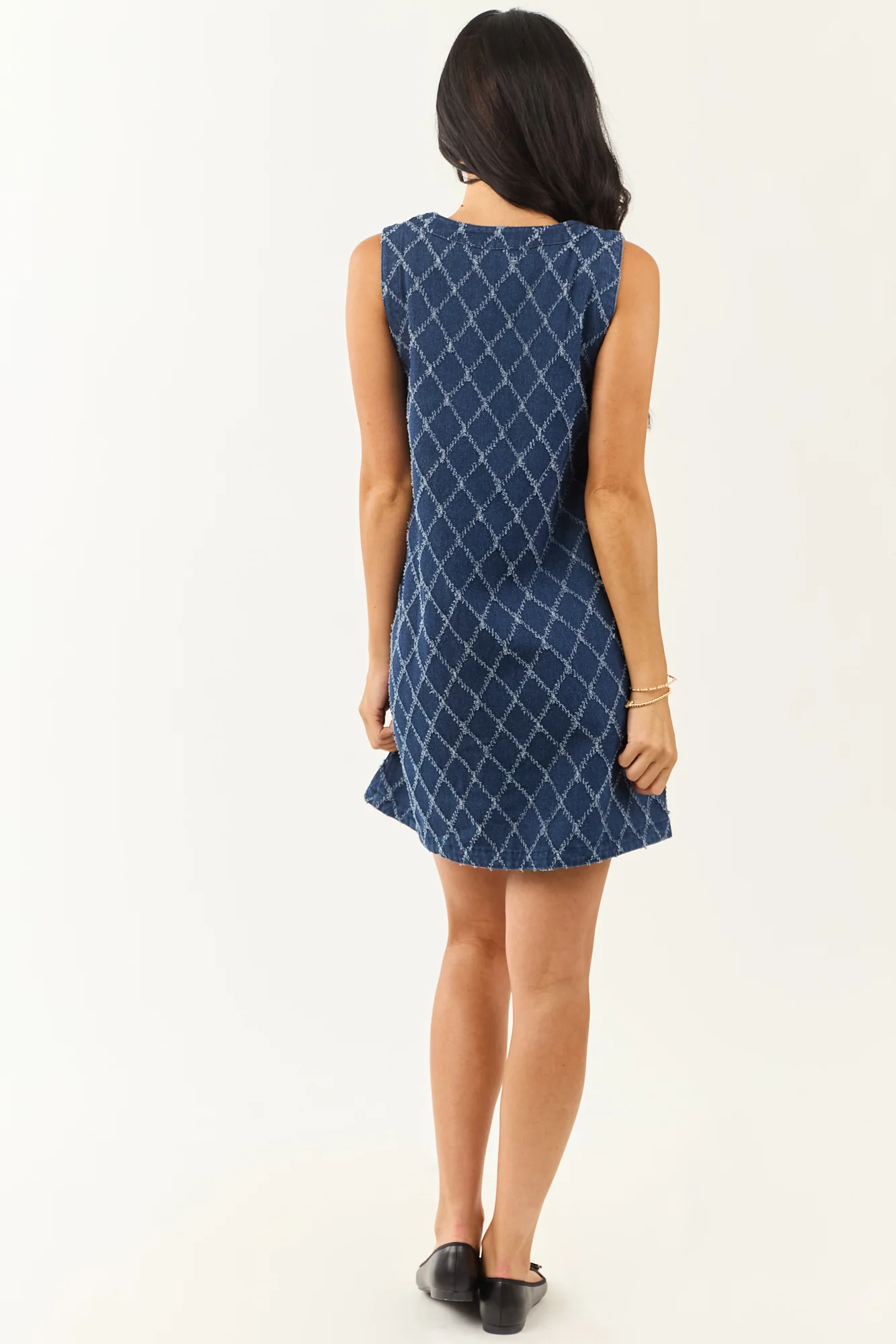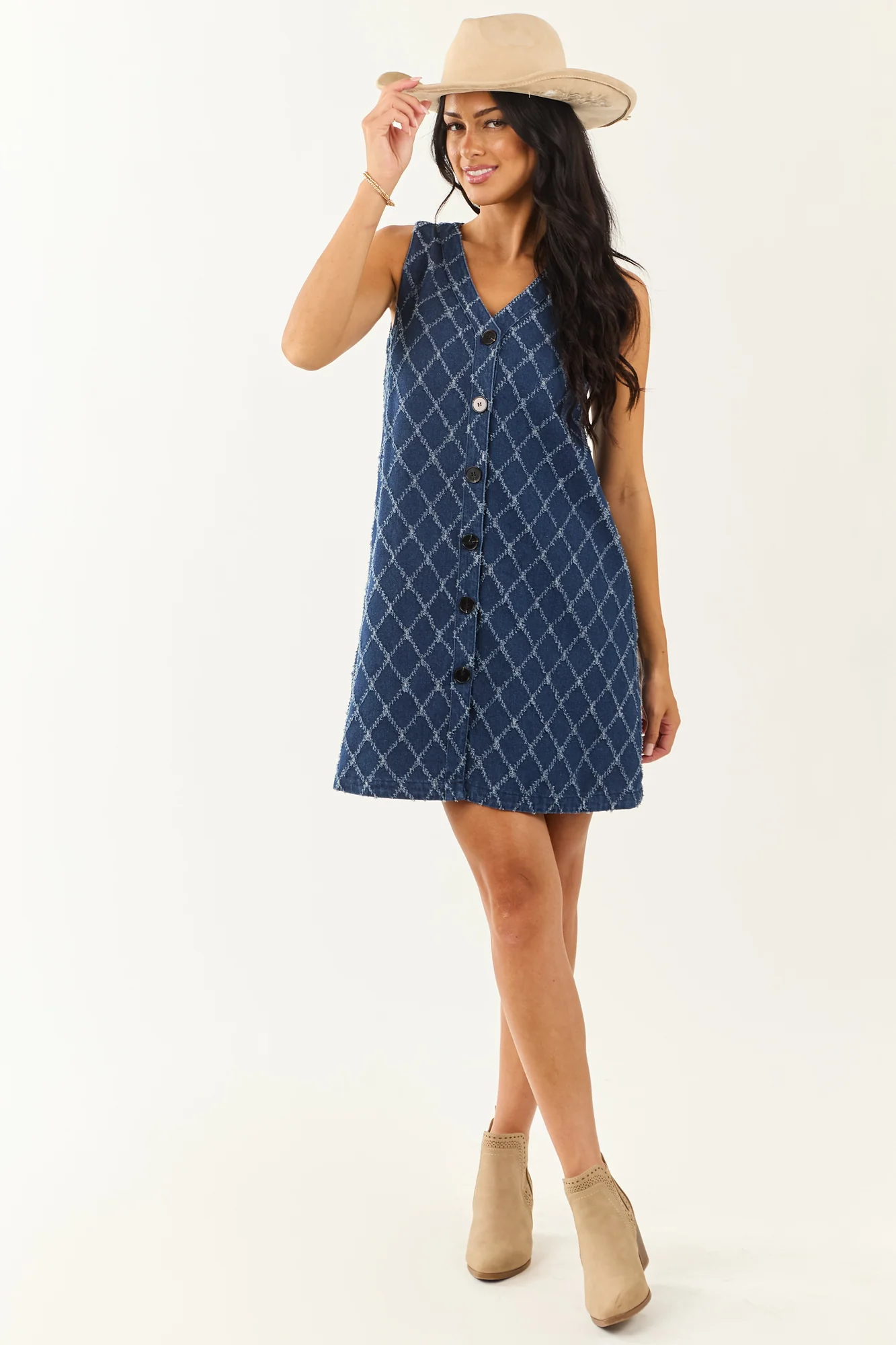 Embrace laid-back chic with our dark wash denim mini dress featuring a frayed geometric pattern. This shift-fit dress boasts a button-down front and is crafted from non-stretchy denim for a stylish look. Made of 80% Cotton and 20% Polyester, it offers a comfortable fit and is perfect for any casual occasion. Available in sizes XS to XL, with Bust sizes ranging from 31-40 inches and Waist sizes from 23-32 inches. Elevate your wardrobe with this versatile piece!