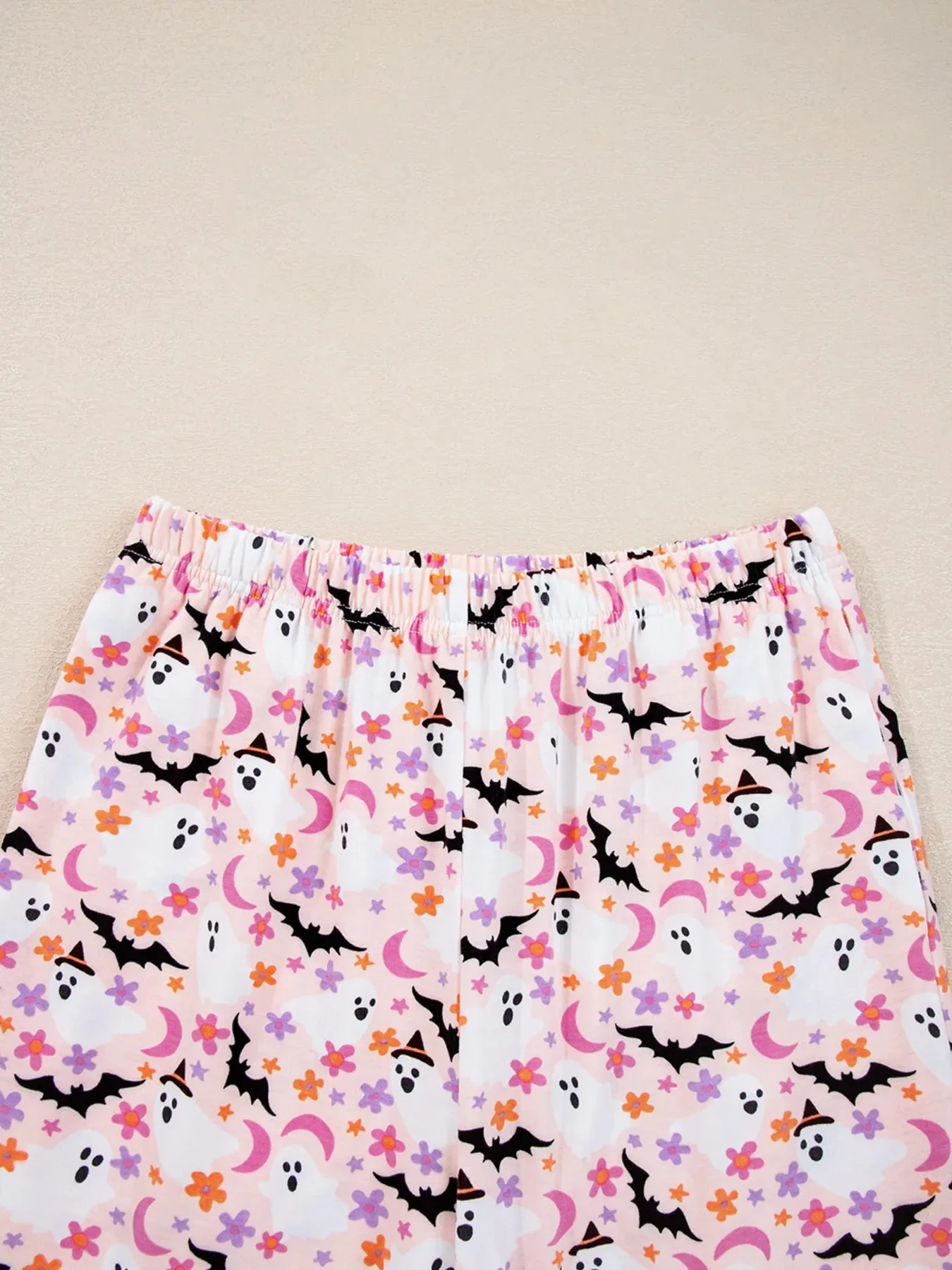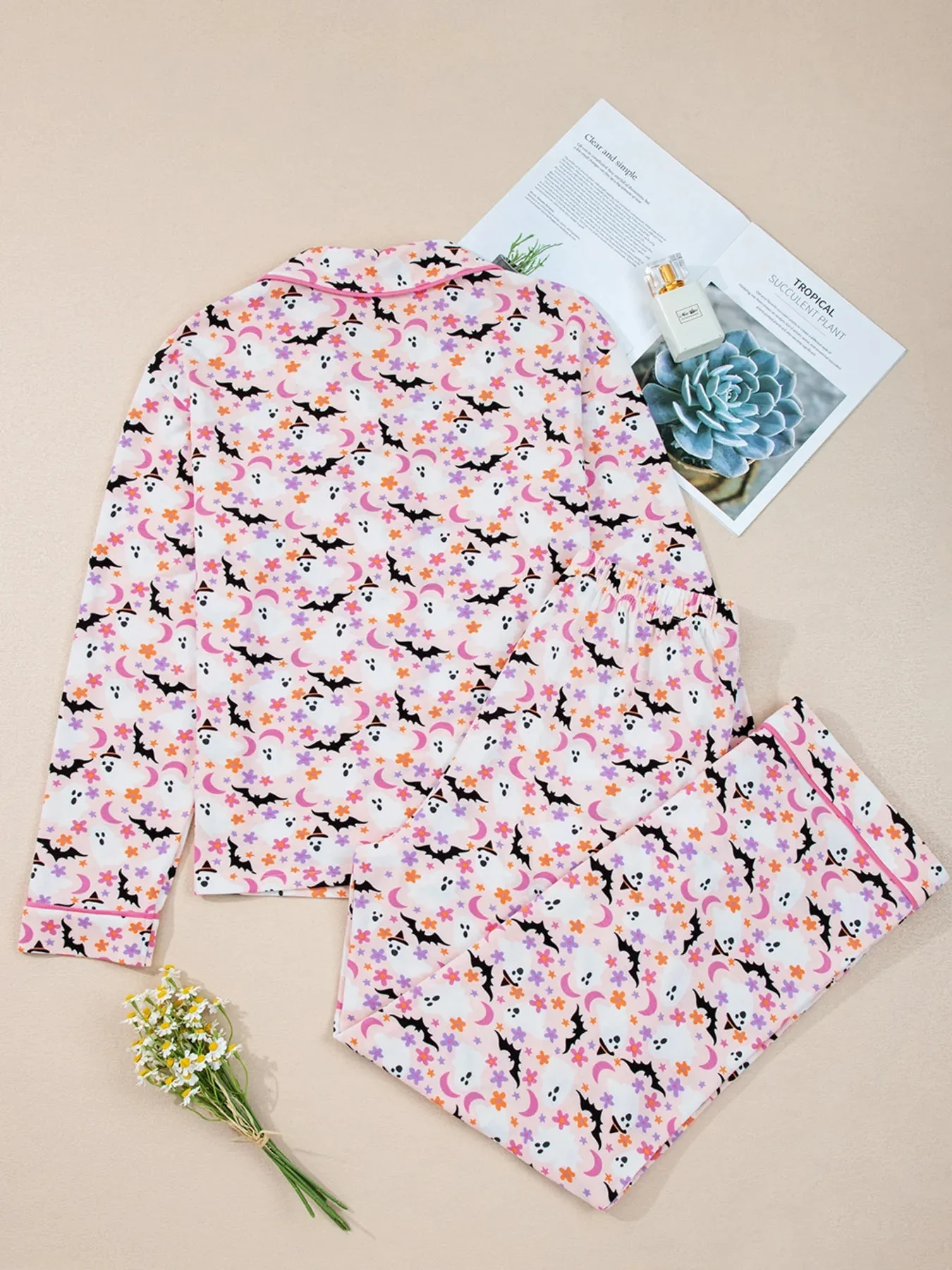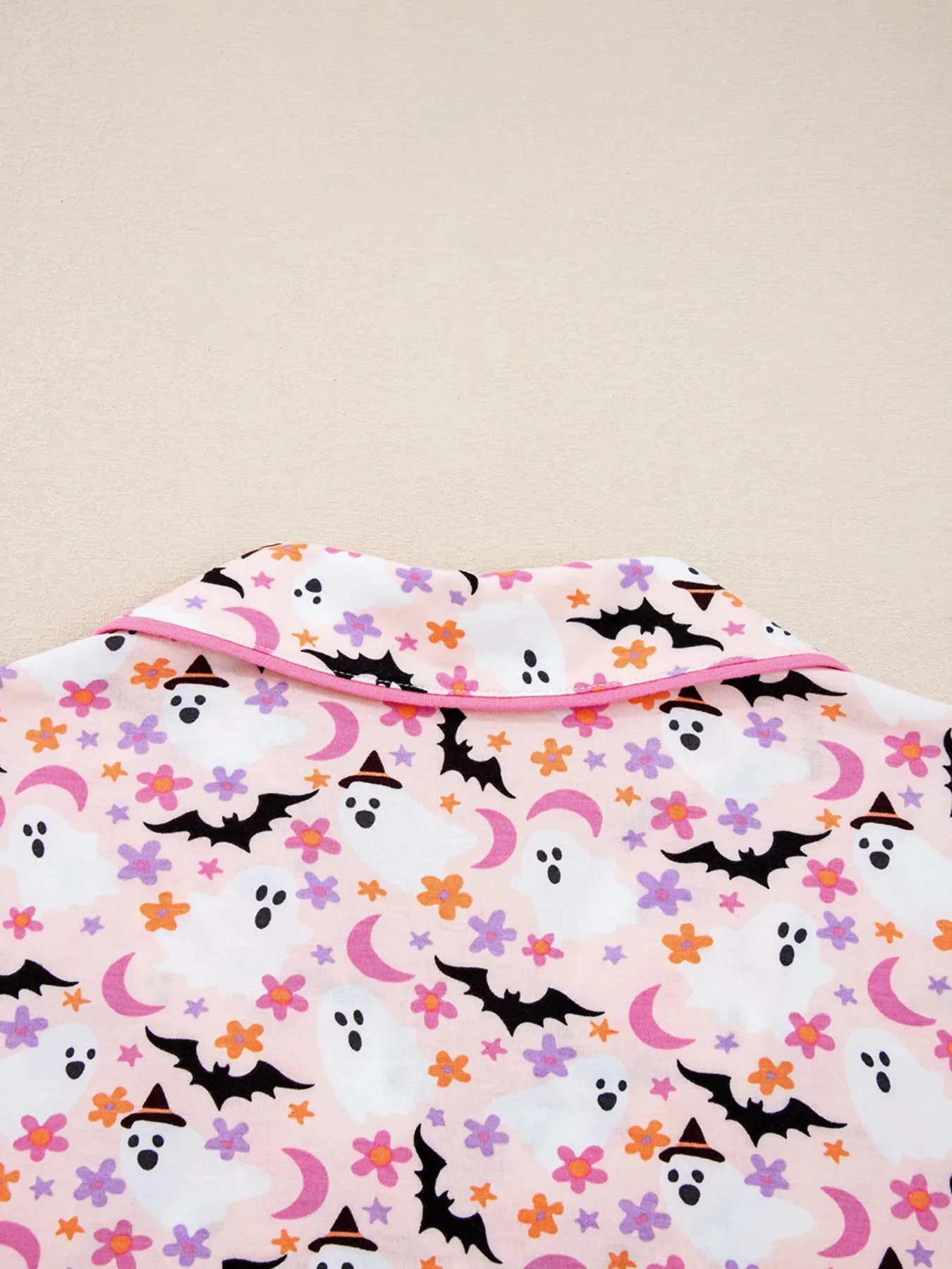 Experience ultimate comfort and style with our Ghost Print Lounge Set featuring a button-up top and pants. Crafted with 95% Polyester and 5% Spandex for slight stretchiness, this two-piece set is perfect for relaxation. The top boasts pockets, while the pants offer a comfortable fit. Machine wash cold and tumble dry low for easy care. Elevate your loungewear collection with this timeless ensemble. Available in Dusty Pink color and sizes S, M, L, and XL. Embrace the spooky season in style!