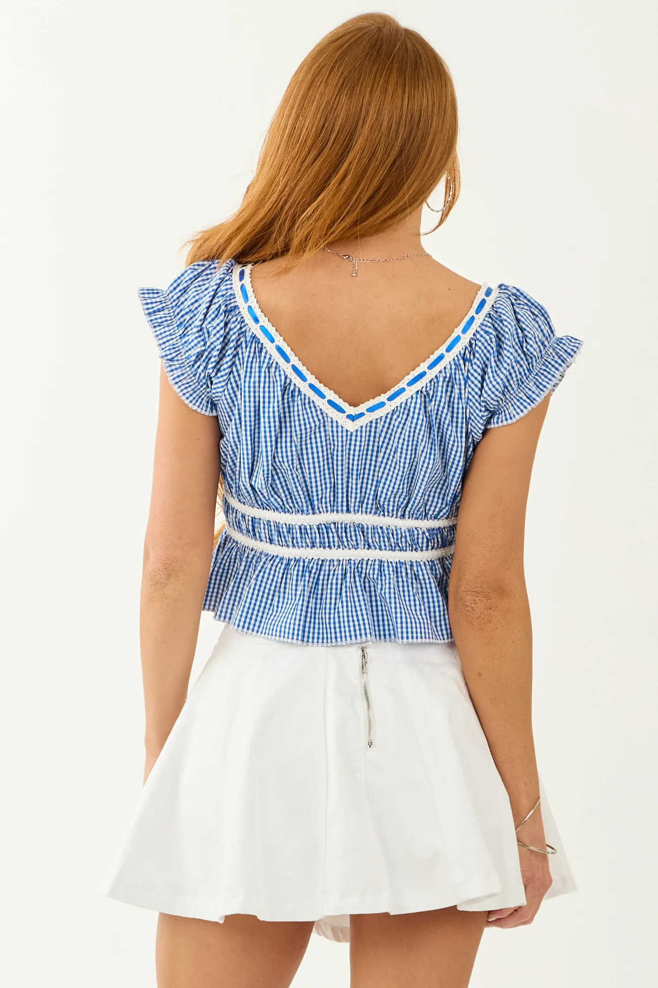 Elevate your style with this striking gingham blouse featuring a stretchy waistband, woven neckline ribbon in cobalt, lace contrast details, and a bow feature. Made of 100% Cotton with short sleeves, elastic cuffs, and a comfortable fit. Hand wash cold, lay flat to dry. Available in XS, S, M, L sizes.