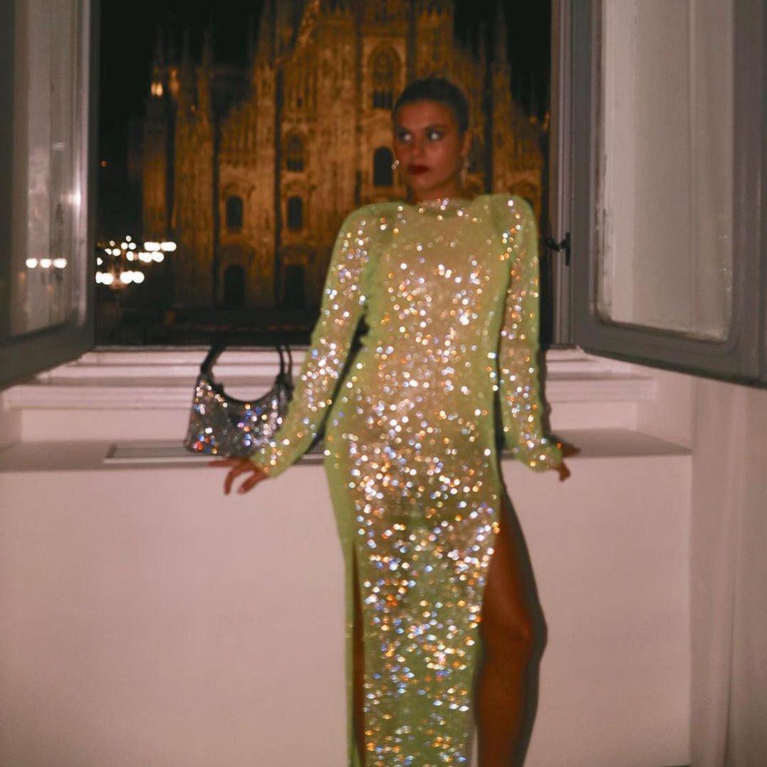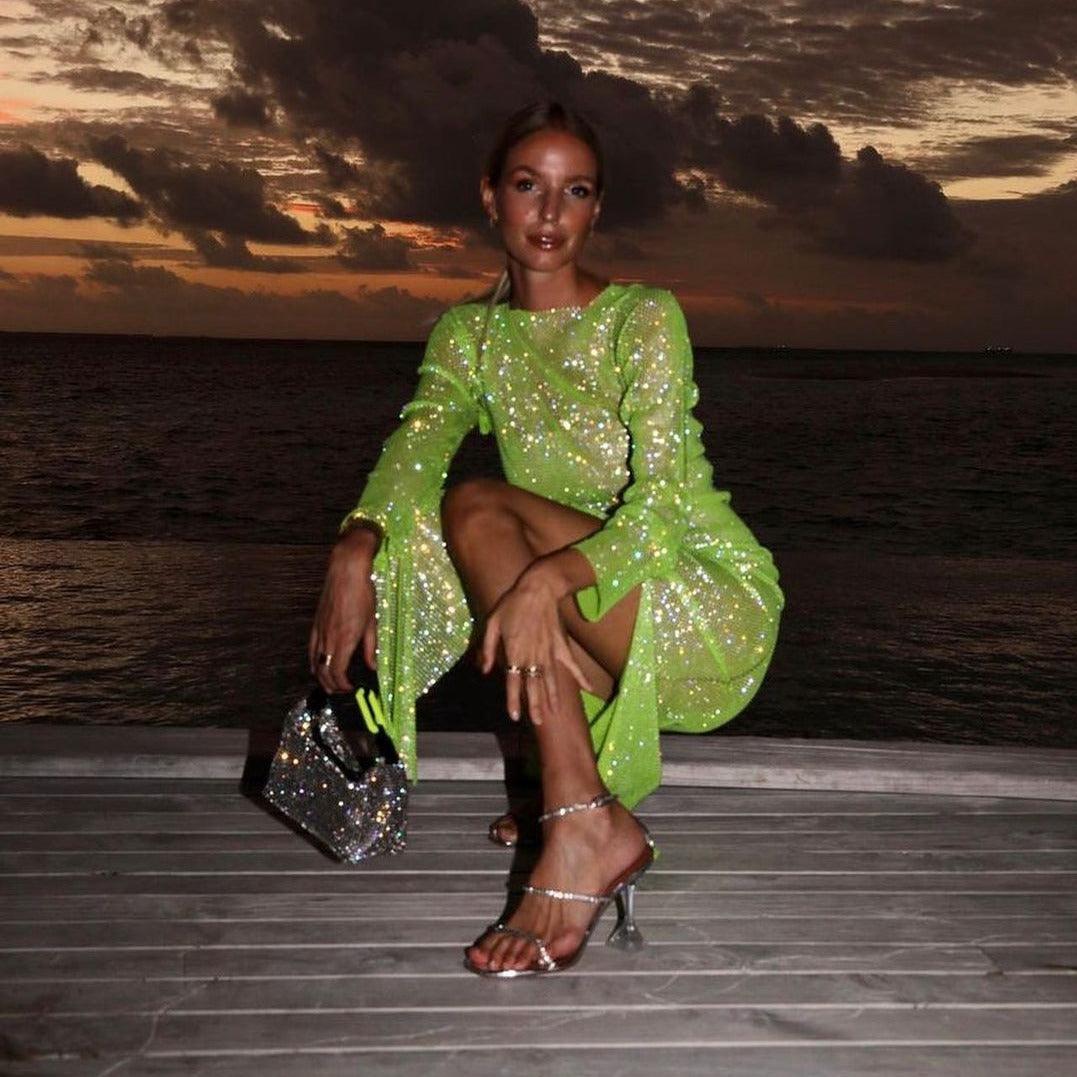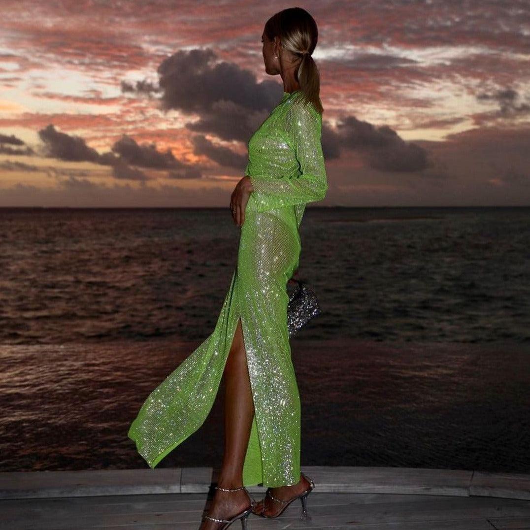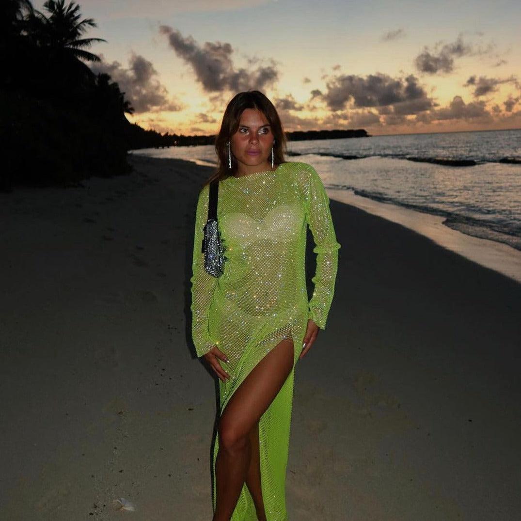 Elevate your evening look with our exquisite rhinestone midi dress exuding modern elegance and sophisticated charm. Perfect for weddings, cocktail parties, and special occasions. This open-knit fabric dress with shimmering rhinestone details and side slits enhances your every move. The tailored fit, unlined design, and 30% polyester, 50% rhinestone, 20% cotton composition offer both style and comfort. Available in vibrant shades like Hot Pink, Orange, and Light Green, its a fashion statement that demands attention. Create a stunning ensemble with clear rhinestone heels or metallic pumps. More than attire, its a style statement for elegant evening wear and standout formal occasions.