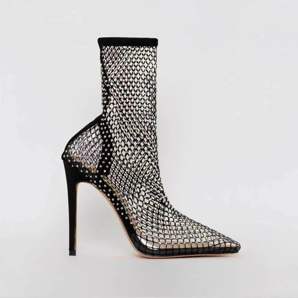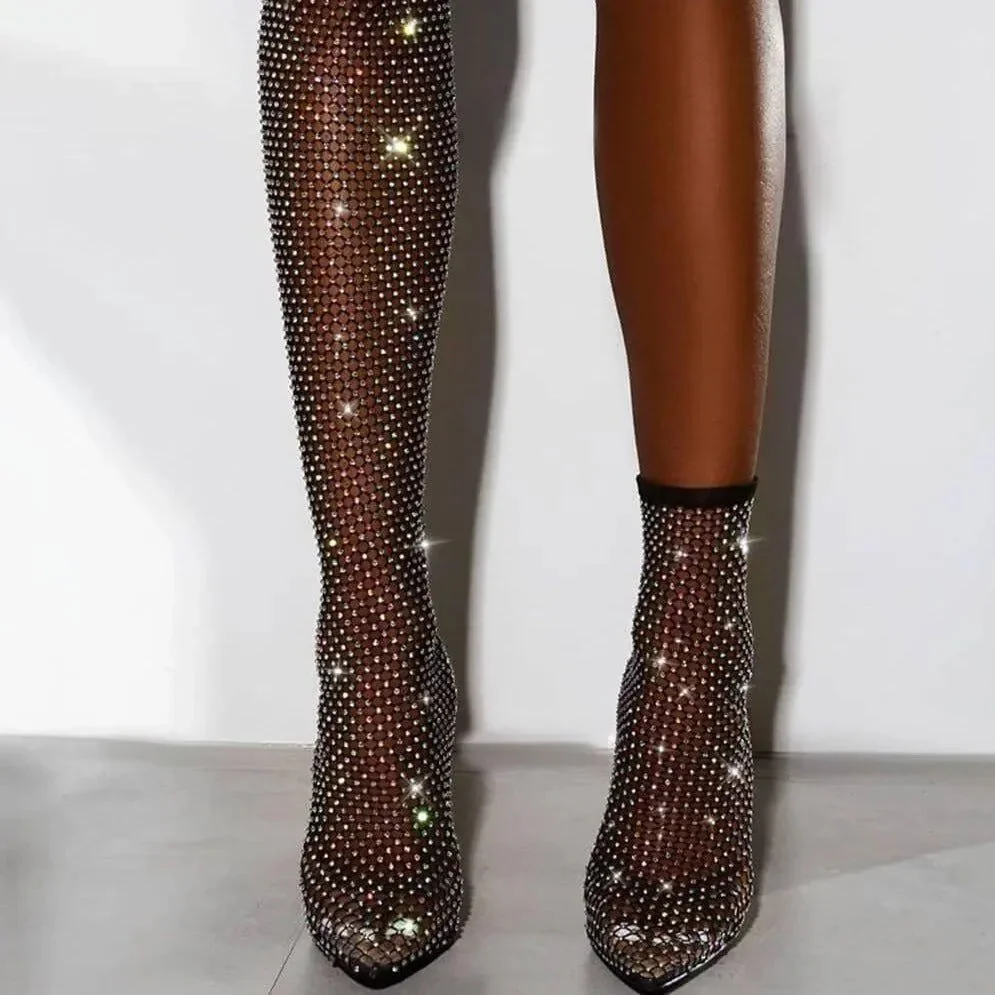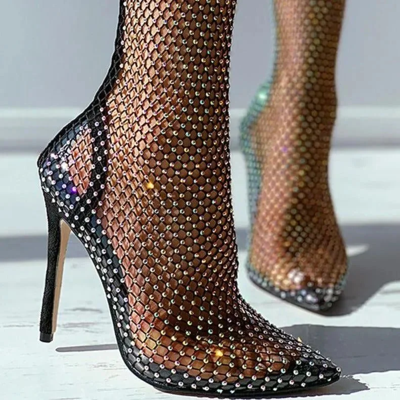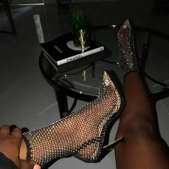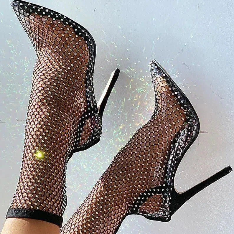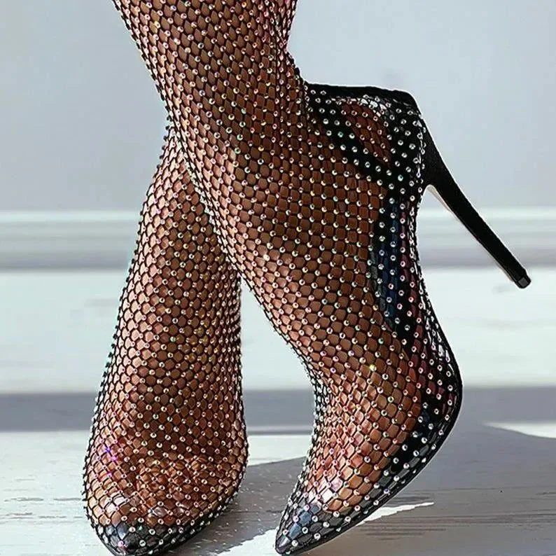 Elevate your style with our Mesh Heel Boots! These Fishnet Mesh Rhinestone Stiletto Heel Boots feature a chic design that captivates onlookers. The exquisite mesh material and sparkling rhinestones bring a touch of sophistication to any ensemble. The stylish stiletto heels elevate your appearance for any formal event. Revel in the perfect fusion of elegance and charm offered by these boots. Additionally, the open-toe silhouette ensures your pedicure is always flaunted. Dont let these gorgeous boots slip away. Purchase now and make a striking statement with each step you take. For additional fashion ideas, visit our Instagram @mermaid_way.