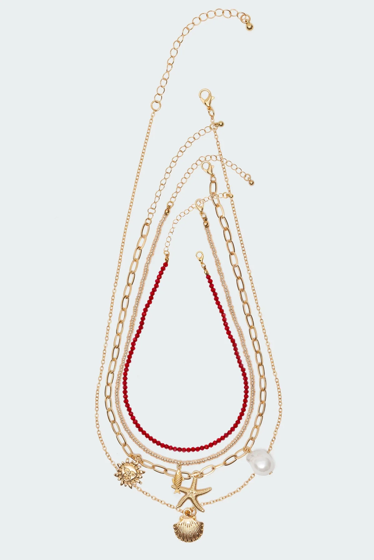Tags: Coastal Charm Necklace, Gold and Red Necklace Pack, Gold Tone Metal Necklace, Jewelry Set, Pendant Necklace