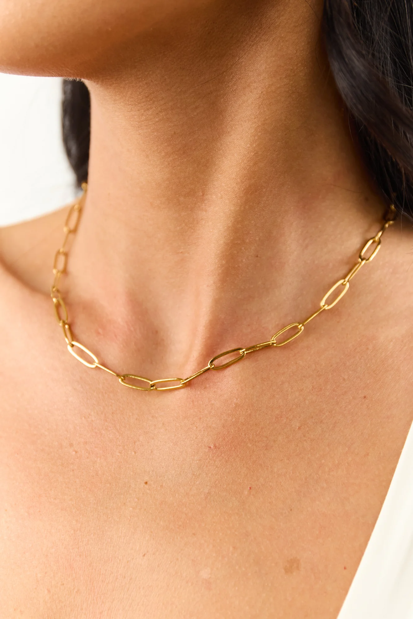 Experience elegance and style with our Gold Chain Link Necklace featuring a unique paper clip design. Crafted with high-quality materials, this necklace boasts a luxurious touch to elevate any outfit effortlessly. The lobster clasp closure ensures secure wearing. Circumference: 15 inches with a 2-inch extension. Imported for exceptional craftsmanship.