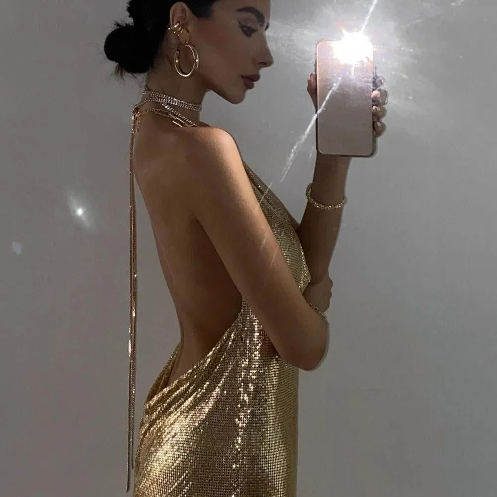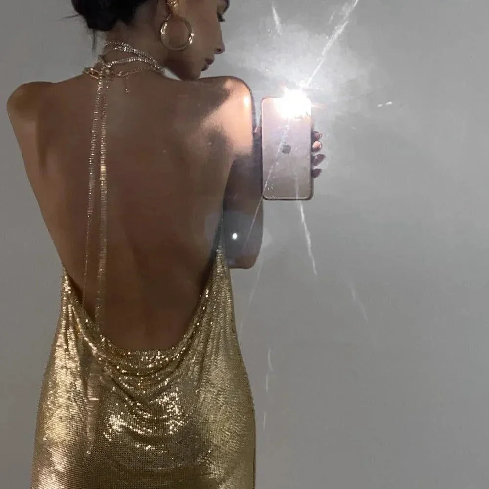 Indulge in the allure of our breathtaking Gold Chainmail Mini Dress that exudes shimmer and elegance. This glamorous piece with a fitted silhouette impeccably accentuates your curves. Designed for comfort and style, it features a high neckline and a discreet back zip for a perfect fit. The lightweight fabric gracefully flows as you move, perfect for dancing and social occasions. Transition effortlessly from day to night with this versatile stunner that guarantees to captivate attention. Explore more fashion inspiration on our Instagram @mermaid_way. FEATURES: Cowl neckline; non-adjustable. Fabric has minimal stretch. Care Instructions: Cold hand wash. Please handle this delicate handmade aluminium fabric garment with care. Size exchange offered if fit is not as expected.