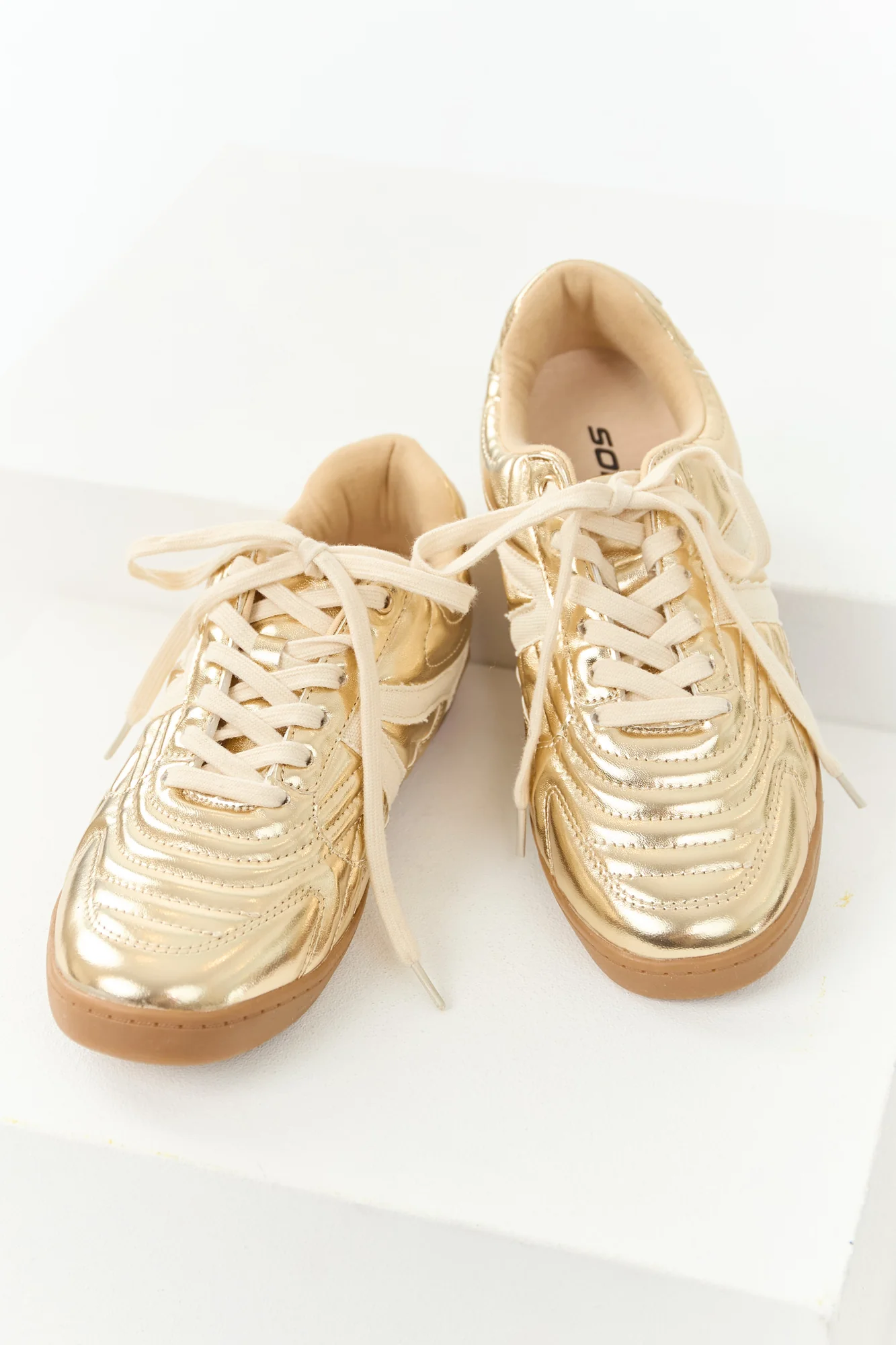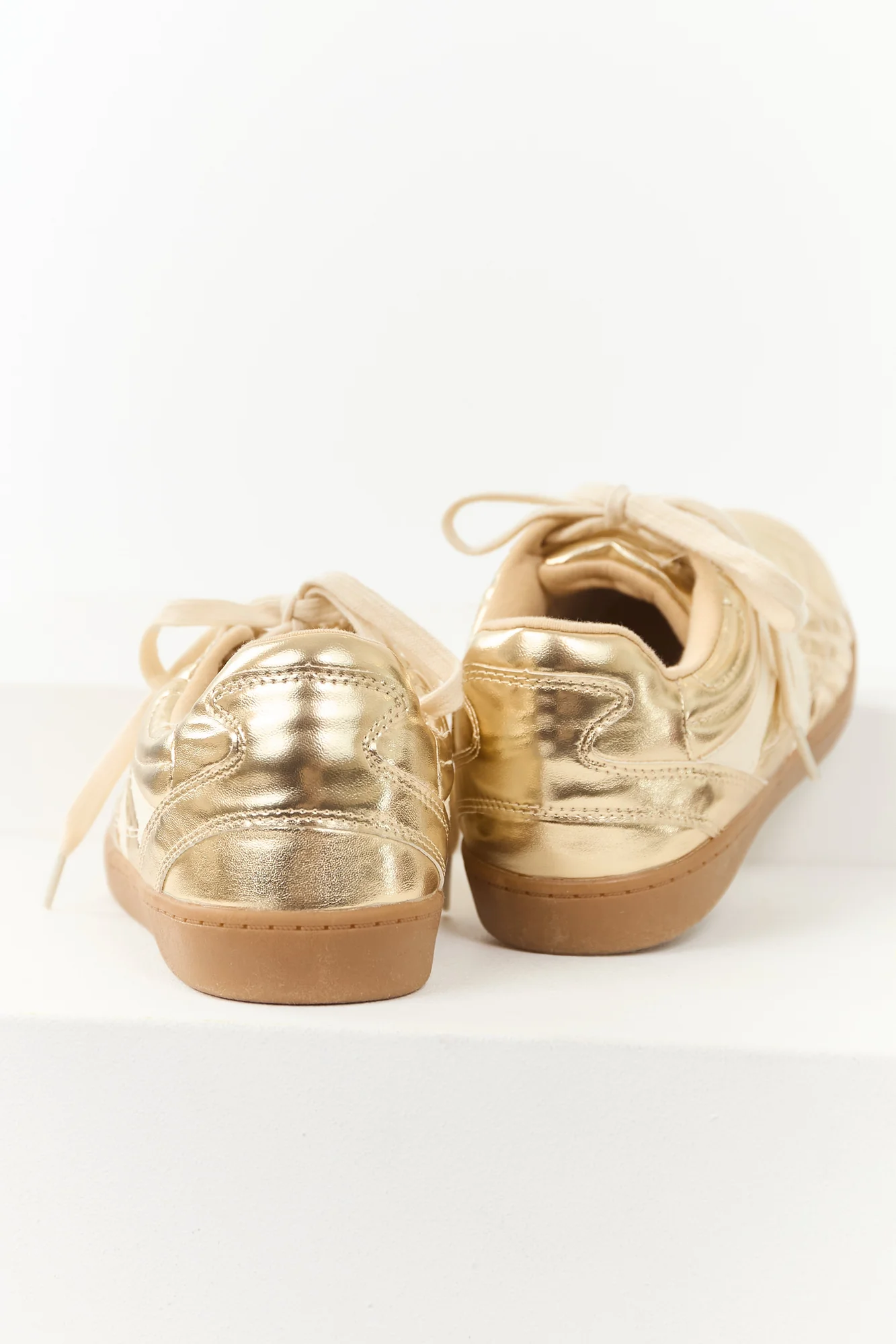 Step up your shoe game with these gold faux leather lace-up low top sneakers for women. Designed for comfort and style, these sneakers feature a beige fabric contrast detail and a contrast rubber sole. Enjoy a lightly cushioned insole and a 1″ platform height. With a circumference of 11″, these imported sneakers are a versatile addition to your wardrobe. Whether its fall, spring, summer, or winter, these sneakers will elevate any outfit. Available in sizes 6 to 11.