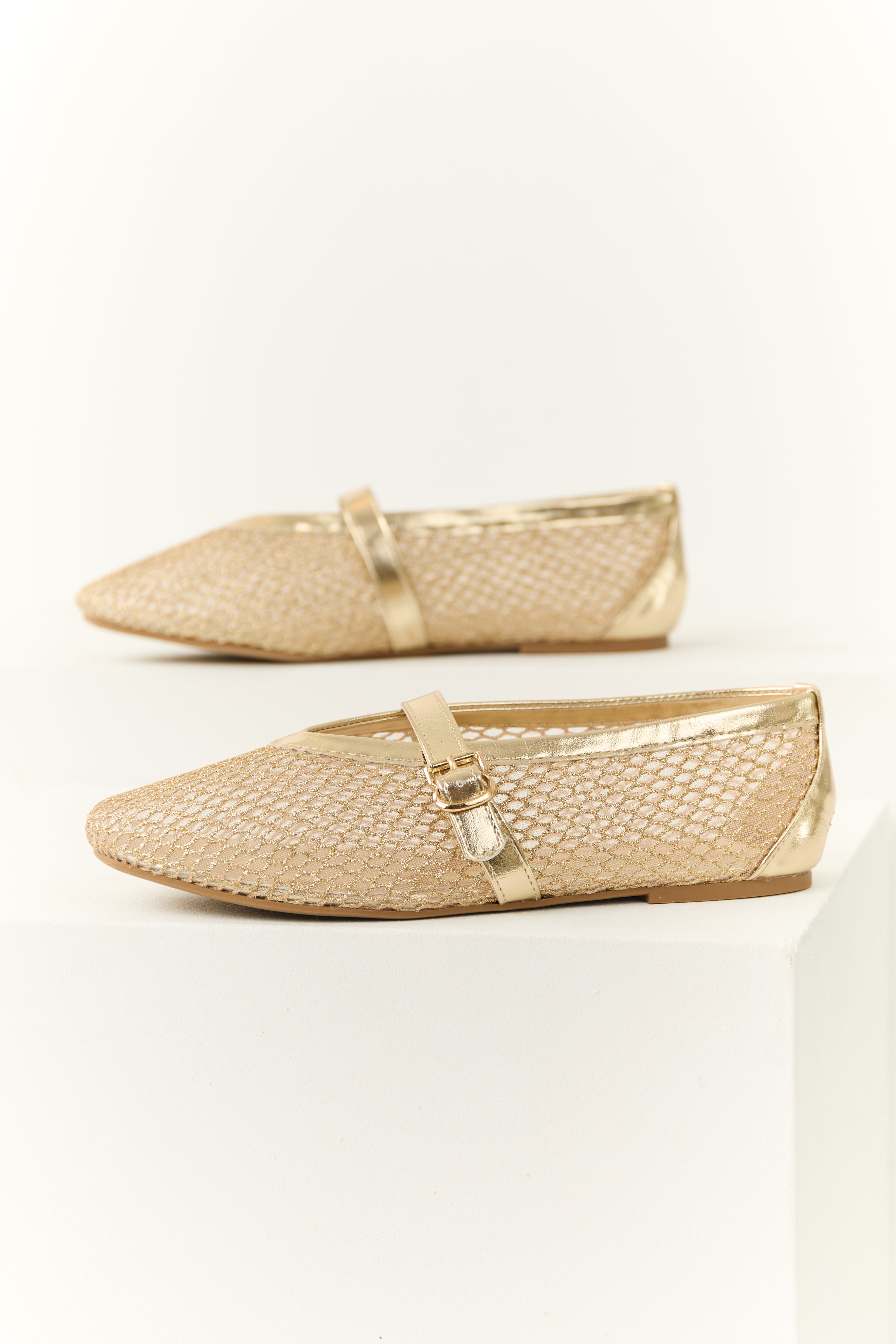 Step out in style with these chic Gold Mesh Flats featuring a unique Geometric Design. Made of non-stretchy mesh and patent faux leather, they offer a comfortable fit with an adjustable buckle strap and slightly cushioned insole. Perfect for casual or daytime wear during Fall and Winter seasons. Imported. Circumference: 14 inches. Available in various sizes.