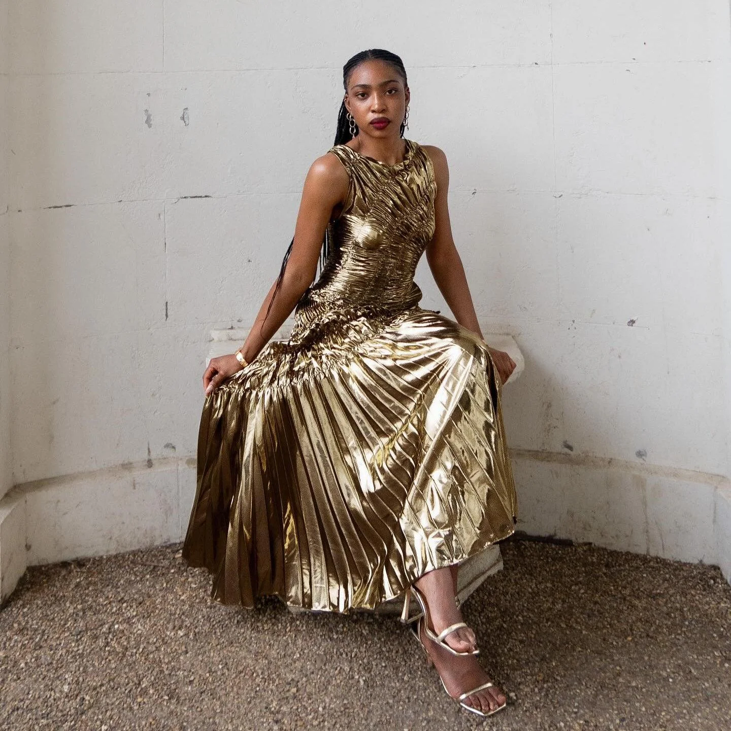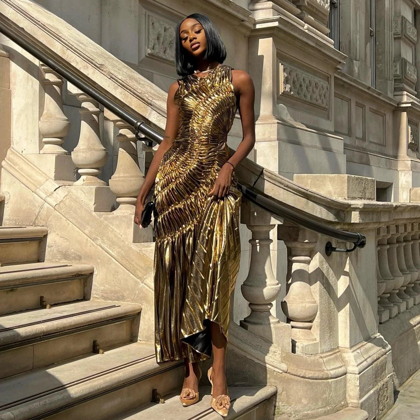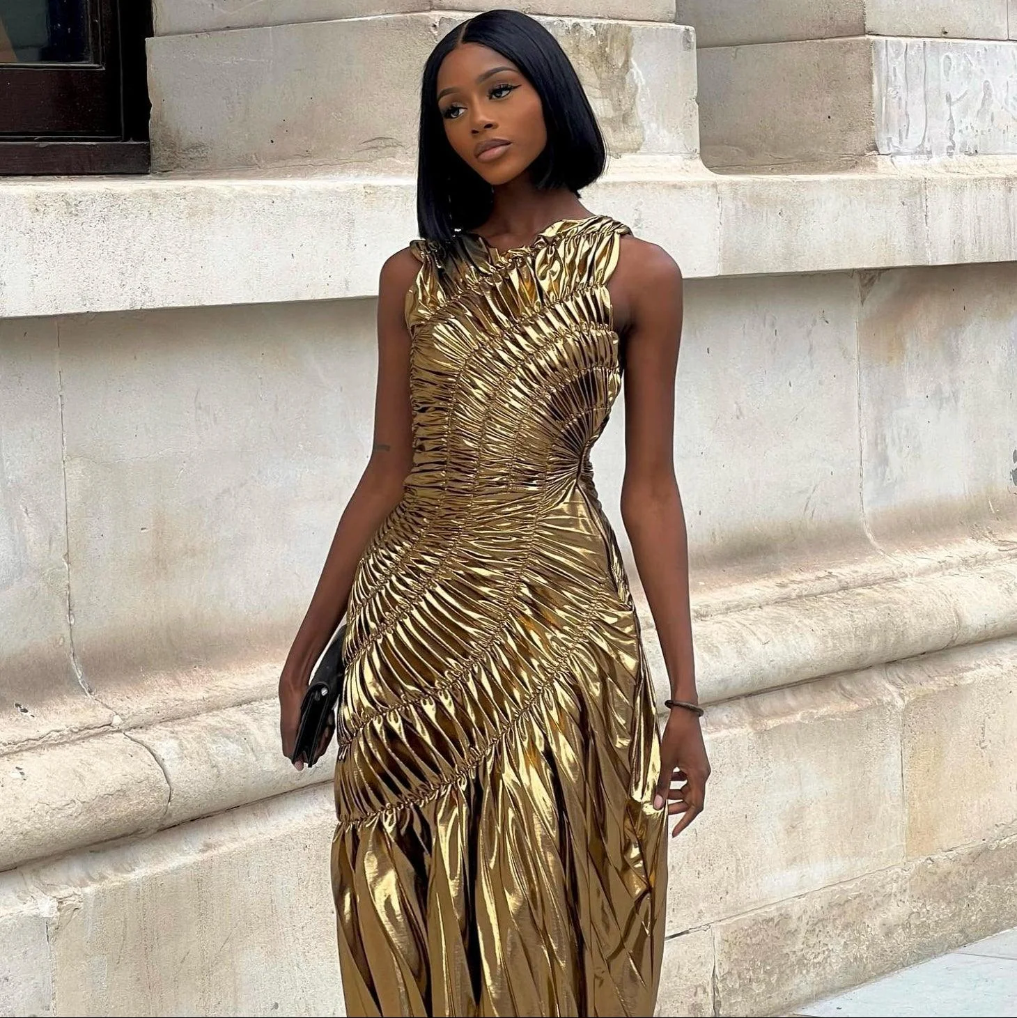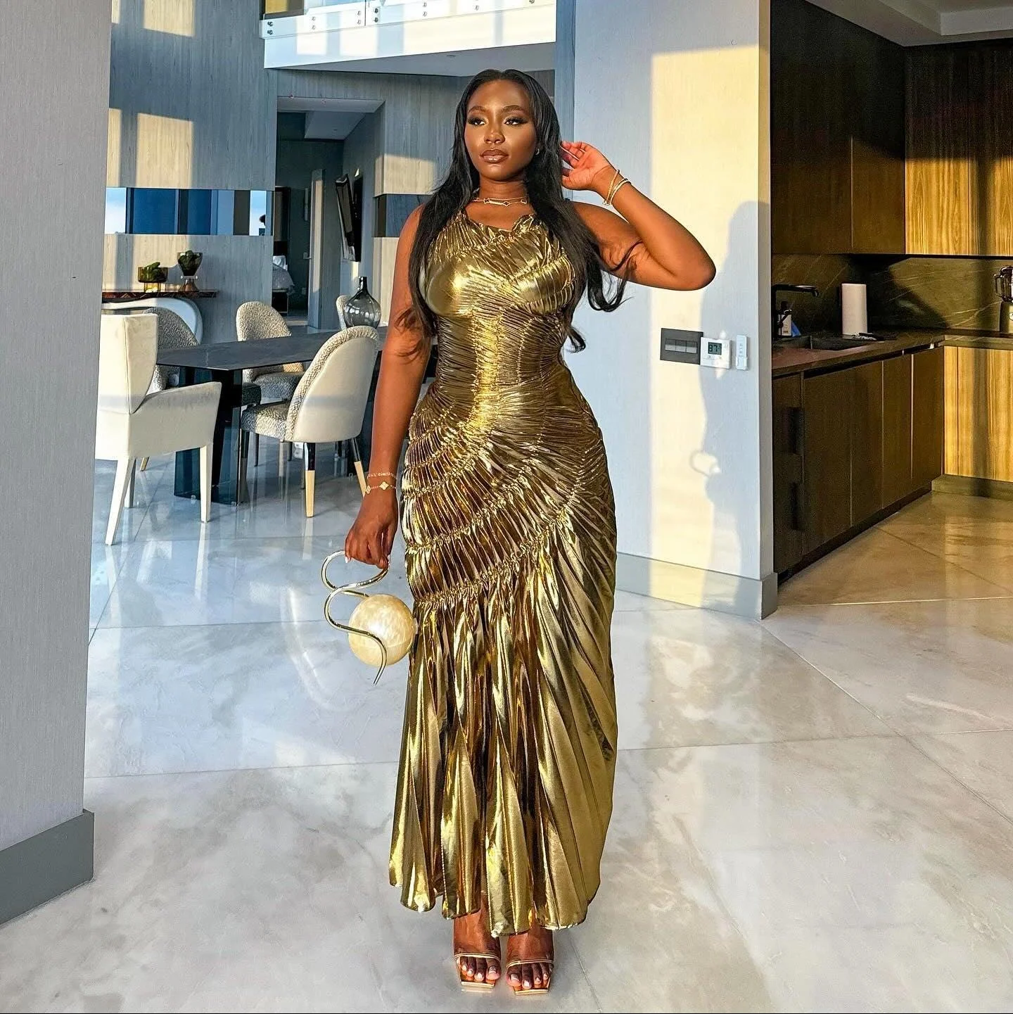 Elevate your style with our Gold Metallic Pleated Maxi Dress. Youll dazzle in the mesmerizing metallic sheen, while the fitted bodice and pleated skirt enhance your curves and add flowy elegance. Perfect for formal events or gala nights, this sleeveless dress exudes sophistication and confidence. Pair with statement heels for a bold finish! Enjoy a complimentary exchange for size adjustments. Find styling tips on Instagram @mermaid_way.