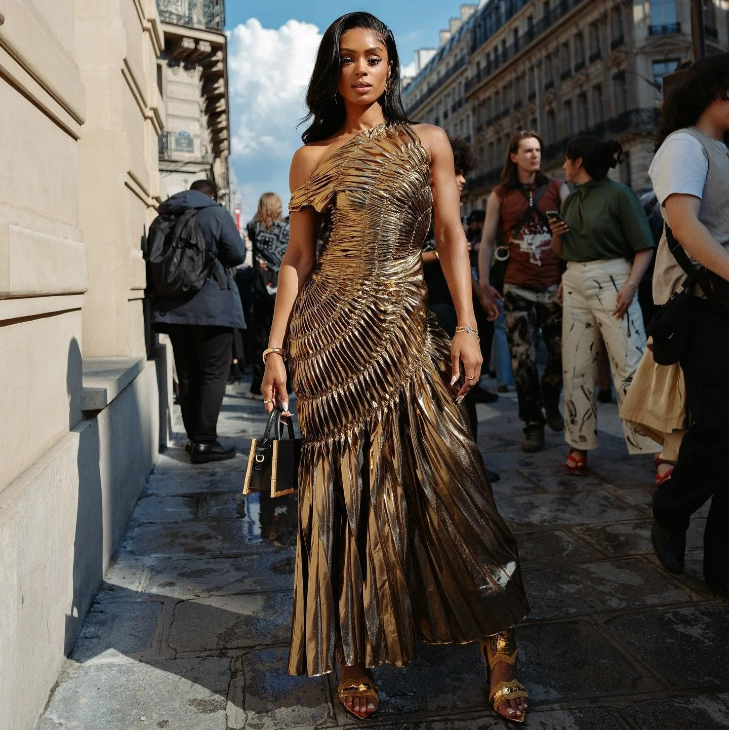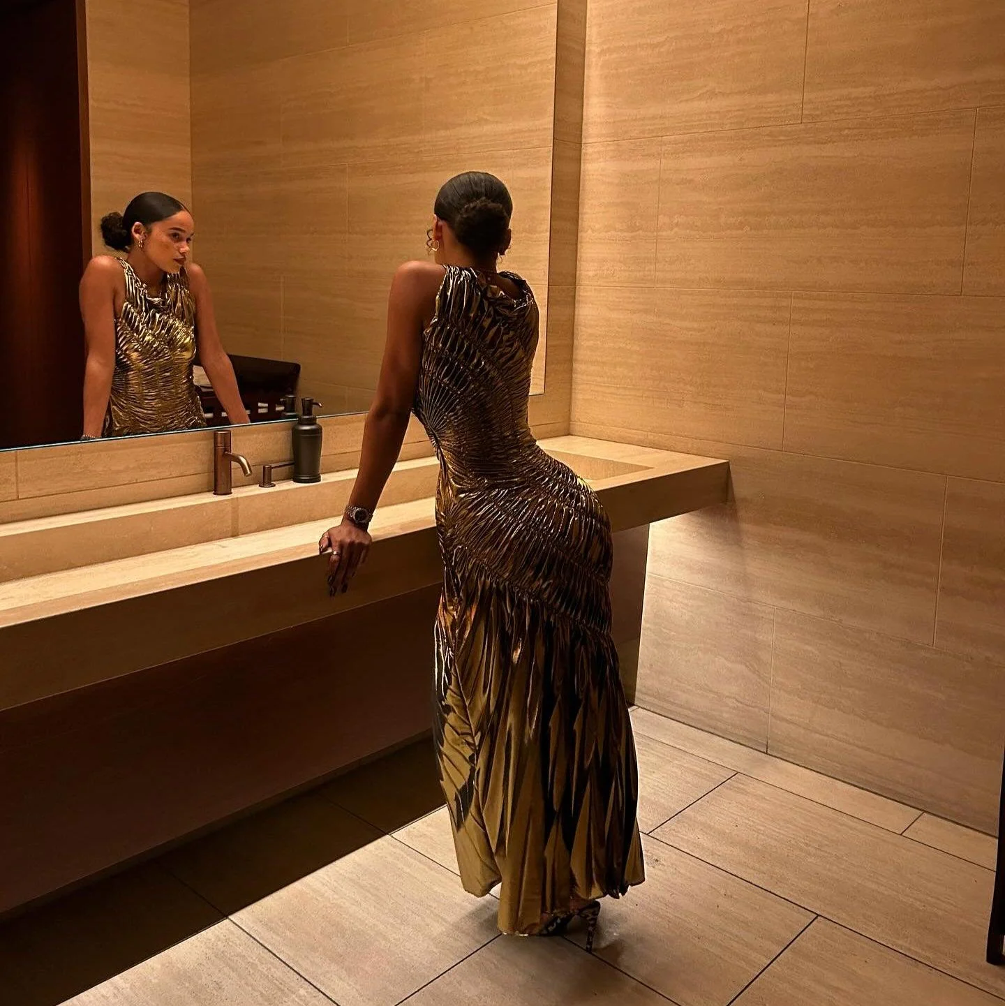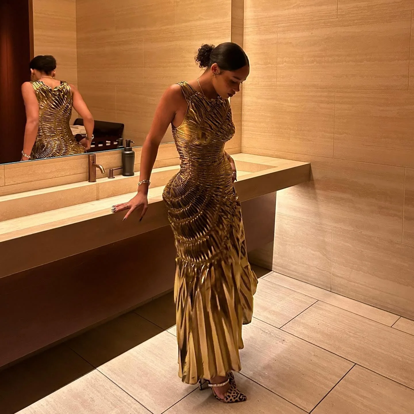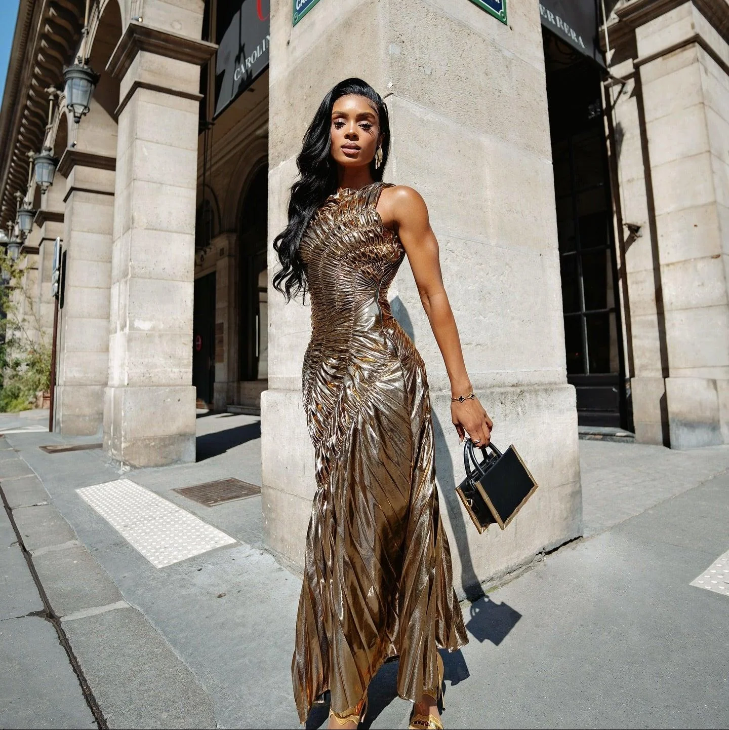 Elevate your style with our Gold Metallic Pleated Maxi Dress. Youll dazzle in the mesmerizing metallic sheen, while the fitted bodice and pleated skirt enhance your curves and add flowy elegance. Perfect for formal events or gala nights, this sleeveless dress exudes sophistication and confidence. Pair with statement heels for a bold finish! Enjoy a complimentary exchange for size adjustments. Find styling tips on Instagram @mermaid_way.