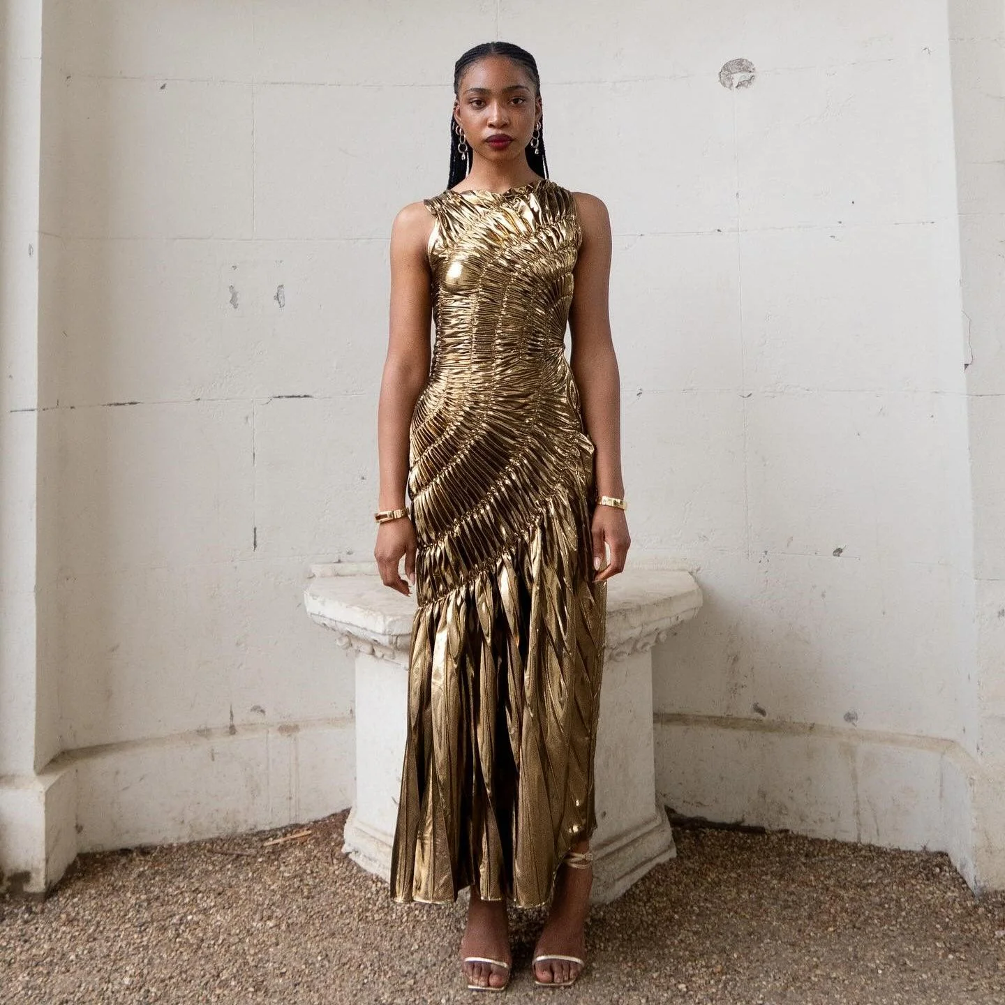 Tags: formal dress, Gala Night Dress, gold dress, metallic dress, Pleated Dress