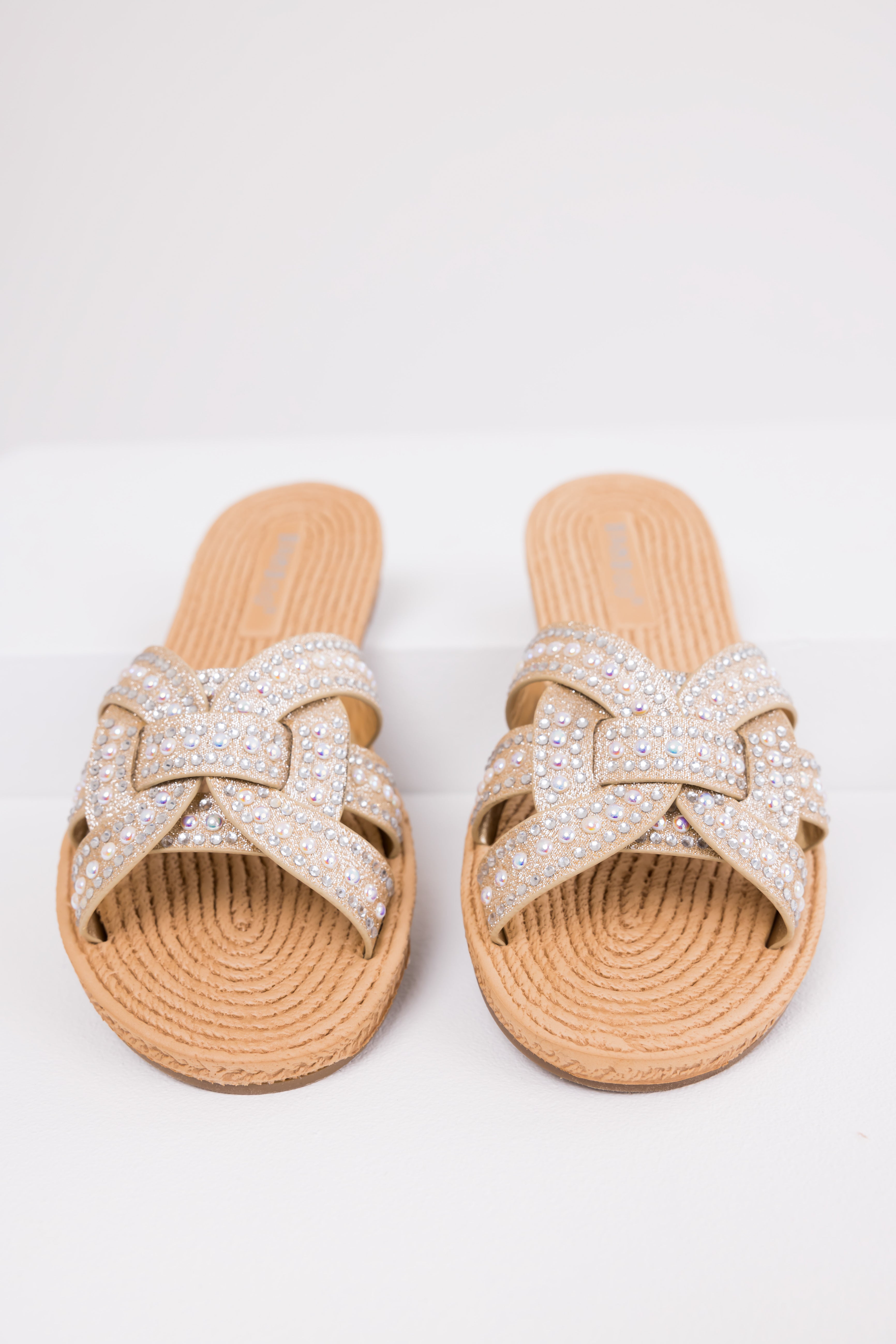 Step into luxury with our elegant Gold Rhinestone Twisted Strap Sandal Flats for women. These slide-on sandals feature an open toe design, a cushioned insole for all-day comfort, dazzling silver sequins, and a braided sole. With a practical heel height of 0.75 inches and a platform of 0.45 inches, these sandals are as stylish as they are comfortable. The straps measure 3.75 inches with a circumference of 6 inches. Imported and available in various sizes.